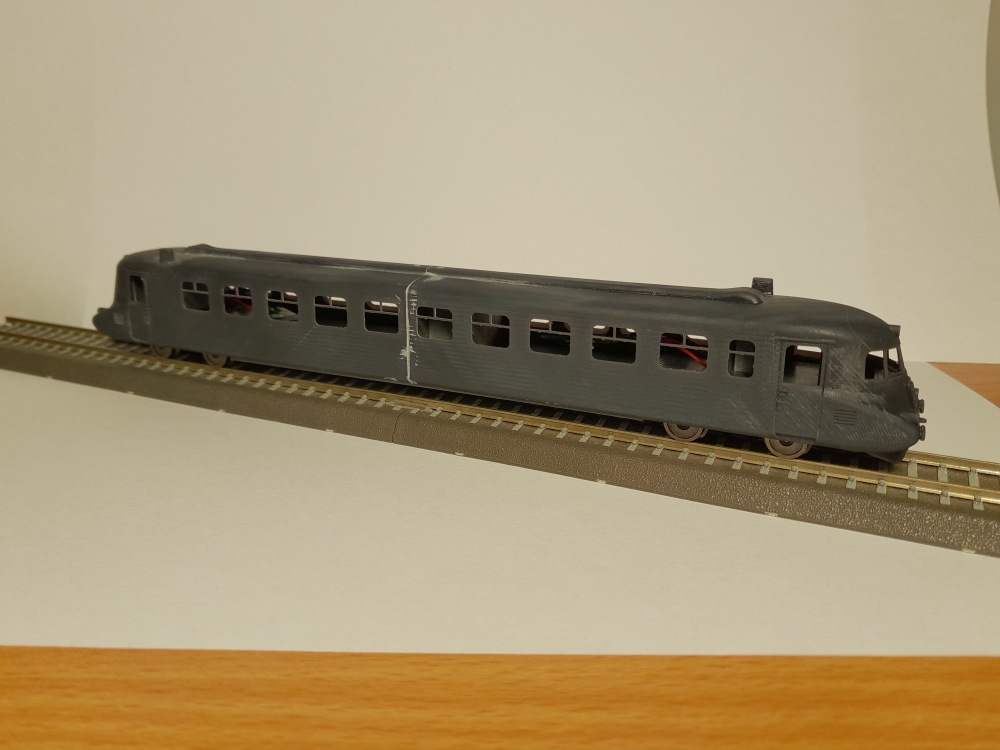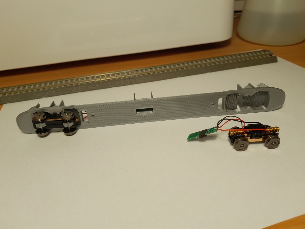 Následují fotky z vývoje "modelu". Skříň je tištěná z resinu po polovinách. Rám je z PLA, ještě do něj budu přímo integrovat interiér oddílů. Elektronika bude pod podlahou, přikrytá vytištěným "břichem" skříně - na fotkách zatím nepasující z PLA, ve finále to bude s resinu. Model bude doplněn o pár leptaných drobností, jinak to bude vcelku jednoduchá skládanka. Původně jsem předpokládal, že budu do rámu vkládat zátěž, ale i přes minimální hmotnost celku se to zatím nejeví, jako nutné...