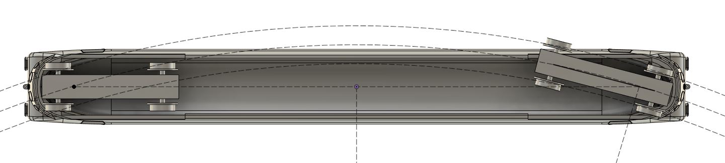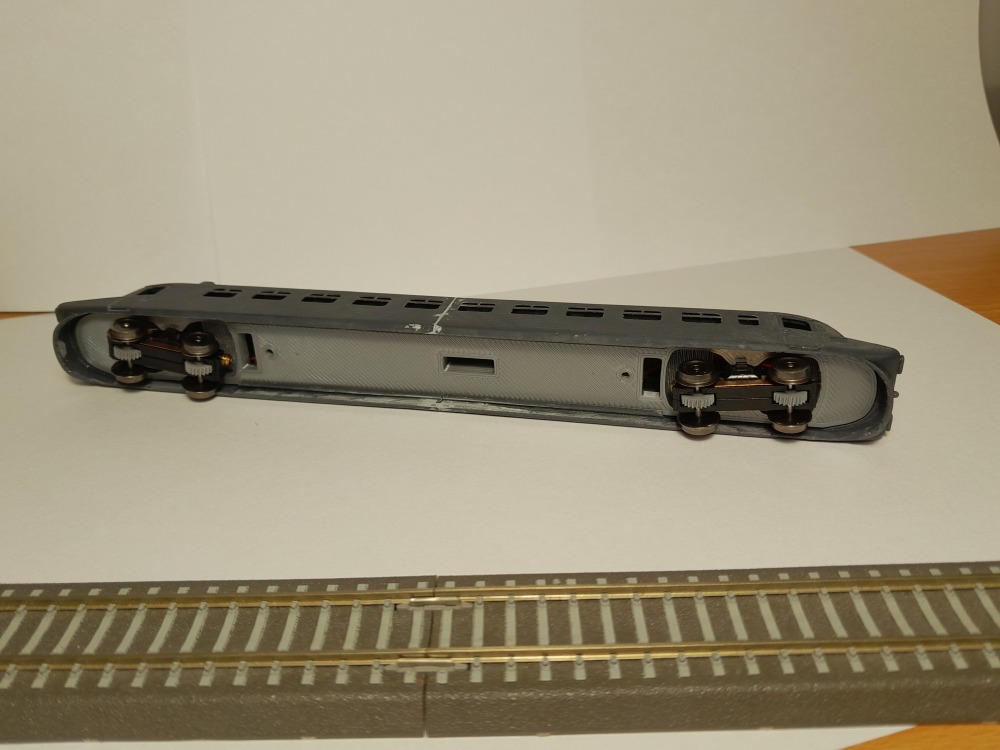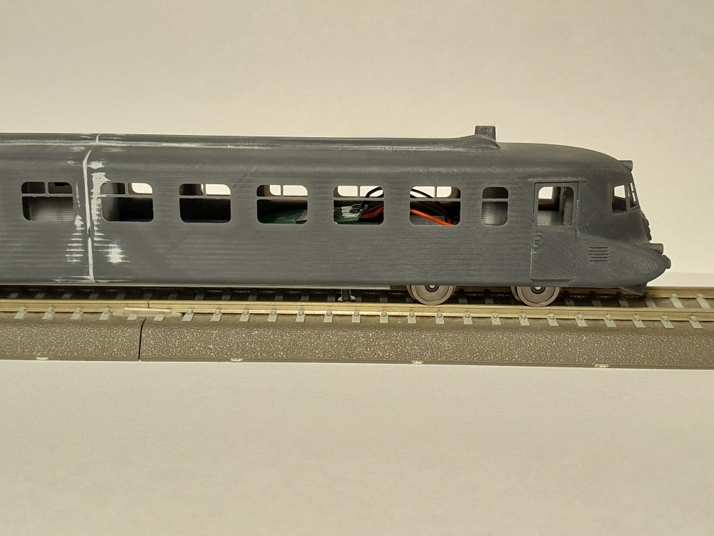 Hlavní problém u Strely je ale jinde než v tvaru. Vůz chci provozovat na svém domácím kolejišti, kde mám oblouky R310 a to absolutně nejde dohromady s modelovými podvozky dle skutečného vozu. Rozvor podvozků a jejich umístění u čela úzké karoserie by umožňoval provoz tak na poloměru R1000, tudy tedy cesta nevede. Na model v provozu koukám spíš z dálky a z nadhledu - nechtěl jsem tedy nějak rozšiřovat karosérii a ono by to stejně nestačilo. Stejně, tak jsem nechtěl dělat část karoserie jako součást podvozků - při provozu v četných obloucích by to vypadalo fakt divně. Jediná pro mě použitelná cesta je tedy v brutálním zkrácená podvozků a zároveň i v posunutí vzdálenosti otočných čepů. Rozhodl jsem se dodržet polohu vnitřních dvojkolí a zkracoval rozvor do té doby, než vůz byl schopen se poskládat do oblouku R310, při zachování aspoň náznaků zaoblení skříně vedle podvozků. Vyšlo mi to na 20mm rozvor. Modelový rozvor podvozku by byl 34,5mm. Otázkou je, zda se tomu stále dá říkat model... Nicméně rozměry karosérie jsou správně, tedy lze jí použít i ke stavbě modelového kusu s nezkrácenými podvozky. Když už mi vyšlo 20mm rozvor, tak jsem pokusně sáhl po coreless podvozcích od Hallinga - Strela jezdí zásadně sama, takže to musí stačit. Při testech jsem zjistil, že by stačilo i na kratší soupravu, ale to se Strelou nesouvisí.