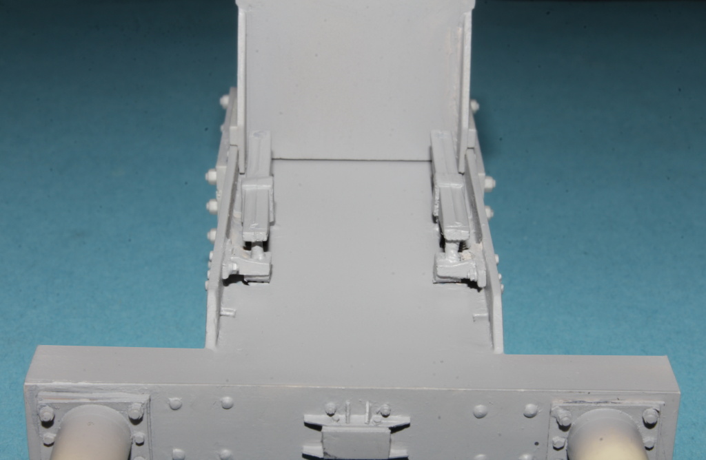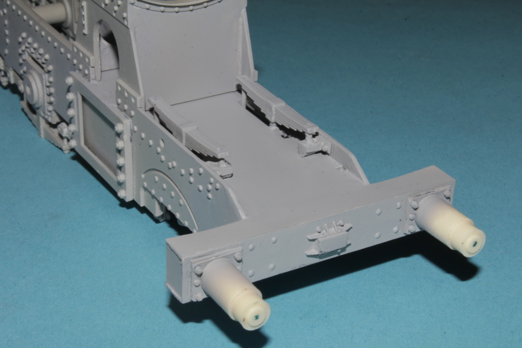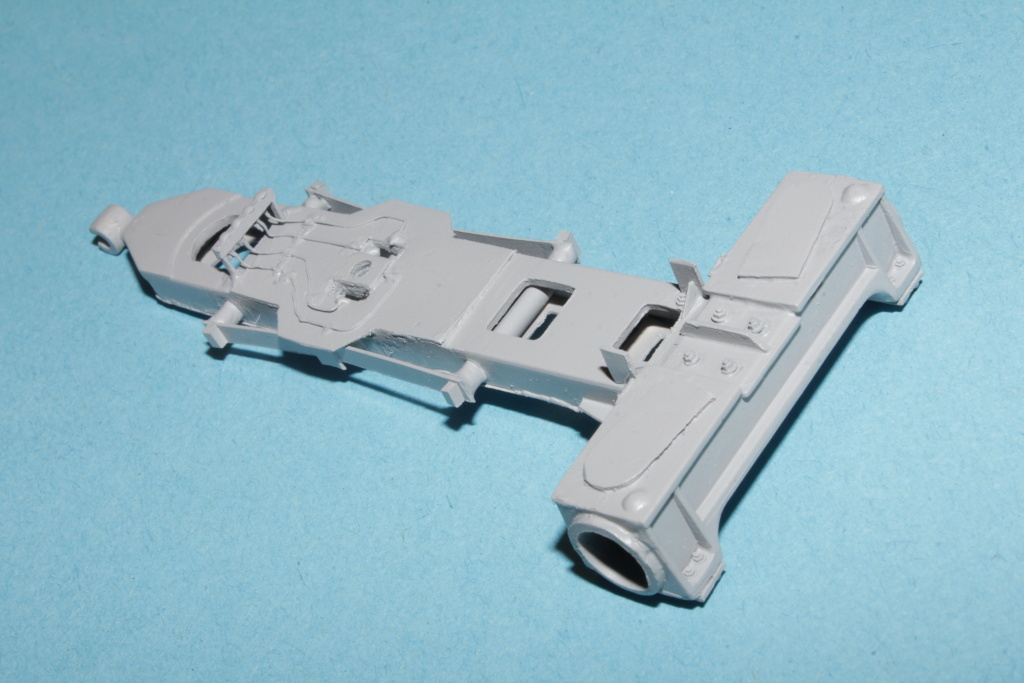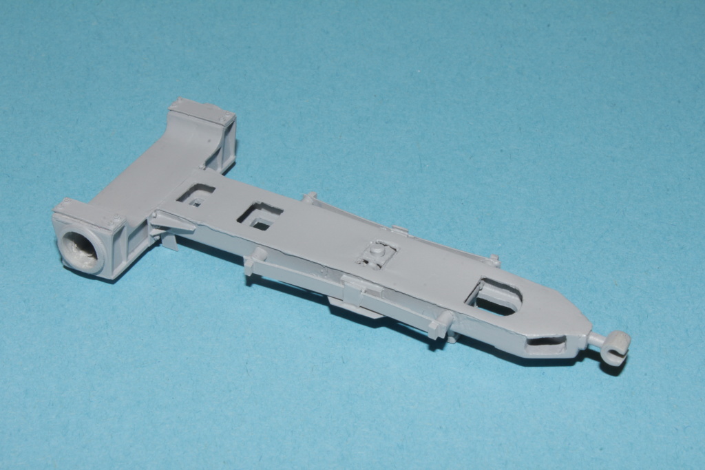 Poté přišla řada na samotný podvozek.Musel jsem doplnit kluzátka a samotný mechanizmus radiálního vypružení a dodělání pivotu,který jde vidět jak zvrchu tak zespodu.Jelikož původní podvozek ze stavebnice neměl nějaký "spodní díl" musel jsem také vyrobit nový.Následovalo doplnění šroubů a šroubečku a trubiček na mazání kluzných ploch u pivotu.S výsledkem jsem spokojen.Bude to takové oživení,co ale nebude moc vidět.