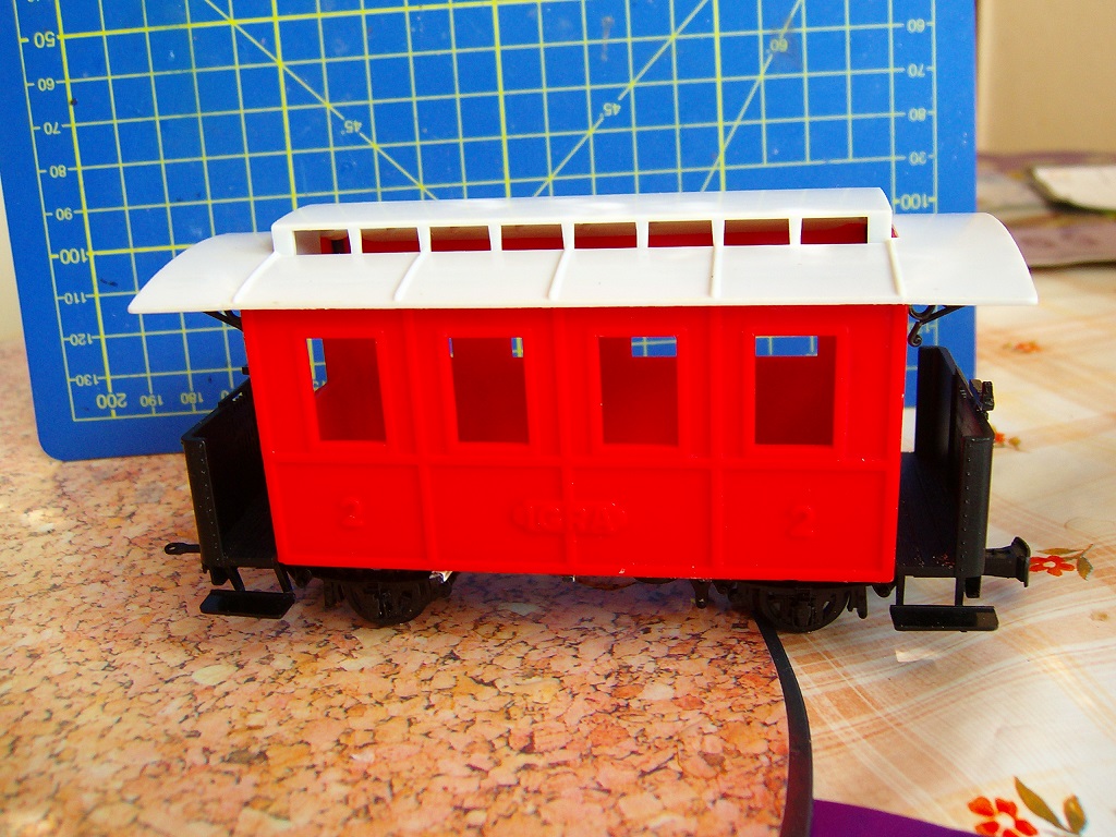 Osobný vozeň - pre zamestnaneckú dopravu som si kúpil asi jedine dostupný osobný voz (ak nepočítam nemeckých malosériových výrobcov, ale tí robia nemecké typy), od Fleischmana. Vozeň je to pekný, dobre spracovaný, je to vlastne rekonštruovaný osem okenný vozeň, ktorí sa používal aj u ČSD. Úprava na ČSD je jednoduchá, doplnenie madiel, výstuh, popr. vetrákov atď. podľa konkrétneho vozňa a zmena popisov a značky. Vozeň sa mi však "koncepčne" nehodil. "Súkromníci" používali vozne inej "filozofie" hlavne na Slovensku. Aj keď tieto vozne boli aj u "súkromníkoch". Po skončení 1. sv., sa niektoré vozne stali "korisťou" po RU armáde a ako nadbytočné sa odpredali. Pri hľadaní vhodnej nahradí som natrafil na predaj starej hračky "Igra" - lokálka. Doslova za "pár šupov" som jednu takúto hračku odkúpil a začal skúmať. Hračku navrhoval rozhodne niekto, kto mal železnicu v "oku". Osobný vozeň sa na prestavbu výborne hodí. Dĺžka skrine po prepočte 4,23 m a šírka 1,93 m už odpovedajú viac vozňom používaných na neverejných železniciach. Rozhodol som sa preto pre prestavbu. Rám vagóna je z osobáku Fleischman. Ten som skrátil na rozvor "3,1m" podľa skrine lokálky. Zatiaľ som s jeho prestavbou nepokročil, nechám si ho na zimu.