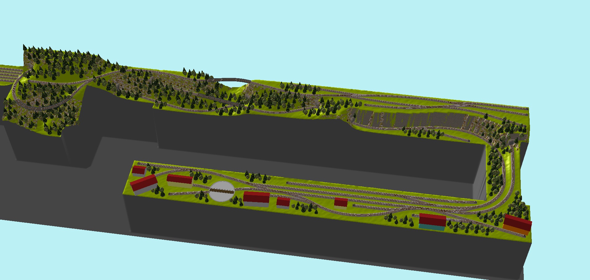 Konec spodní tratě je ukončen skrytým nádražím s točnou na konci pro snadný obrat vlaků.