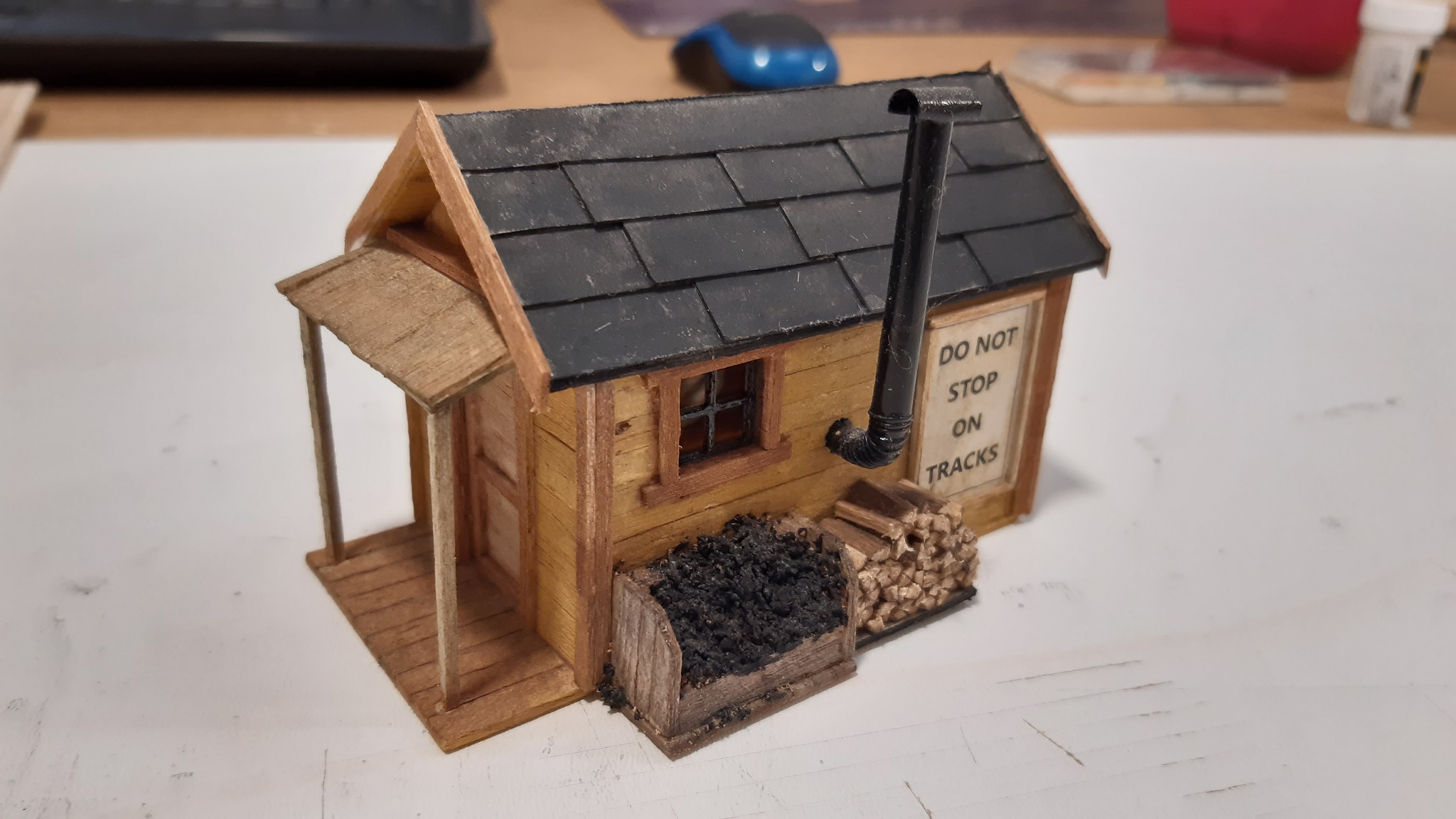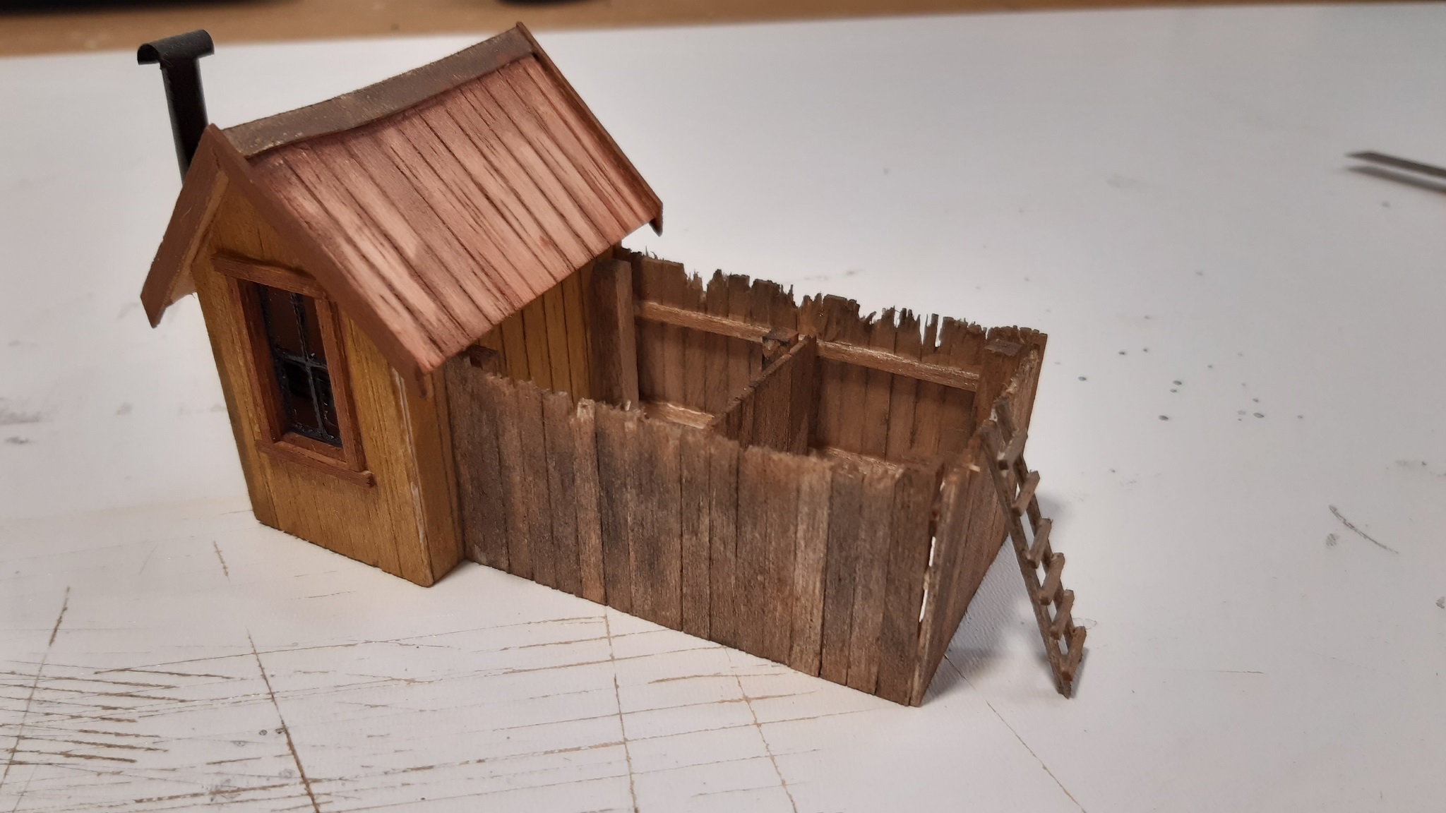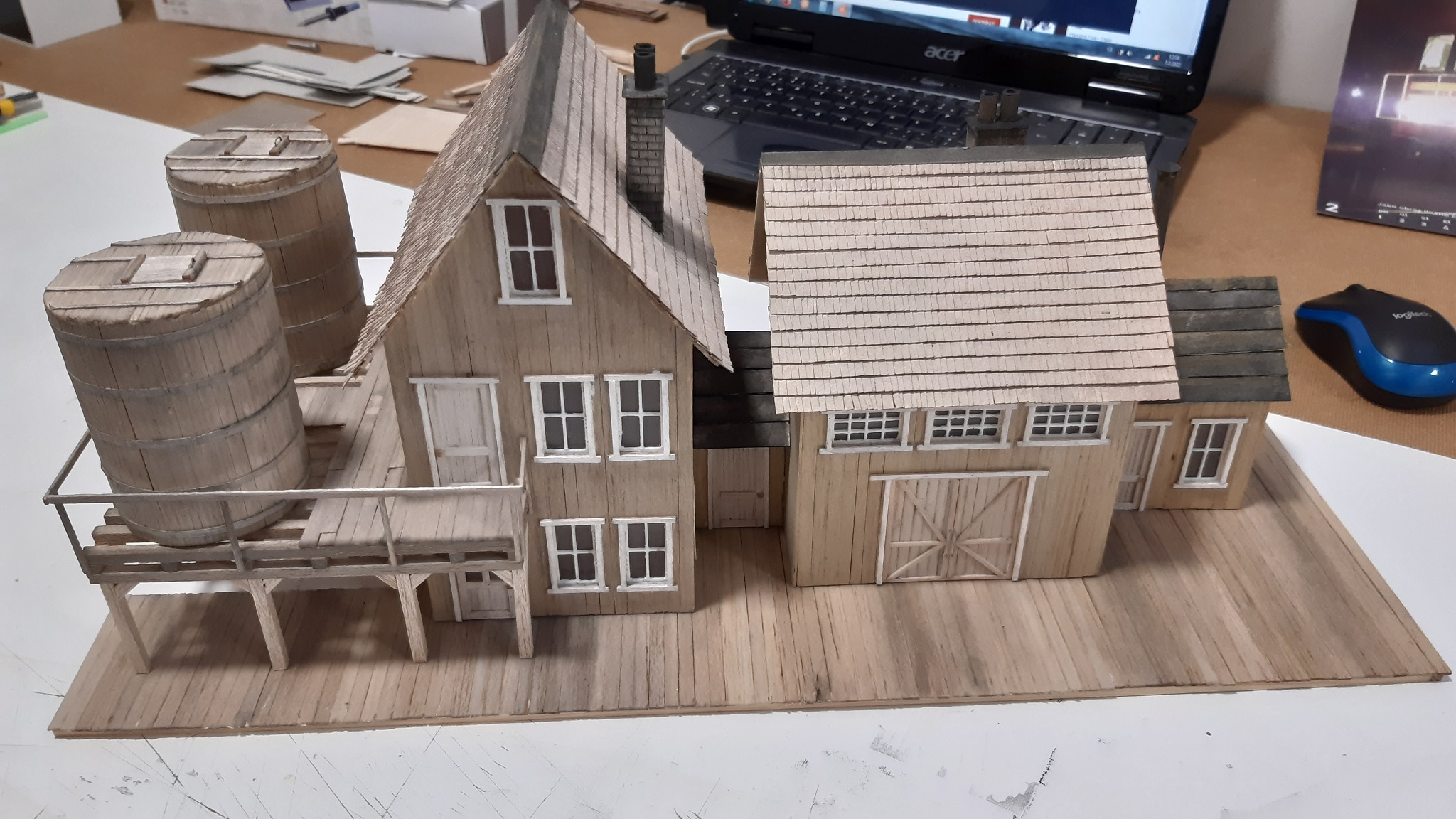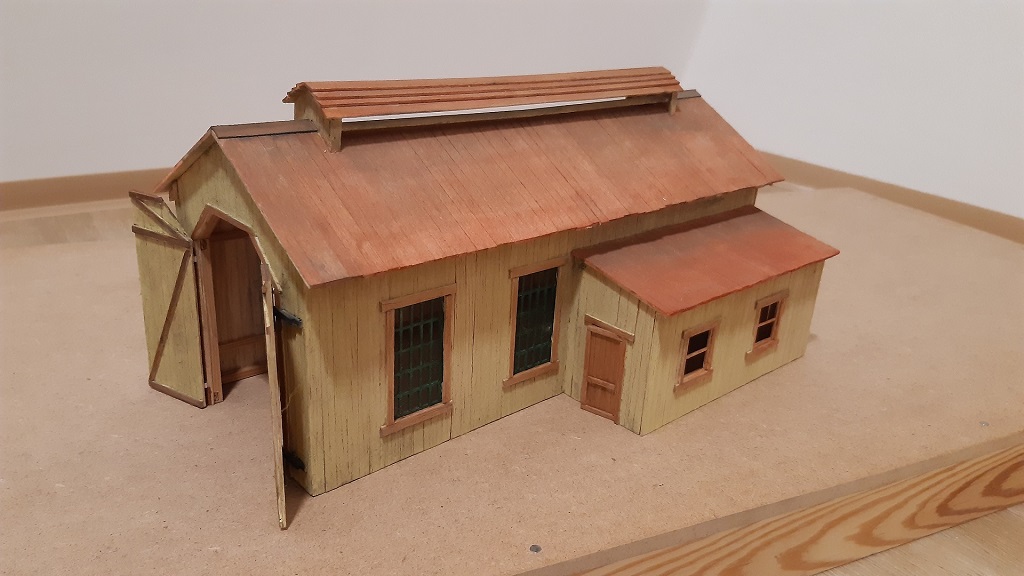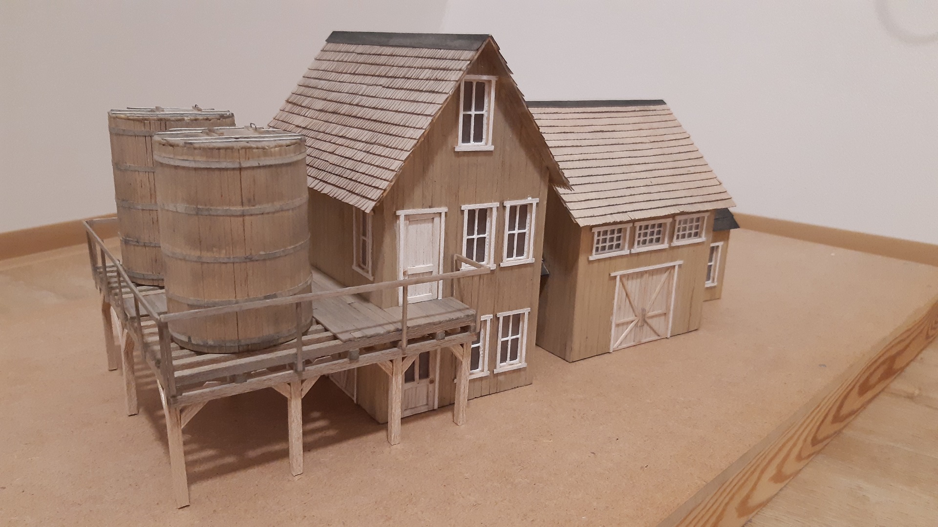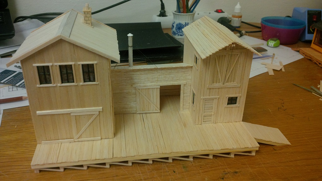 Budovy si stavím sám, dle fotek a plánu z americký webů a df. Jako základ používám smrkové profily a balsové dřevo, které řežu na prkýnka a lepím je na připravený rám budovy. Poté jsou barveny vodovými barvami, ale zde mám ještě velké nedostatky... Níže přikládám foto rozestavěných budov.