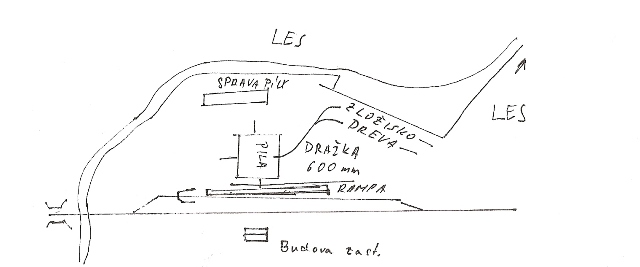 Bola to zastávka s nákladiskom, dĺžka 152 m. Nachádzala sa tam budova z neomietnutých tehál – strážny domček, príručný sklad pre zamestnanca, hosp. dvor a ložná miera. Ako názov napovedá, jednalo sa o nákladisko pre pílu. Na píle mali - majú klasickú drážku určenú pre manipuláciu v rámci píly. Schematický náčrt – veľmi nepresný, iba na dokreslenie situácie. Koľajové vetvenie je tak od oka, ako som to videl ja počas návštevy.