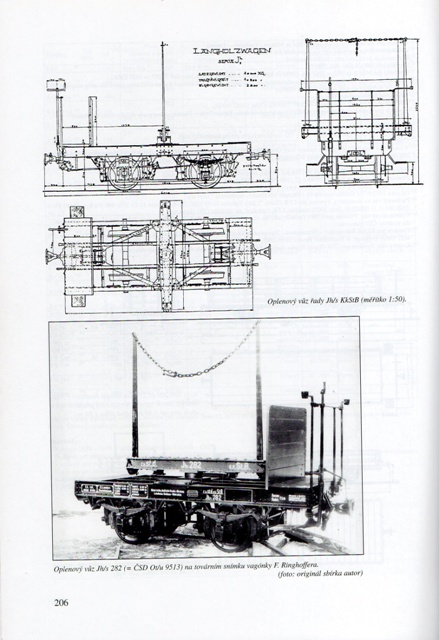 Předloha (zdroj K. Just - Na uzkém rozchodu v JH) a detailní foto vozu s plošinou (chybí řetízek na oplenu a třmeny na spřáhlu).