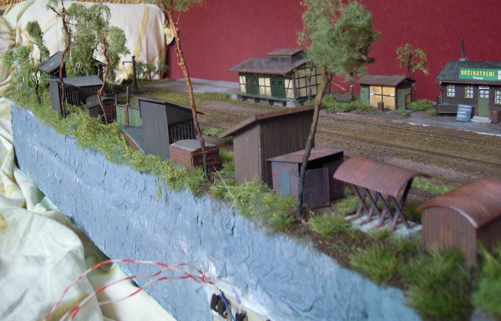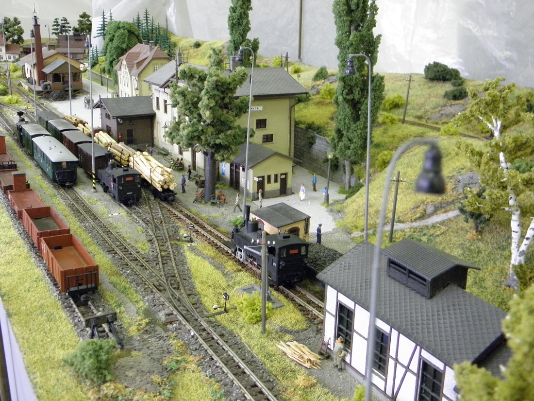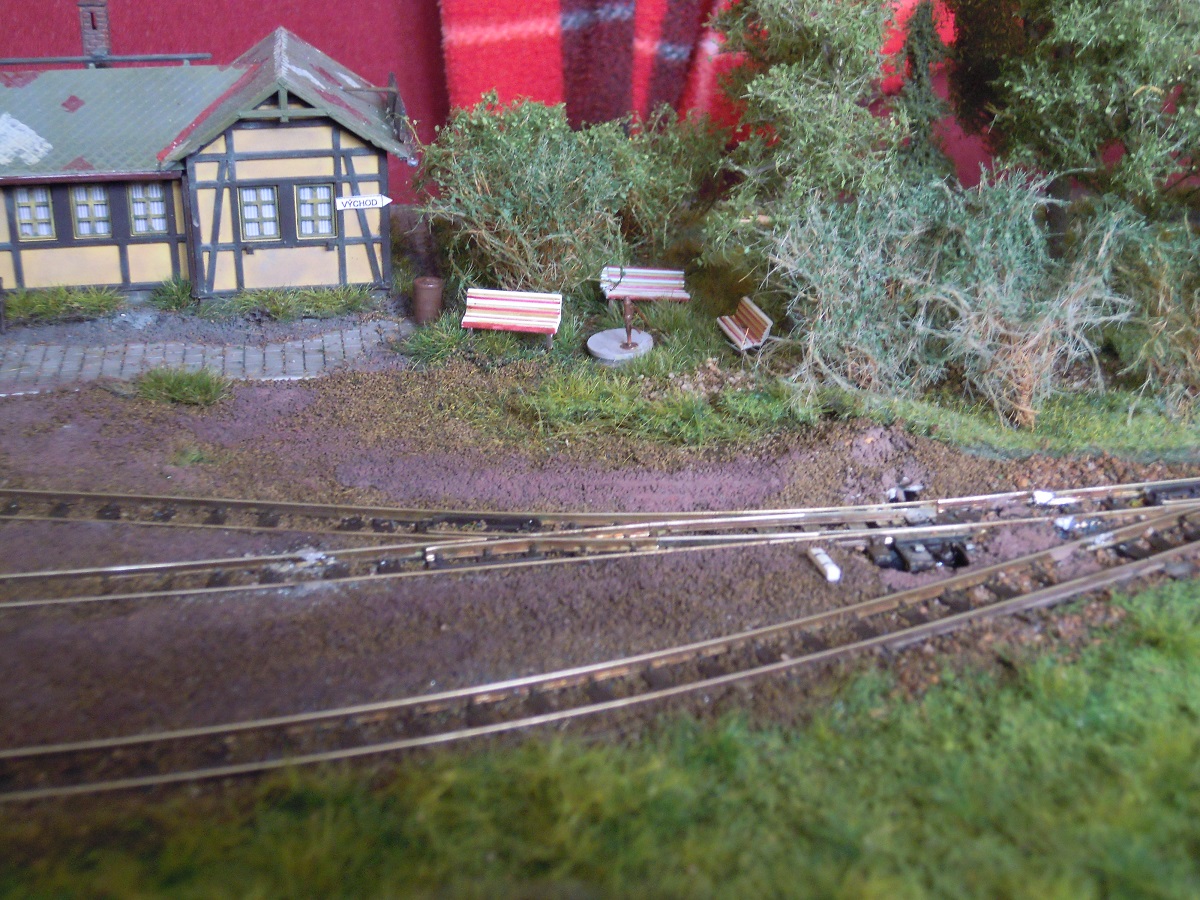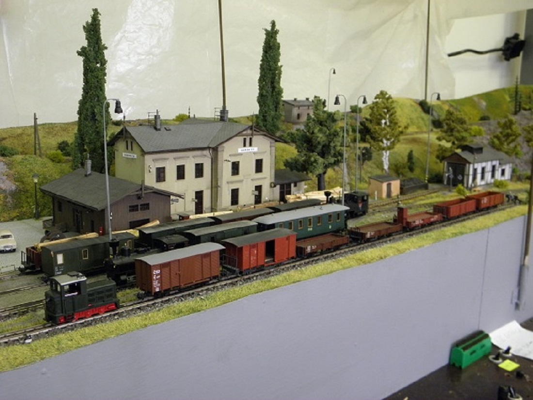 Plánek by byl, ale musí se zmenšit, dát dohromady a oskenovat a jaksi nejsou lidi, je to 6x A3, skoro každý díl je zvlášť. Jinak to zatím popíši slovně. Kamenice, nyní koncové nádraží, trať jde pravým obloukem z nádraží, otočí se o 180°, kousek rovinka, pak výhybna Stará - z provozních důvodů, dále trať pokračuje doprava v zářezu a po vrstevnici asi po 4 metrech dojede do stanice Heřmanice - zastávka, kde je vlečka pod drtičku kamene. V lomu drážka HO-f. Trať pokračuje zhruba 4 metry a pak se opět stáčí vpravo do nádraží Heřmanice u Frýdlantu. Je to model skutečných Heřmanic včetně budov a kolejiště. Na délku je to zkráceno v poměru 1:200. Púvodně toto kolejiště bylo postaveno do L 5x7 m, pak jsme se stěhovali do jiné místnosti, museli jsme ho upravit do tvaru U a nakonec jsme se opět stěhovali, takže jsme museli udělat další rohový díl. Tak nyní je kolejiště v podstatě obdélník, který nemá spojen jeden roh. Další fotky postupně přidám, musím je vytřídit. Jinak jsem sem napsal na popud z vlákna JHMD, kam dal kolega Ferdián fotky a článek z časopisu Modelleisenbahner z roku tuším 85 nebo 86.
