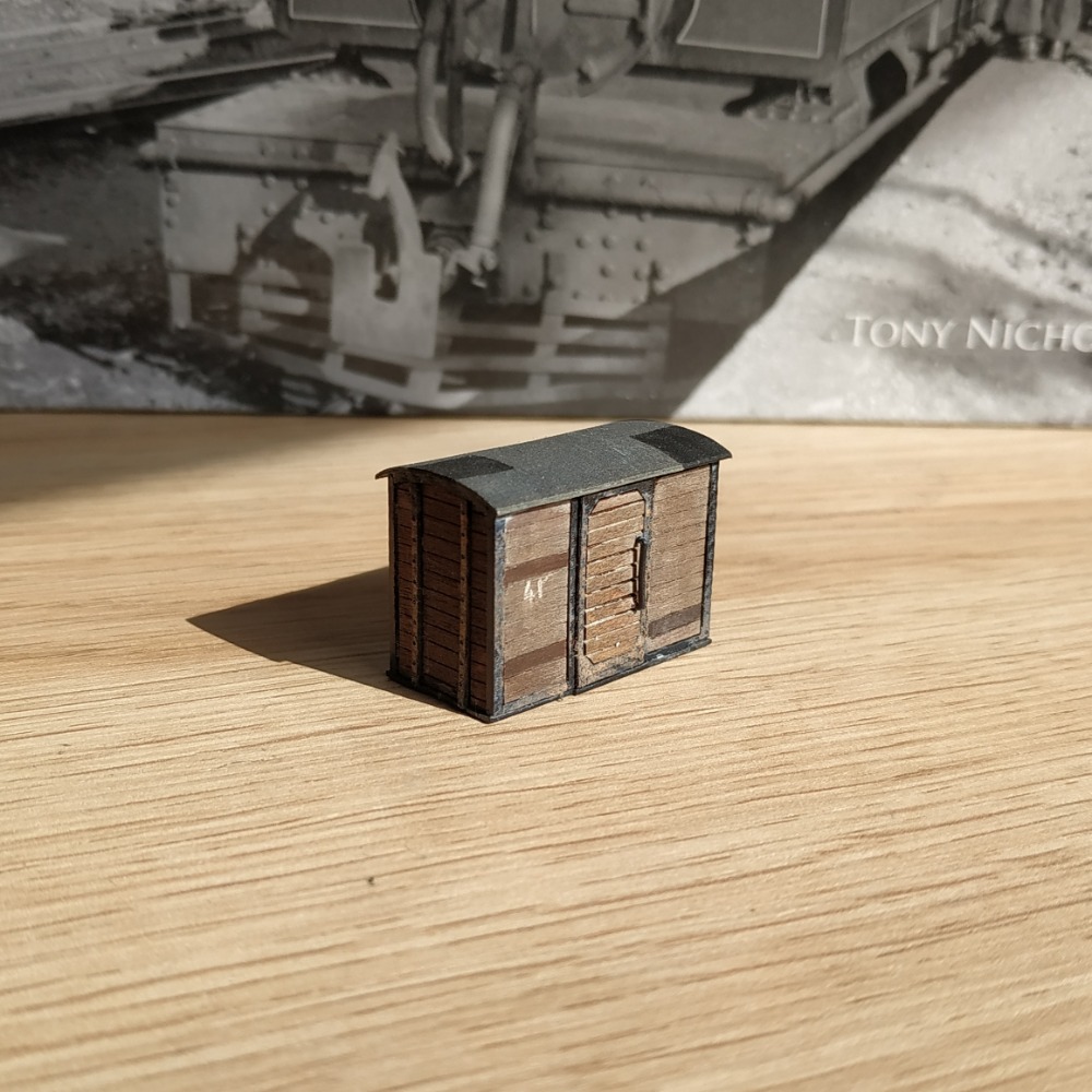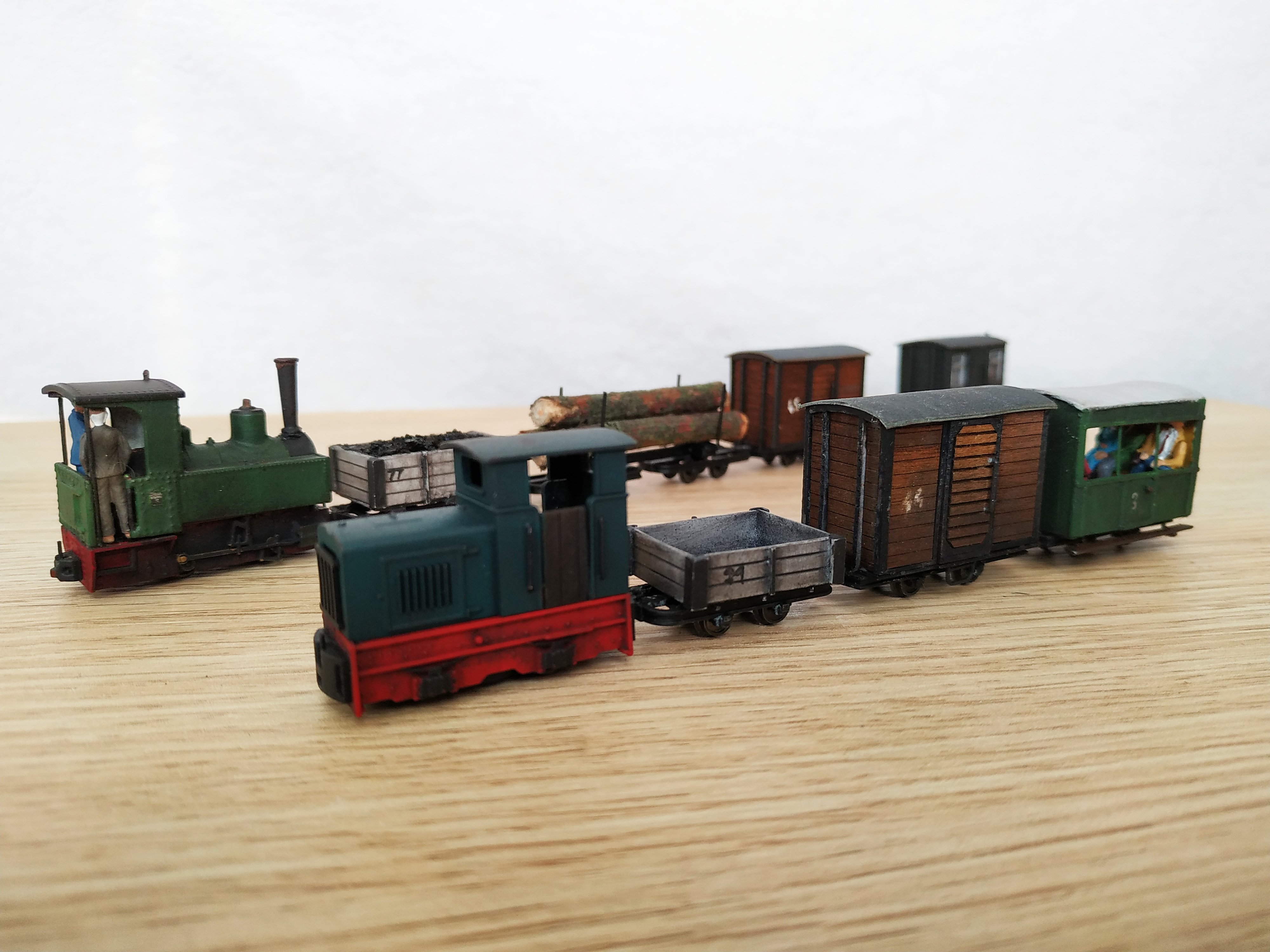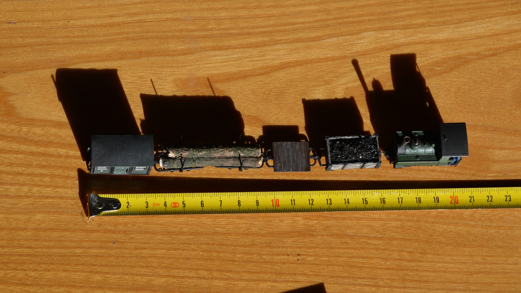 Dále jsme vytvořil pár vlastních vozů, většinou inspirovaných opět anglickými železnicemi. Vozy jsem postavil na rámech, které poskytuje Busch jako základ stavebnic. Na fotce jsou kryté vozy a opleny z tovární produkce Busch.
