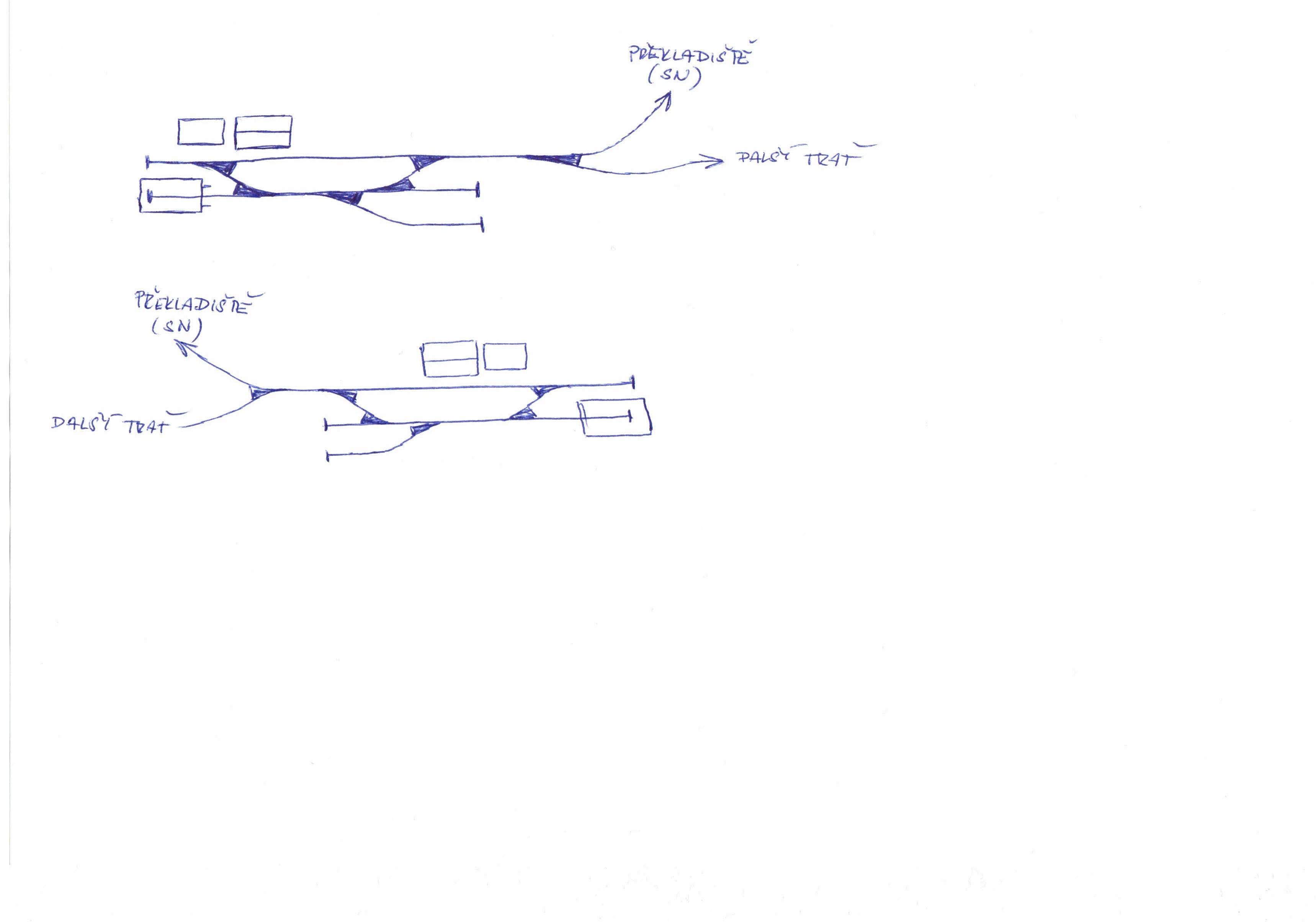 V první etapě bych rád vytvořil popsanou stanici, jejíž plánek, snad nevadí, že ručně kreslený, přikládám. Stále se však nemohu rozhodnout, jak ji orientovat (úvrať vlevo/vpravo). Stanice bude na ploše 80*20 cm (dvě sešroubované Casani krabičky), odbočná výhybka tvořící úvrať pak bude na dalším segmentu 40*20. Na její obě větve budou navazovat malé (dvou až tříkolejné skryťáky),