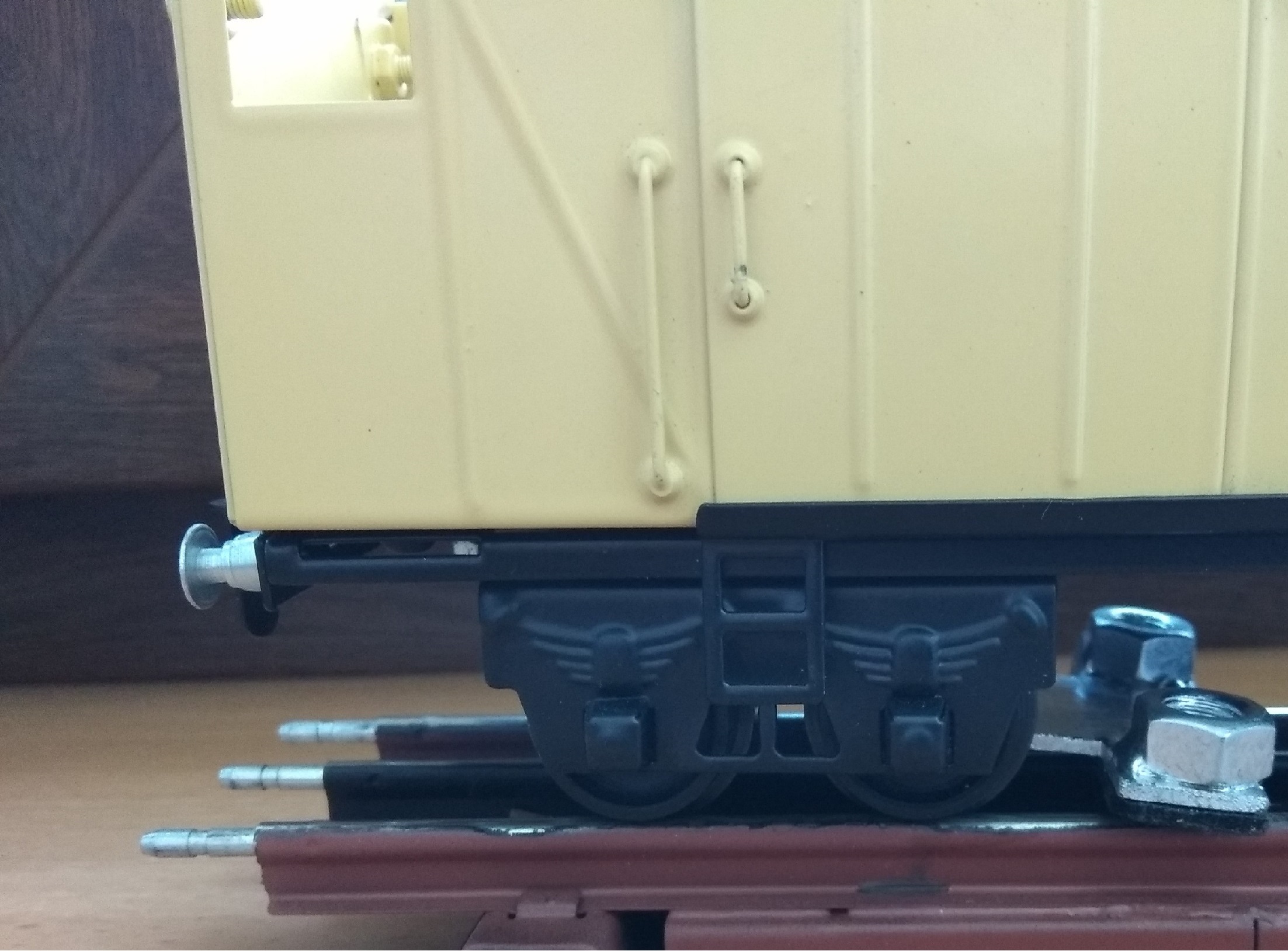 Někdy stačí plechové koleje pouze přejet lokomotivou která je těžší než vagon a přenos napětí na trakční vozidlo se zase obnoví, proto jsem tento vůz vybavil destičkou z plechu a dvě ocelové matice M30 a vše sletováni uprostřed je díra pro uchycení pod šroub co drží podvozky.Takto vzniklé závaží jsou zatím dostatečné ale místa je ve vagonu dost pro přidání.