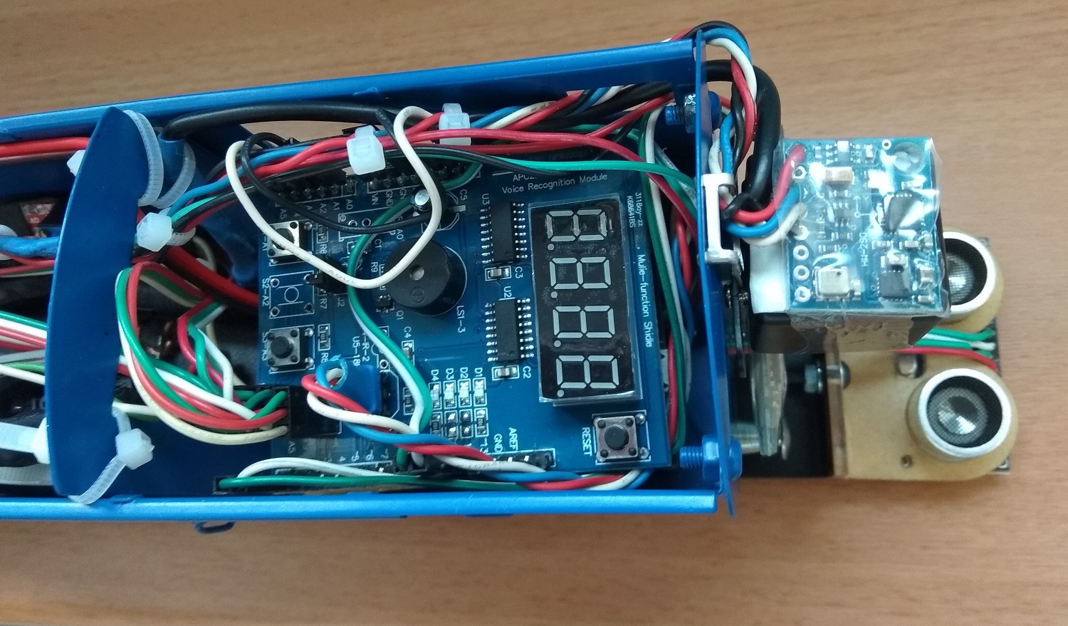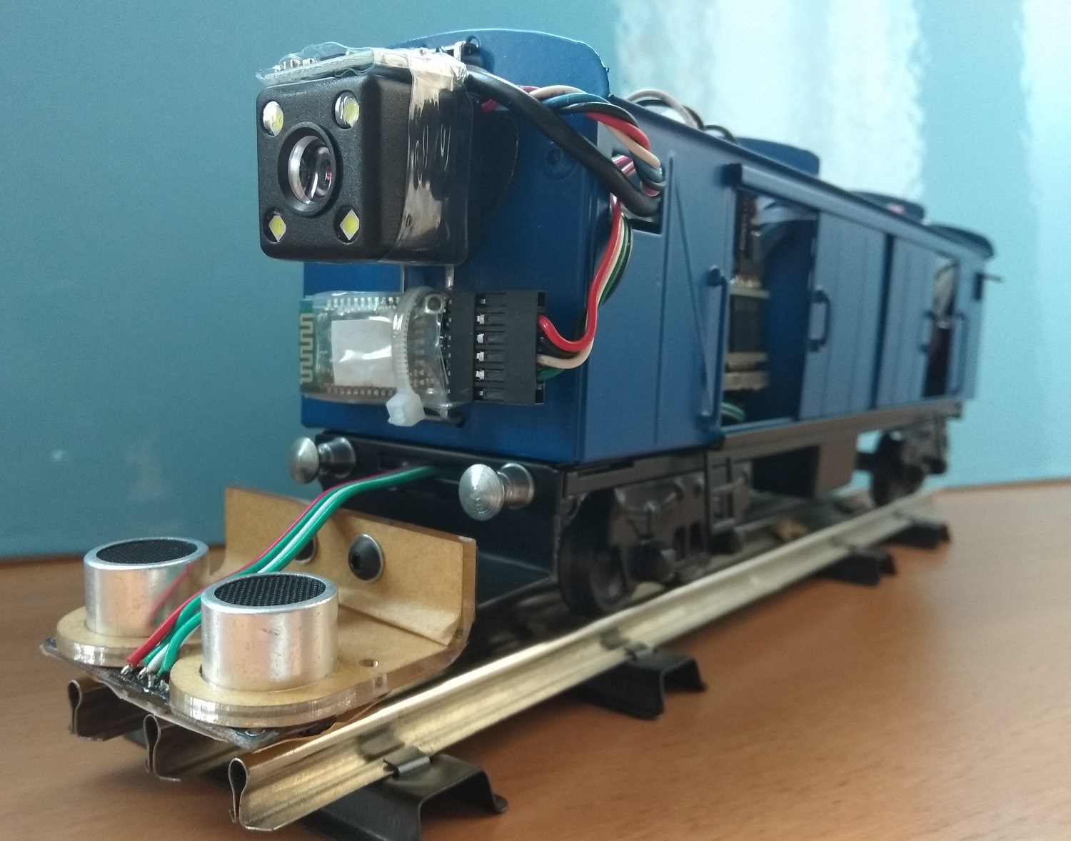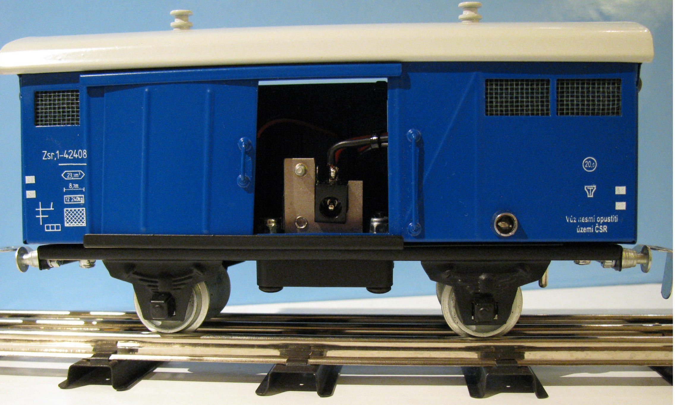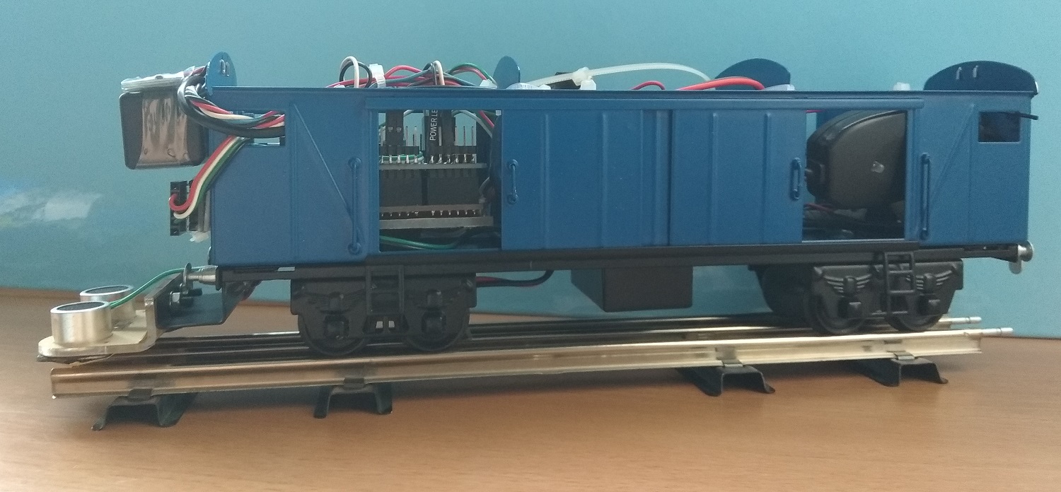 Jsem se do toho pustil. Jako základ jsem využil dlouhý vůz z výprodeje (snad 9409) do kterého jsem se snažil nacpat co nejvíce modulů. Na čele je ultrazvukový senzor měřící horní vzdálenost kalibrovaný od hlavy kolejnice pod ním hallův senzor indikující vůz na koleji, dále bluetooth modul, kamera a modul kombinovaného kompasu. Ve spod za čelníkem je čidlo soumraku a teploty. Uvnitř v první vnitřní sekci vozu je Arduino Uno s mírně upraveným výukovým modulem následuje prostřední kde je baterii 11,1V a pod podlahou v bedně je modul otřesu, v poslední sekci je vysílač 2,4GHz pro obraz z kamery, konektor pro napájení systému případně dobíjení baterie, voltmetr a za spřáhlem páčkový vypínač. Přední podvozek je upraven dodatečnou montáží sběrače pro měření napětí v koleji.