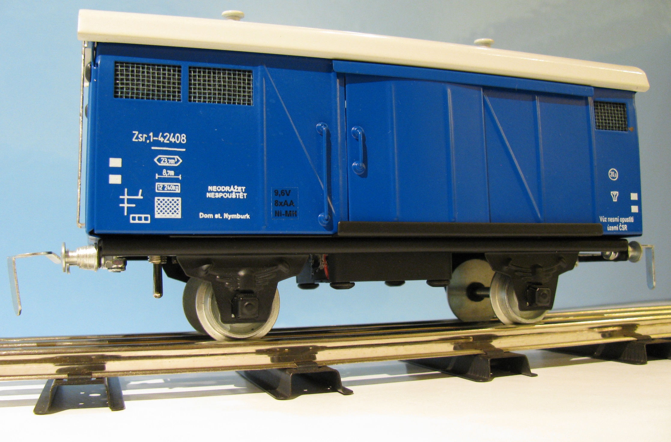 Upravený vůz Merkur 9402 jako ventilátorový, pro odfukování prachu hlavně v domácnosti. Zespod hned za spřáhlem je páčkový vypínač, uprostřed je malý ventilátor 12V,pro indikaci ofuku je zespod blikající LEDka a z jednoho boku také.Uvnitř je pouzdro na dobíjecí články AA, za bočními posuvnými dveřmi je konektor pro dobíjení takto vzniklé baterky. V bočních větracích otvorech je lepidlem zalepena jemná plastová síťka s nalepenými kousky uhlíkového filtru.