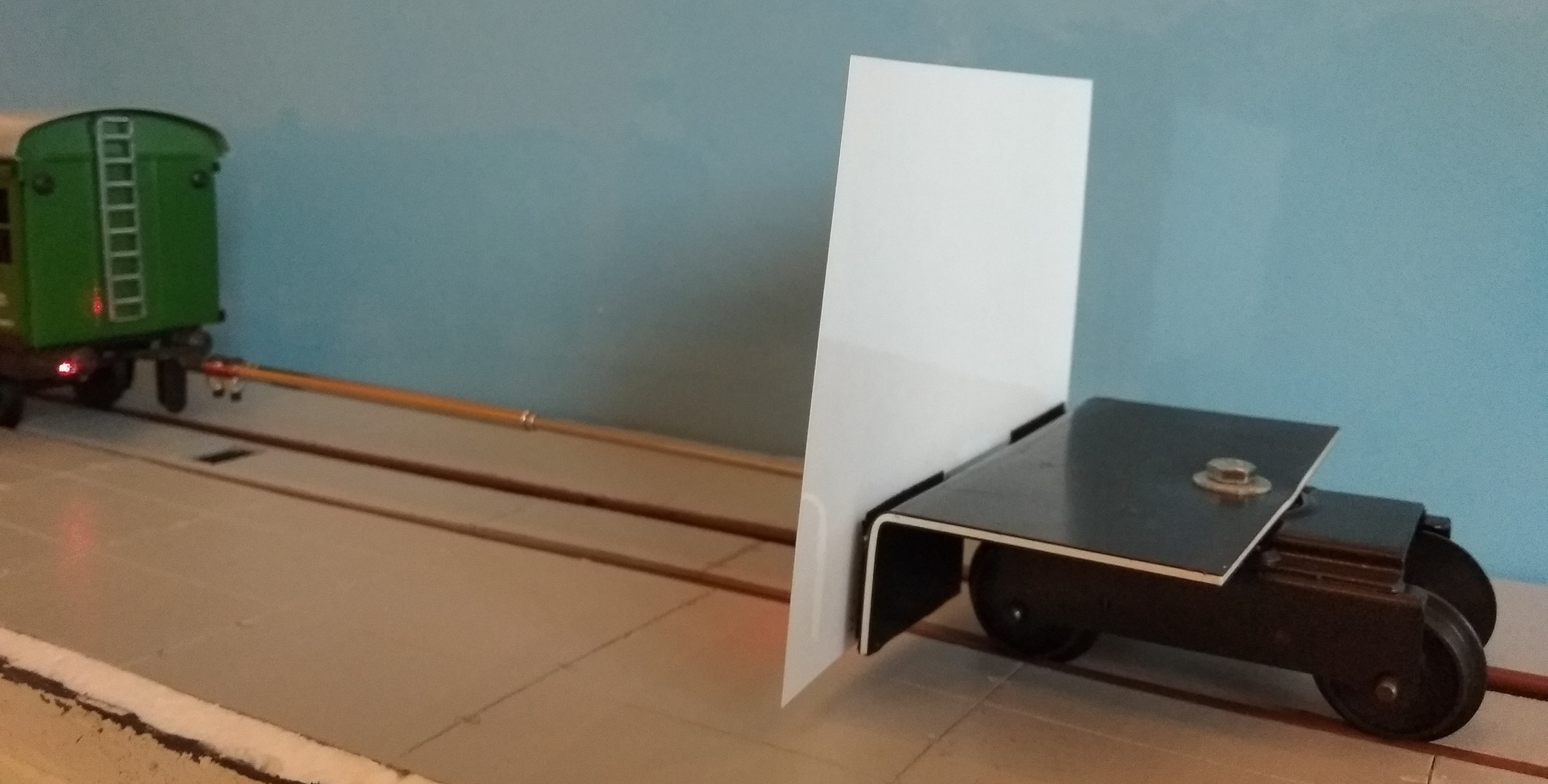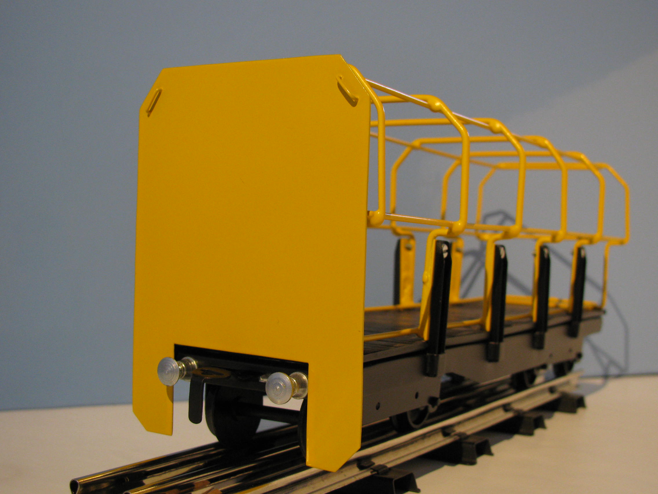 Při budování kolejiště je potřeba dodržet tzv. průjezdný průřez, ideální příklad je tubus tunelu či vícekolejná trať a to hlavně v obloucích.Proto zcela náhodou vzniknul tento vůz. Je to v podstatě kopie plošinového vozu (proto nemá masky podvozků) který je doplněn sletovanou konstrukcí z měděného drátu podle obrazku z NEM normy.Pro představu celkového průjezdného průřezu lze na jakékoliv čelo dosadit čelní desku která zachytí případnou kolizi např. s trpasličím návěstidlem.