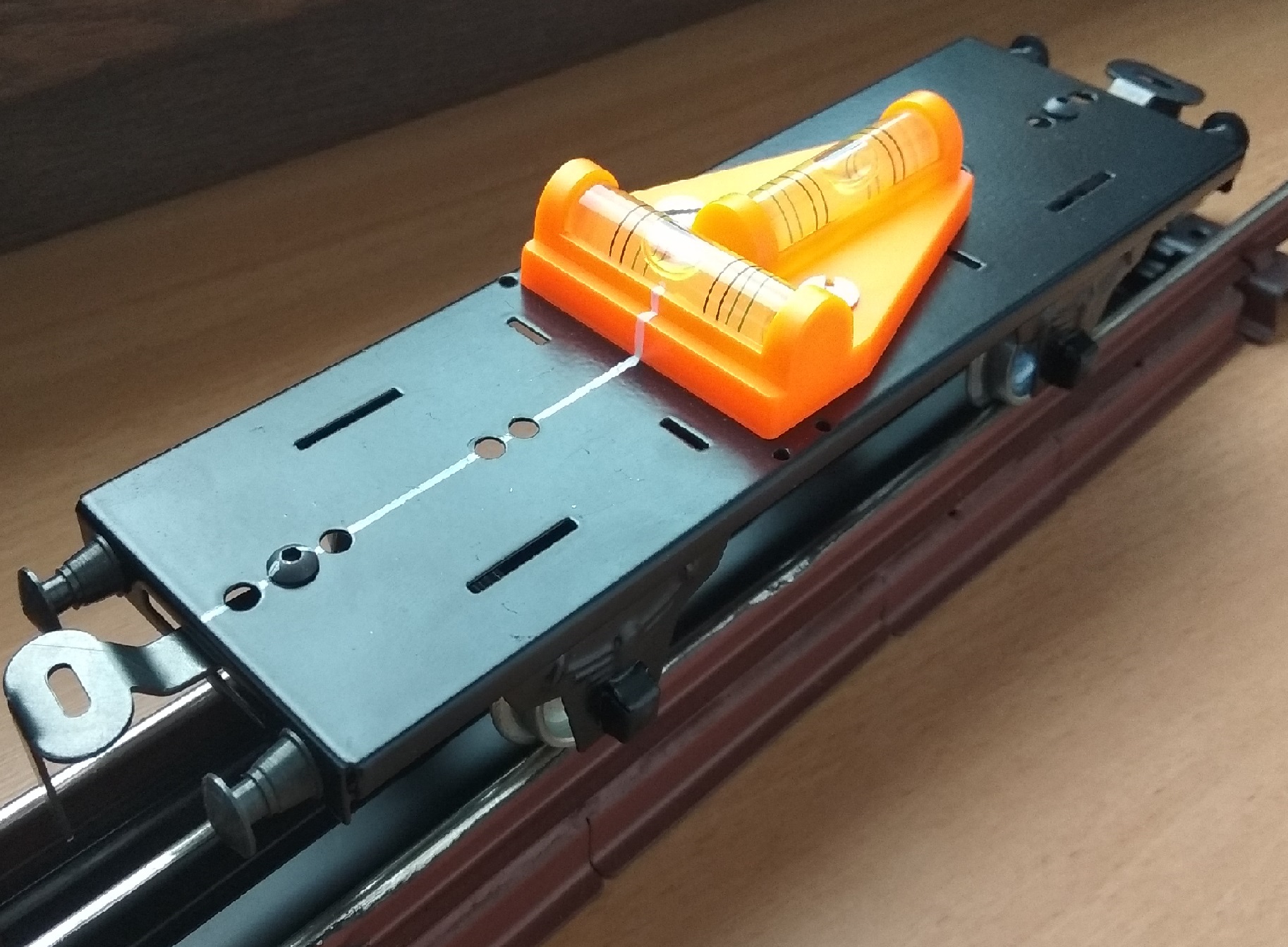 Jako základ je použit podvozek krátkého osobního vozu a na jeho horní stranu je připevněna křížová vodováha pro karavany. Bílá linka značí střed vozu a je určena pro další přípravek.