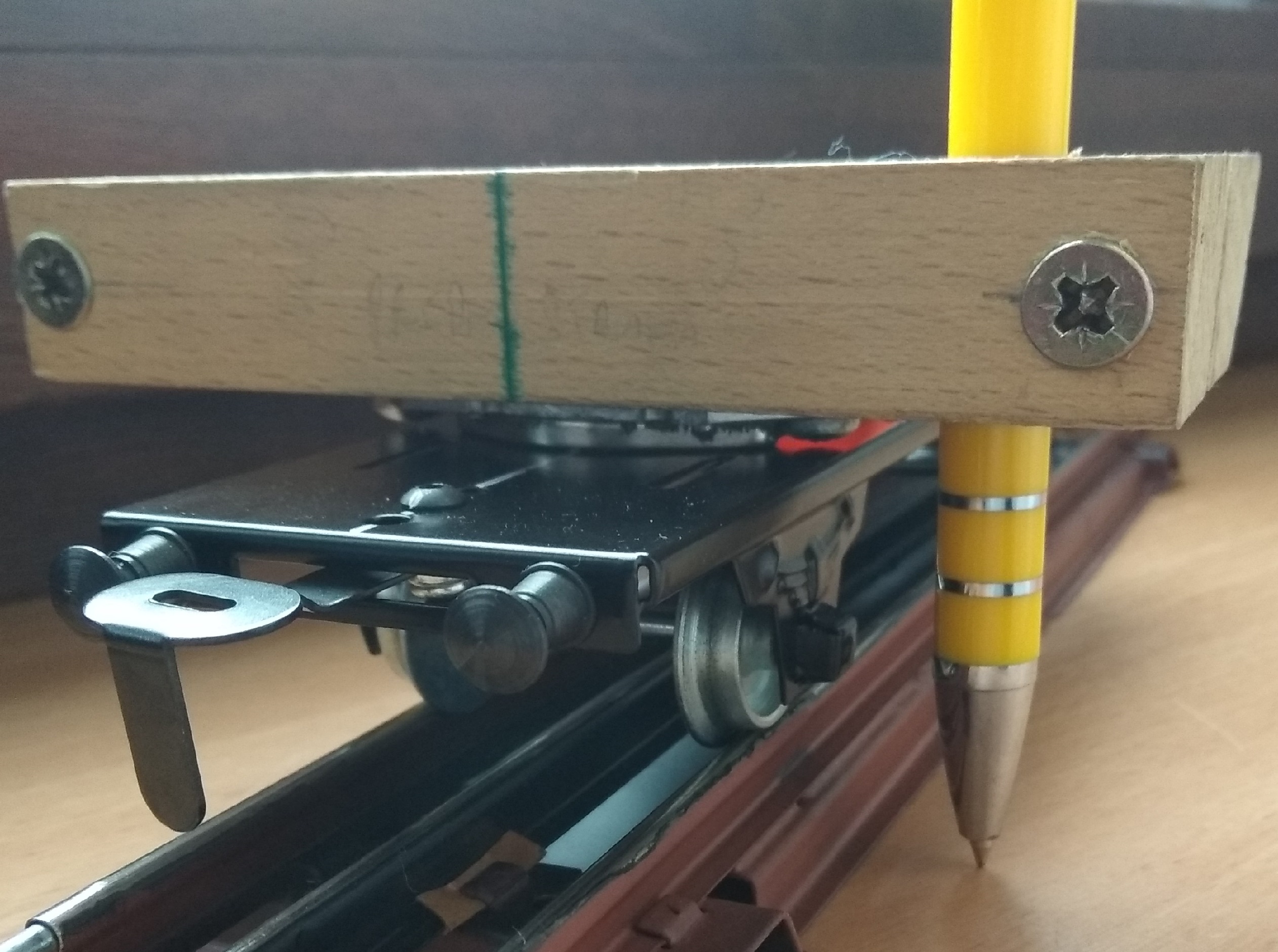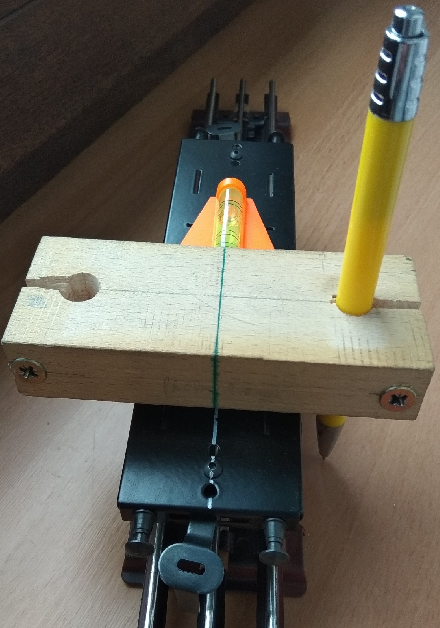 Tento přípravek tvořený špalíčkem z tvrdého dřeva má zespod přišroubovaný neodymový magnet z HDD sloužící k přichycení k podvozku, uprostřed po obvodu je vyznačena zelená linka která se slícuje s bílou linkou na podvozku vozu, na každém okraji je vyvrtaný otvor který se stahuje šrouby a slouží k uchycení tužky nebo fixy k vyznačení okraje štěrku při tvorbě štěrkového lože zaštěrkováním.