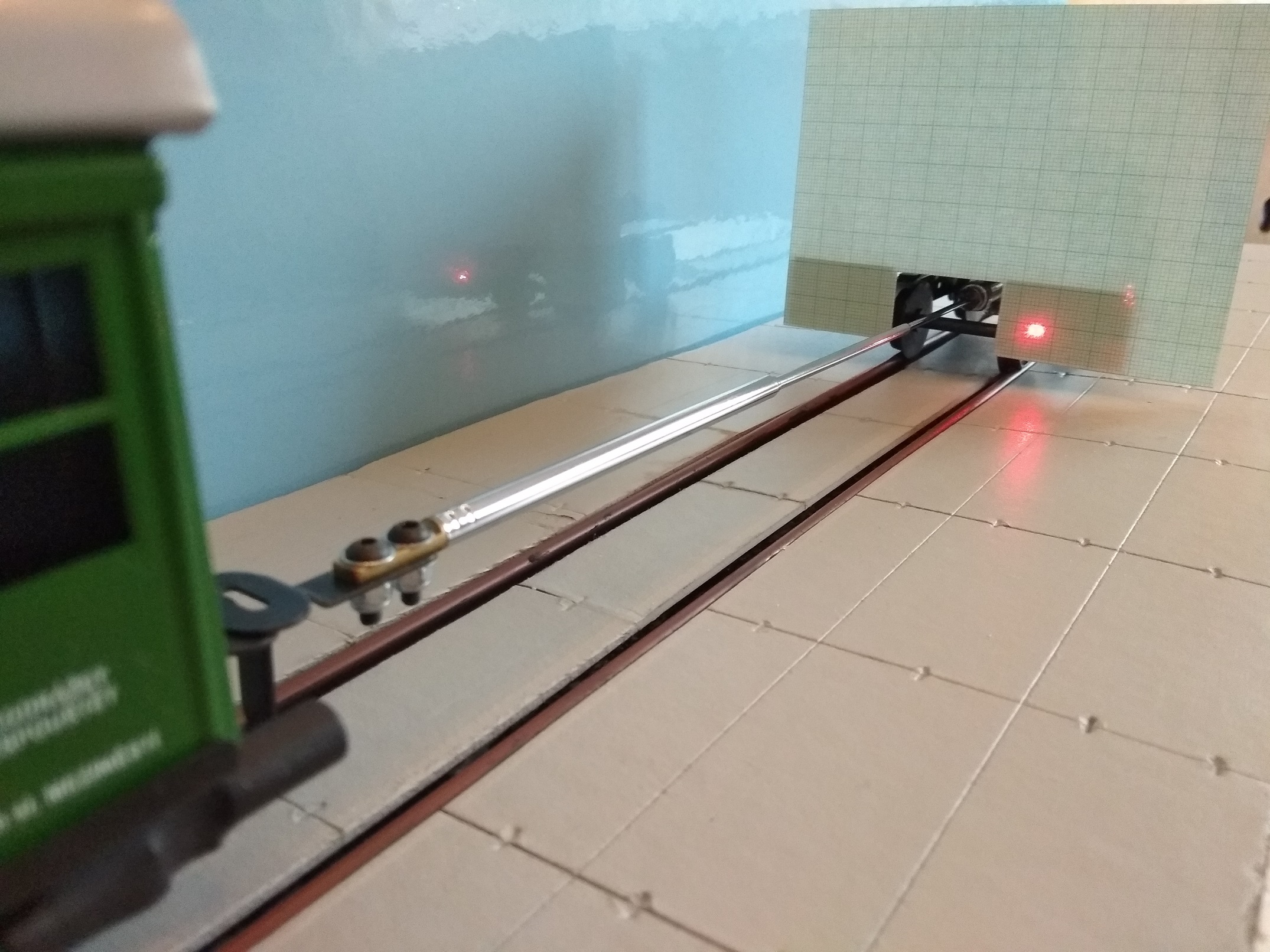 Opět jsem se nechal inspirovat a vytvořil jsem si laserový vůz, jedná se o Merkur 9705 služební dvounápravový vůz typu Ds doplněný laserovou jednotkou která má předřadný odpor, zevnitř střechy je nalepen kus LED pásku a přes společný vypínač je vše napájeno z 9V baterie. Laser je seřízen podél jedné kolejnice a jeho paprsek se zobrazuje na podvozek doplněný plastem ohnutý do "L" na který přijde dolepit zalaminovaný milimetrový papír a tento podvozek bude přes stavitelnou oj výkyvně spřažen se samotným laserovým vozem.Tato souprava bude sunuta před lokotraktorem a pohyby laserového bodu na stupnici zobrazí zvlnění a vybočení kolejí.