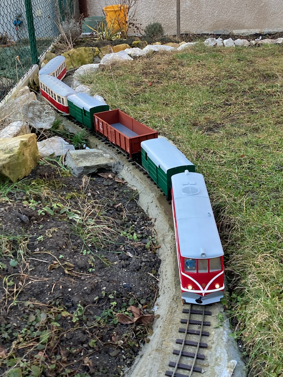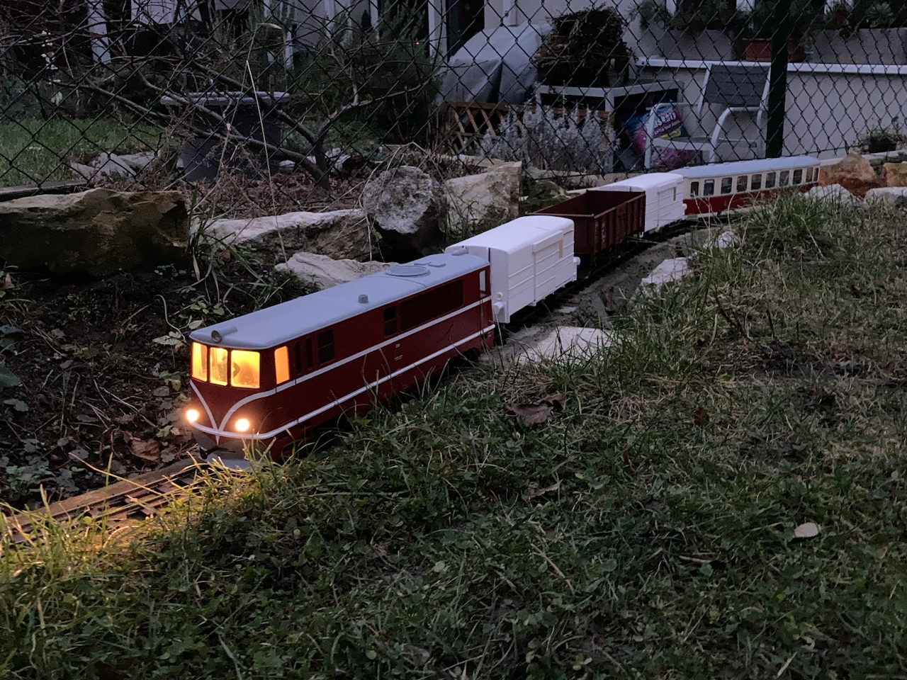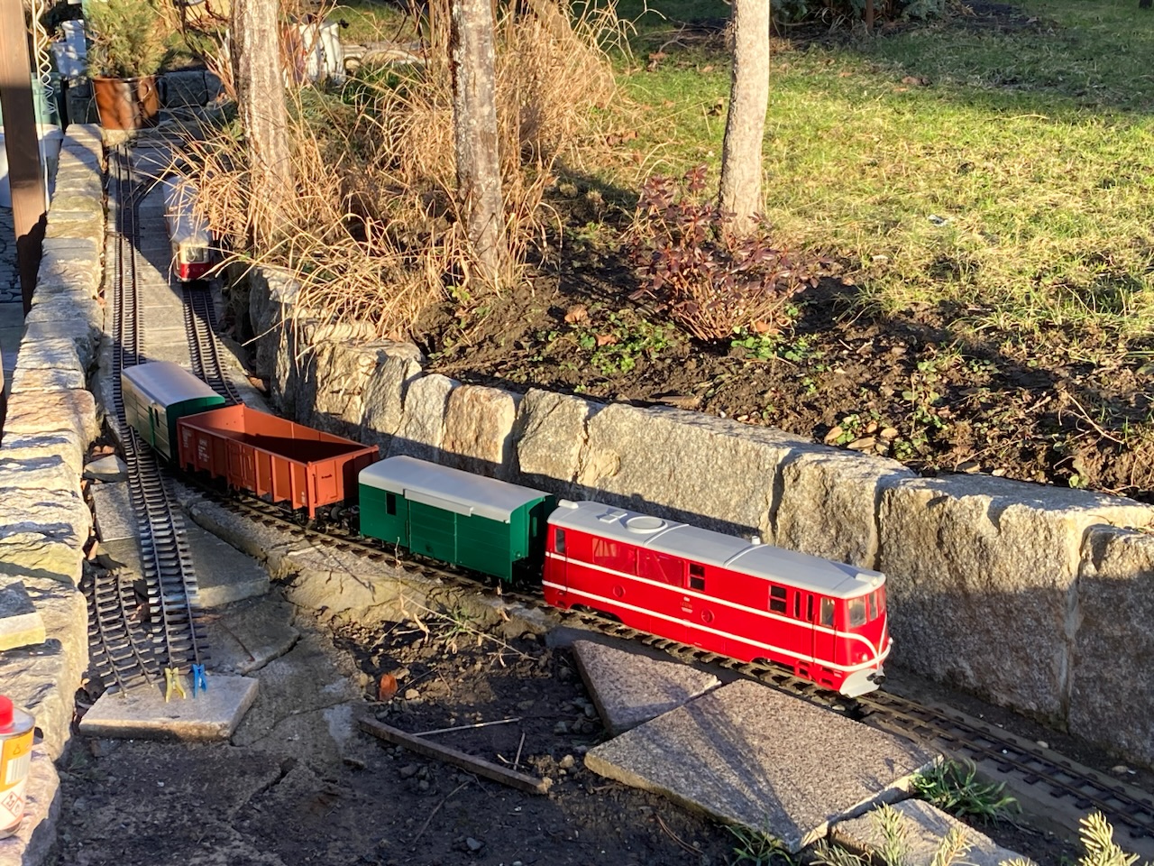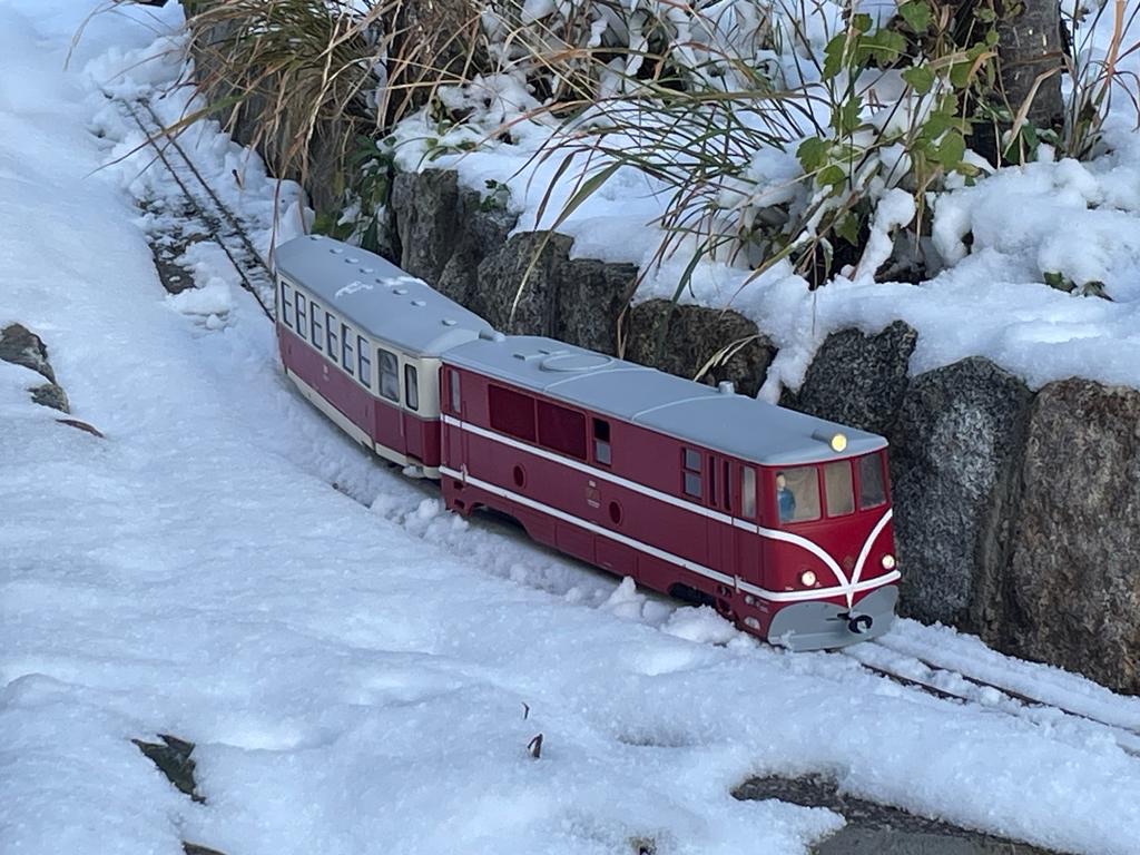 V první řadě přeji všem příznivcům obdobných aktivit vše nejlepší do nového roku, zejména hodně zdraví a nových přírůstků. Budu teď pokračovat ve volném monologu. Jak již zaznělo v předchozích příspěvcích, minulý rok byl zasvěcen stavbě alespoň části tratě, aby mohly být reálné jízdní vlastnosti modelů ověřeny v provozu a návazně upraveny jak pojezdy modelů, tak parametry dalších stavěných úseků. Zatím to vypadá, že si vše tak nějak zhruba k sobě sedne, ukázalo se jen, že použití dvojkolí s 1 mm okolky je v zahradních podmínkách nereálné, potřeba je použít okolky minimálně 1,5 mm u podvozkových vozů a u dvounápravových vozů, kde hrozí na špatné geometrii přizvednutí některých kol, ideálně 2 mm. I 2 mm okolek je naštěstí možné použít na kolejivu Peco SM-32, takže tato záležitost si nevyžádá žádné neproveditelné změny. U tratě je potřeba hlídat geometrii v oblouku, přechodnice a možné "vrtule", na kterých může dojít u delších vozů k vykolejení. Naopak jako bezproblémový se ukázal provoz na velkém stoupání 60 promile (a následně oblouku) v počátku tratě, kde jsou adhezní vlastnosti lokomotiv o hmotnosti cca 2,5 kg dostatečné s ohledem na uvažované běžné délky souprav do 3 metrů (resp. v budoucnu TU a 4 těžké Balmy). Uvažovat o menších poloměrech oblouku než je 130 cm ale příliš nelze s ohledem na jízdní odpory dvounápravových vozů s větším rozvorem. To se ukázalo při vánočních zkouškách s nově dodanými brzdovými vozy D/ú, kde je rozvor 4 m (skoro 18 cm) už na hraně a na vozbu příliš dlouhých souprav to nevypadá. Nejspíš pak nepůjde provozovat čtyřnápravové vozy na podvalnících s ohledem na přílišné příčné vyosení v obloucích a "přenárazníkování" s okolními vozy při spřažení šroubovkami. Toto by asi šlo snadno ošetřit tím, že mezi háky šroubovek bude umístěna pevná tyč, která vymezí potřebnou délku mezi nárazníky. Každopádně toto nebylo v první fázi výstavby ani uvažováno a sloužit to může spíše pro další zájemce, kteří by se do takového projektu železnice v měříku IIe někdy pustili a měli možnost využít ještě větší poloměry oblouků (tam jen musí počítat s tím, že zatím nejspíše nejsou dostupné výhybky s mírnějším poloměrem). No a ve vozovém a lokomotivním parku se toho o moc víc než dodávka brzd a zkušebního páru podvalníků (zatím s pevnou vidlicí) nepovedlo - je to ale i tak velký splněný sen. Na samém sklonku roku se podařilo konečně digitalizovat Faura s použitím zahraničního dodavatele zvuku, ale bude to chtít ještě nějaké ladění. Letošní rok bude ve znamení dokončování stávajícího parku, který se už slušně rozrůstá, ale dotahování některých projektů nezbývá nikdy čas. Přikládám pár fotek a obligátní videa z prorážení závějů.