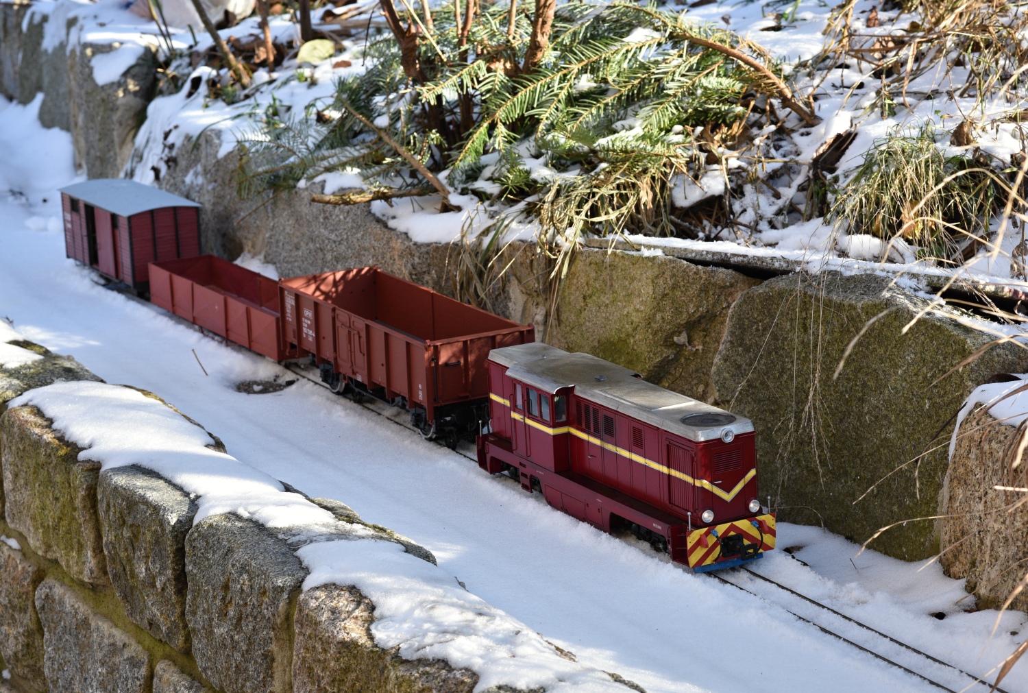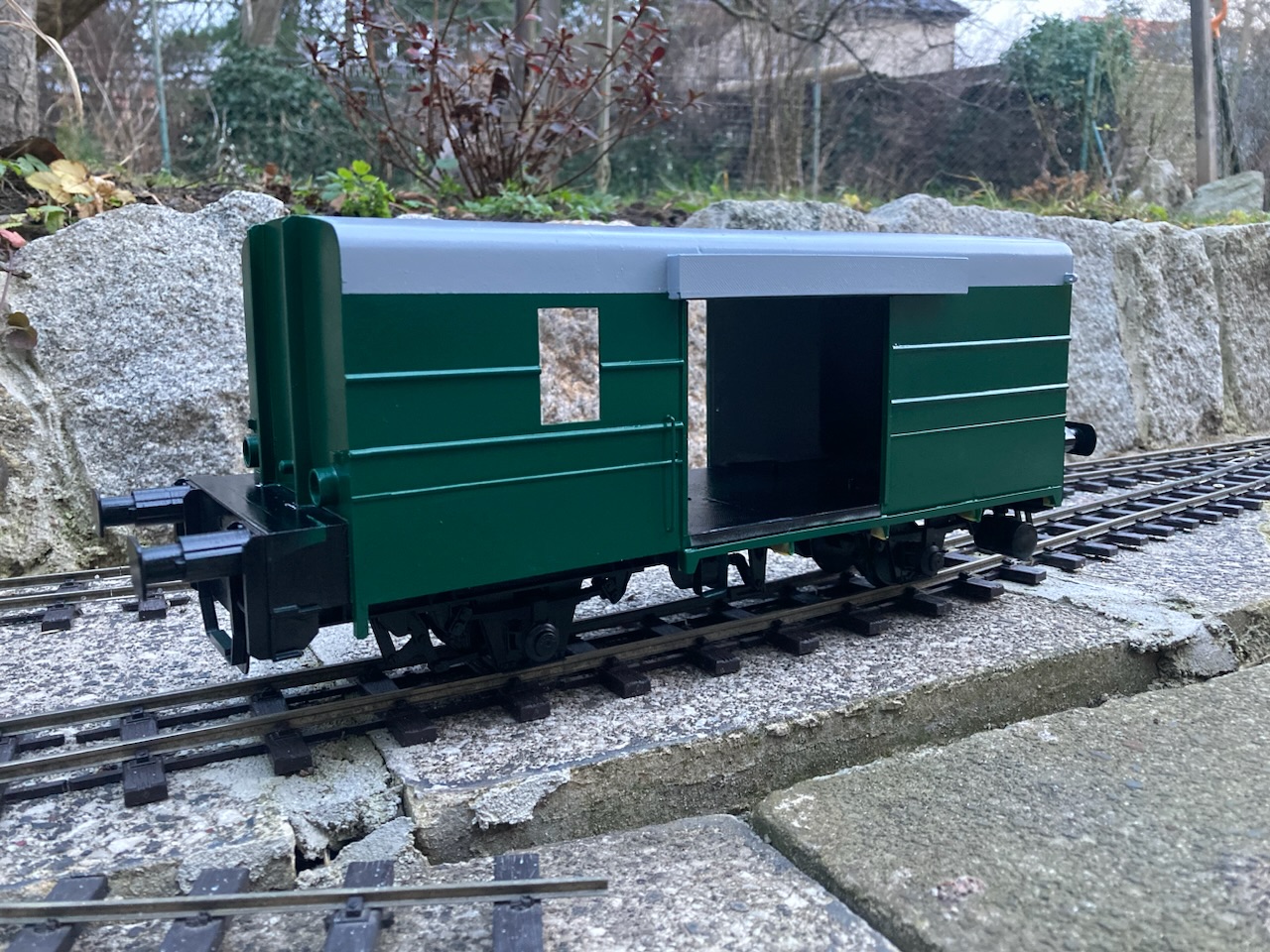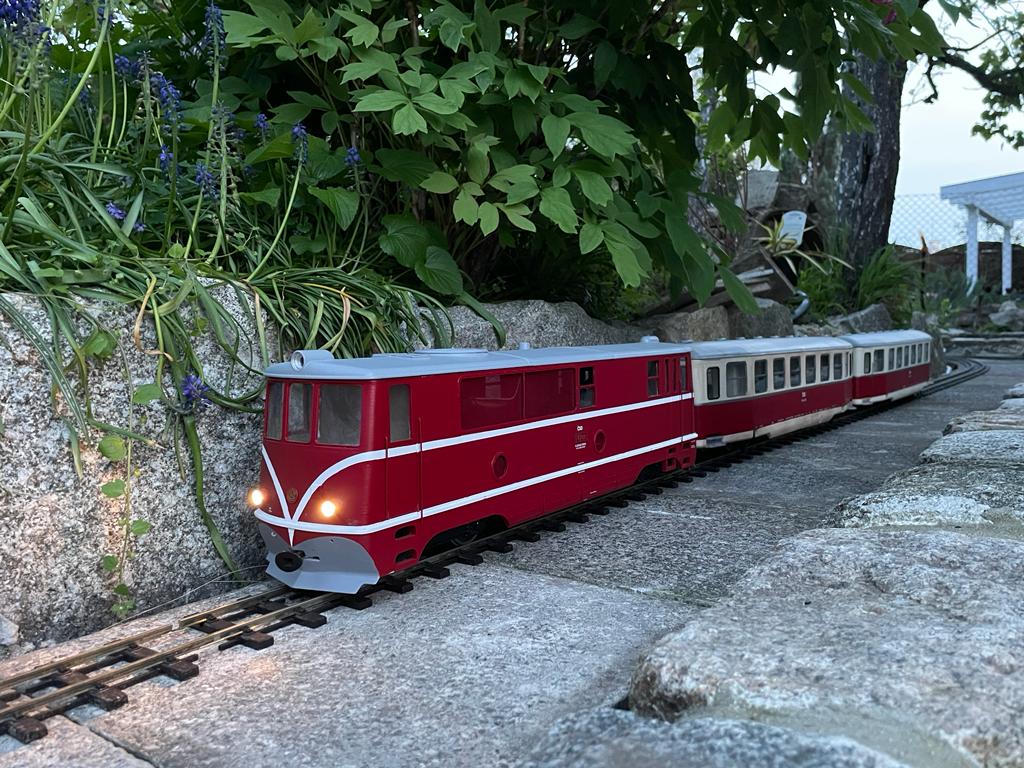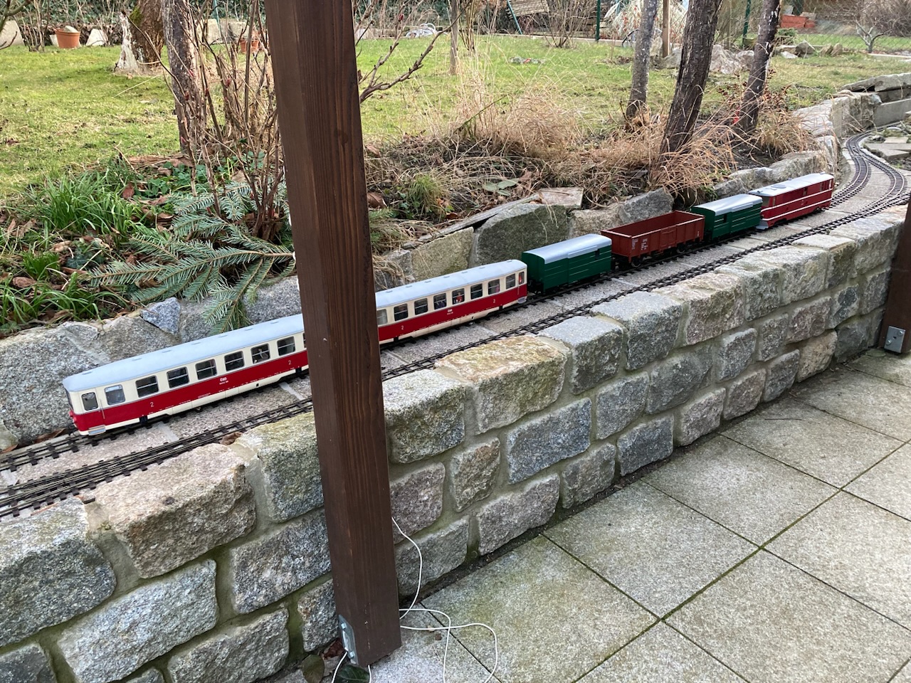 V první řadě přeji všem příznivcům obdobných aktivit vše nejlepší do nového roku, zejména hodně zdraví a nových přírůstků. Budu teď pokračovat ve volném monologu. Jak již zaznělo v předchozích příspěvcích, minulý rok byl zasvěcen stavbě alespoň části tratě, aby mohly být reálné jízdní vlastnosti modelů ověřeny v provozu a návazně upraveny jak pojezdy modelů, tak parametry dalších stavěných úseků. Zatím to vypadá, že si vše tak nějak zhruba k sobě sedne, ukázalo se jen, že použití dvojkolí s 1 mm okolky je v zahradních podmínkách nereálné, potřeba je použít okolky minimálně 1,5 mm u podvozkových vozů a u dvounápravových vozů, kde hrozí na špatné geometrii přizvednutí některých kol, ideálně 2 mm. I 2 mm okolek je naštěstí možné použít na kolejivu Peco SM-32, takže tato záležitost si nevyžádá žádné neproveditelné změny. U tratě je potřeba hlídat geometrii v oblouku, přechodnice a možné "vrtule", na kterých může dojít u delších vozů k vykolejení. Naopak jako bezproblémový se ukázal provoz na velkém stoupání 60 promile (a následně oblouku) v počátku tratě, kde jsou adhezní vlastnosti lokomotiv o hmotnosti cca 2,5 kg dostatečné s ohledem na uvažované běžné délky souprav do 3 metrů (resp. v budoucnu TU a 4 těžké Balmy). Uvažovat o menších poloměrech oblouku než je 130 cm ale příliš nelze s ohledem na jízdní odpory dvounápravových vozů s větším rozvorem. To se ukázalo při vánočních zkouškách s nově dodanými brzdovými vozy D/ú, kde je rozvor 4 m (skoro 18 cm) už na hraně a na vozbu příliš dlouhých souprav to nevypadá. Nejspíš pak nepůjde provozovat čtyřnápravové vozy na podvalnících s ohledem na přílišné příčné vyosení v obloucích a "přenárazníkování" s okolními vozy při spřažení šroubovkami. Toto by asi šlo snadno ošetřit tím, že mezi háky šroubovek bude umístěna pevná tyč, která vymezí potřebnou délku mezi nárazníky. Každopádně toto nebylo v první fázi výstavby ani uvažováno a sloužit to může spíše pro další zájemce, kteří by se do takového projektu železnice v měříku IIe někdy pustili a měli možnost využít ještě větší poloměry oblouků (tam jen musí počítat s tím, že zatím nejspíše nejsou dostupné výhybky s mírnějším poloměrem). No a ve vozovém a lokomotivním parku se toho o moc víc než dodávka brzd a zkušebního páru podvalníků (zatím s pevnou vidlicí) nepovedlo - je to ale i tak velký splněný sen. Na samém sklonku roku se podařilo konečně digitalizovat Faura s použitím zahraničního dodavatele zvuku, ale bude to chtít ještě nějaké ladění. Letošní rok bude ve znamení dokončování stávajícího parku, který se už slušně rozrůstá, ale dotahování některých projektů nezbývá nikdy čas. Přikládám pár fotek a obligátní videa z prorážení závějů.