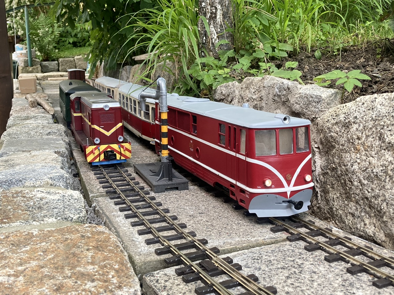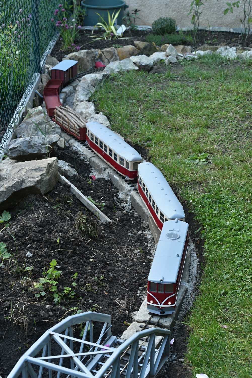 Tak konečně se mi podařilo oživit digitalizované TUčko a připravit z větší části pláň spodního nádraží, čímž pádem mohly konečně - po třech letech od zahájení celého projektu - vzniknout tyto fotky (a ozvučené video, ale to znáte od Nadkachny :D ). V následujících týdnech a měsících proběhne propojení obou nádraží alespoň jednou stranou a stavba definitivního kolejiště spodního nádraží, které bude mít dvě průjezdné dopravní koleje, depo pro jednu lokomotivu, krátkou odstavnou kolej u depa a jednu kusou kolej s rampou pro vykládku a nakládku nákladních vagónů (snad jednou těch normálněrozchodných na podvalnících). Horní nádraží bude do konce roku upraveno z provizoria do stabilnějšího stavu v podobě tříkolejné stanice. Každé nádraží bude mít dvě koleje dlouhé přes 4 metry, takže bude možné jezdit s vlaky délky cca 100 metrů v reálu. Víc se na mojí zahradu nevejde... Až vznikne jednou celý ovál a odbočka, tak bude možné v cílovém stavu provozovat 4 - 5 souprav + normálněrozchodný posun na podvalníkovou jámu. Jak už jsem psal, do důchodu bude co dělat :mrgreen: