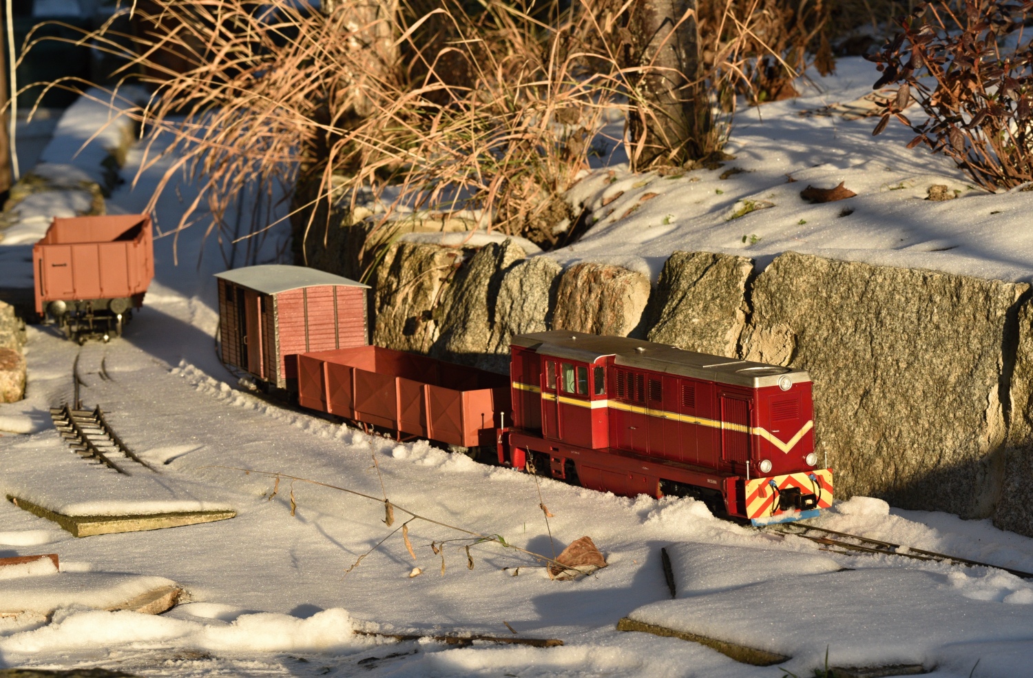Poslední měsíc byl velmi produktivní co se týče pokroku na vozidlovém parku. Podařilo se konečně digitalizovat a rozjezdit Faura s pomocí správných zvuků, téměř dokončit brzdové vozy (už chybí jen popisky a pár drobností) a dotáhnout druhého Balma, kterému chyběla červená skla do koncovek (komu by se chtělo do ručního broušení těch čoček..). Dneska jsem provedl pokus s delší soupravou (2 Balmy za brzdama s uhlákem), bude to chtít úpravy nivelety "nad mostem", tam je trať skutečně nějak do vrtule a podvalníky vypadávají. No konečně to vypadá jako vlak :P Jakmile se oteplí, tak už na vozidla zase nebude tolik čas.. První tři fotky ještě z minulého víkendu, sněhu bylo tak akurát, ale výhybky beznadějně zamrznuté a dost obtížně likvidovatelný led i přímo z hlav kolejnic.