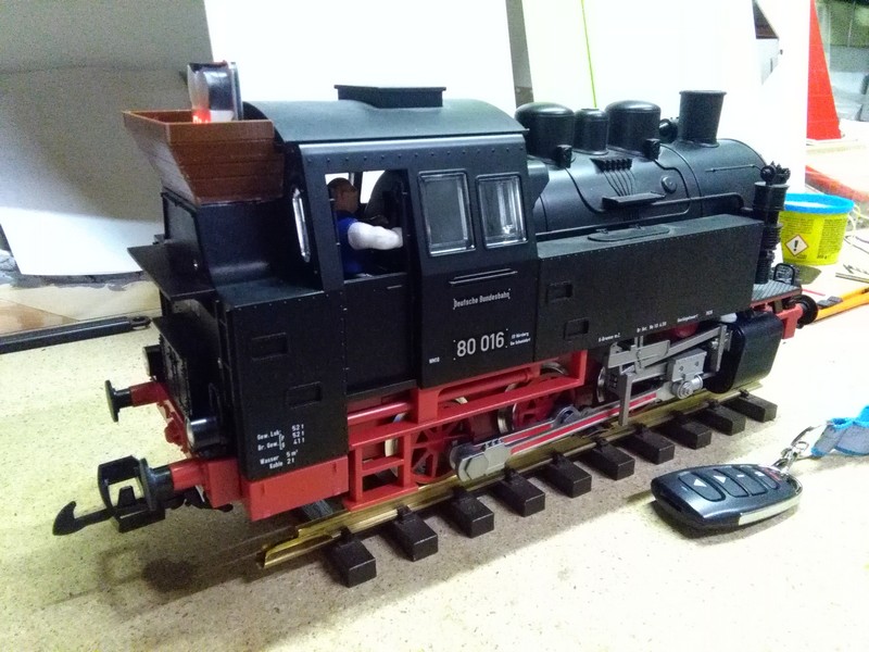 Konečně zbývá drobet času na vláčky. Jelikož se mě zalíbilo ovládání ovladačem Piko 35040 tak jsem ho nainstaloval už do druhé mašiny. Na uhlí jsem přidal vytištěnou nástavbu a v ní jsou konektory na nabíjení a pro hlídač baterek. Tříčlánek lipolek je na podlaze kabiny a na nich sedí mašinfíra. Bohužel jsem mu musel amputovat nohy. :wink: Vypínač (přepínač) na nabíjení/provoz je v podvozku za schody do budky. Je to paráda si zajezdit a nerozbalovat elektriku. :)
