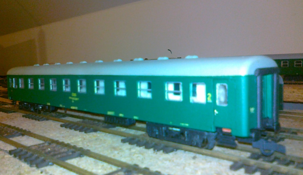 Konečně jsem dodělal 4 dveřovou Ba. Jedná se o přestavbu z maďarského vozu Fuggerth. Inspirace je od Milana Č. z Parostroje. Baika by měla odpovídat stavu v cca koncem 70-tých let, po laku, tedy už bez podélného proužku pod okny. Při přestavbě byly doplněny větráky (vlastní výroby - v případě zájmu mohu nabídnout) upraveny dveře, čela vozů, upraveny podvozky (jha), upravena okna na představcích a doplněný interiér (karton), samozřejmě nový lak a obtisky. V pozadí je druhý rozestavěný vůz Bai (velkoprostorový) a další připravený na přestavbu.