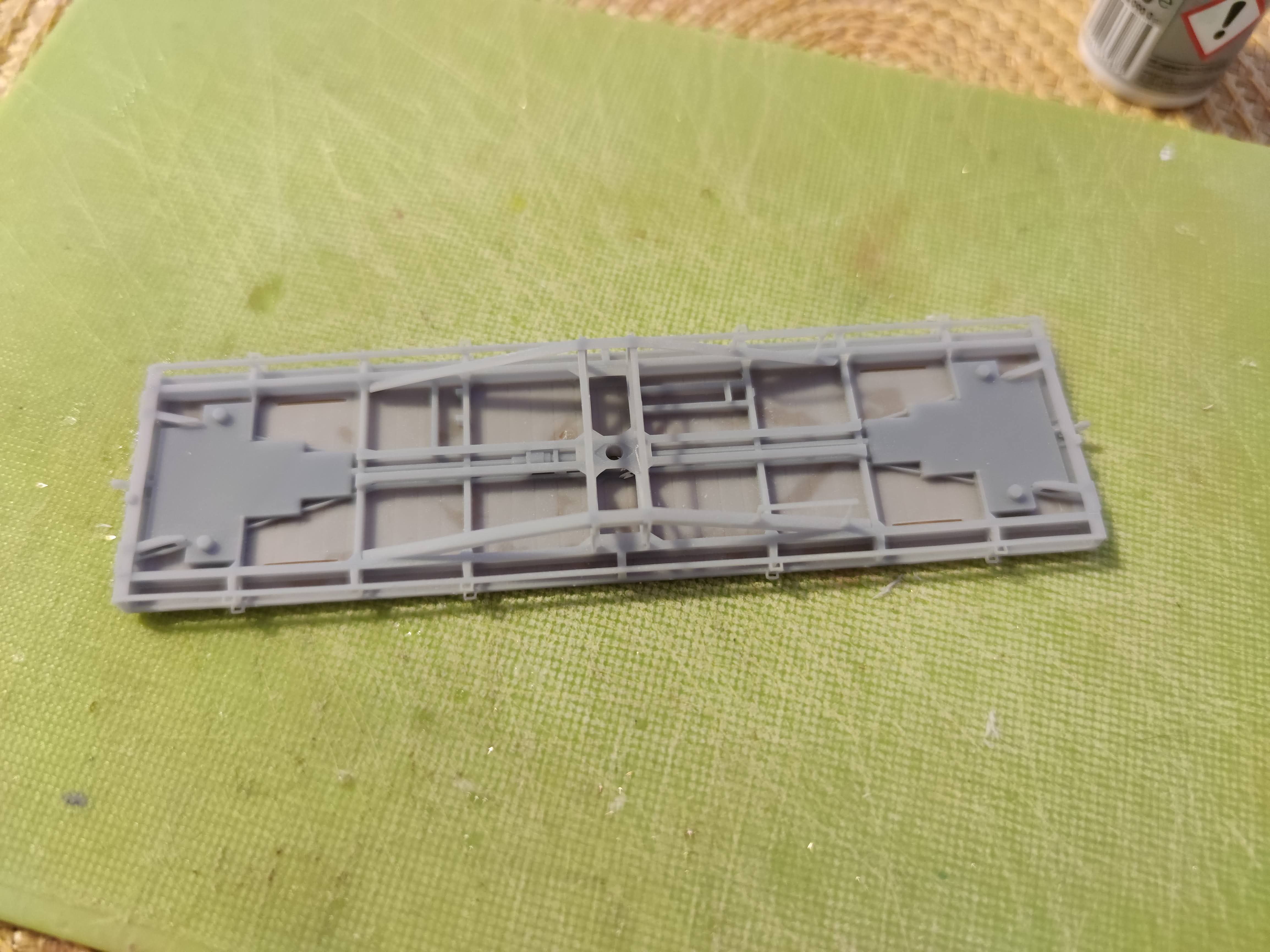 Opracovaný rám vozu s podlahou. Pro zasunutí kinematiky po lakování je třeba odbrousit naznačení šikmých nosníků k čelníku a snížit aretační čepy tak, aby následně kinematika zajela pod spojovací tyč špalků.