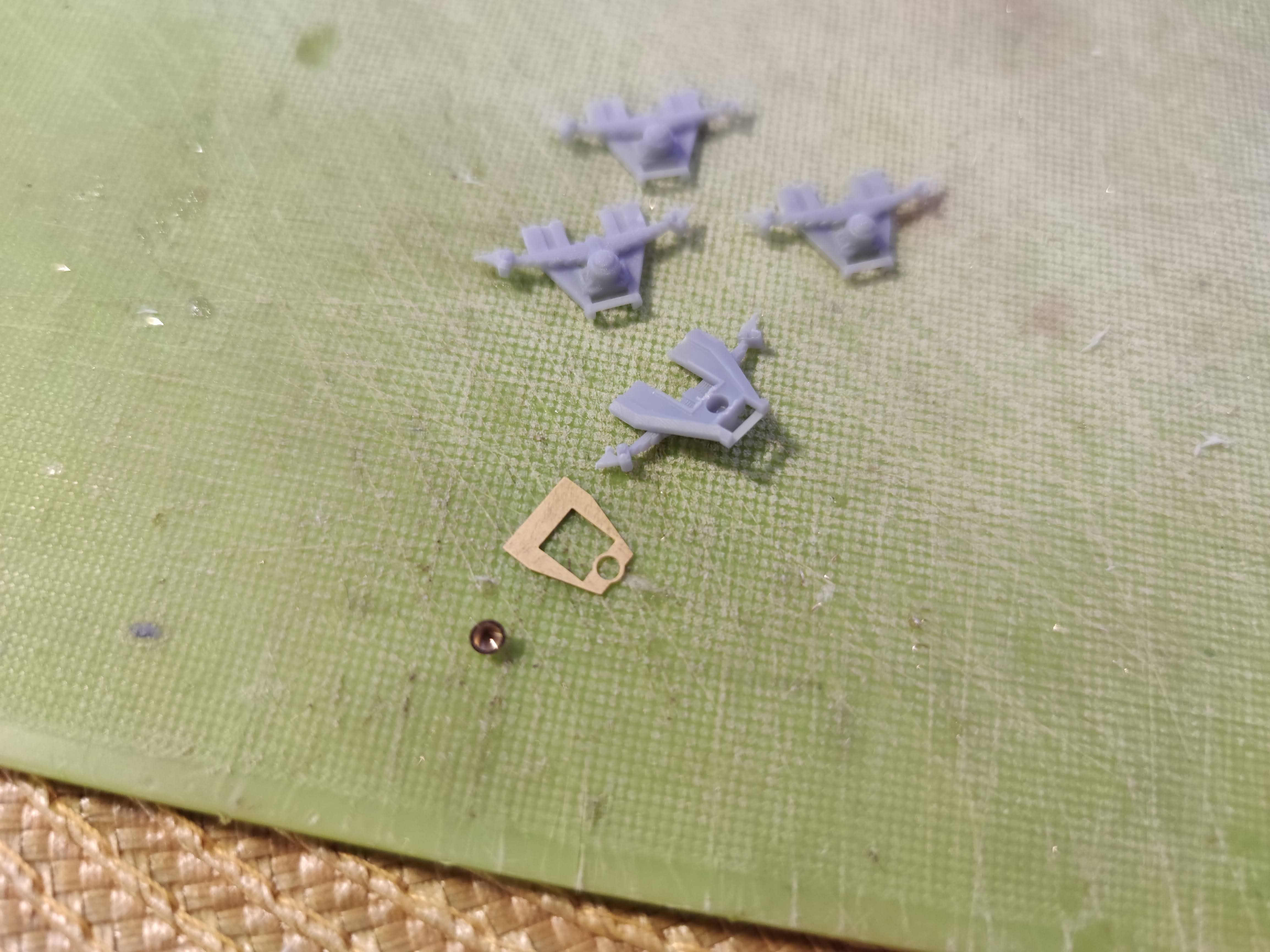 Dírku pro zasunutí oplenu jsem lehce projel vrtáčkem pro lehké zasunutí. Pohyblivý oplen je třeba montovat dřív než spodní partie vozu. Je třeba zasadit trubičku jak do rámu tak do oplenu, které po zasunutí do sebe vytvoří kluzné ložisko. Pro otěrové plochy styku opleun a rámu a dále zajištění ze spod je ve stavebnici přibalen aršík s vyleptanými podložkami. Pro možnost lakování bokem se může oplen zajistit po kompletaci stavebnice. bude to ale více problematické kvůli přístupnosti.