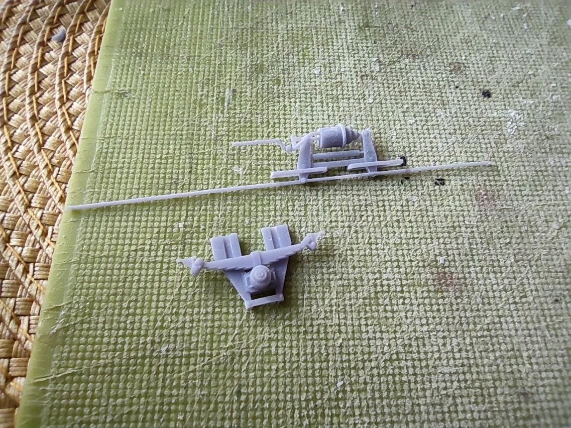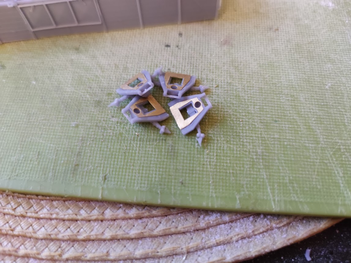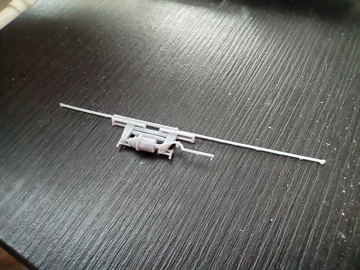 Přilepení řetězů stupaček, ovládání brzdového mechanismu, mřížky madel a jiných drobností provádíme namáčením do lepidla mimo bočnice abychom si nezalívali detaily tisku, zejména textury dřevěných desek.
