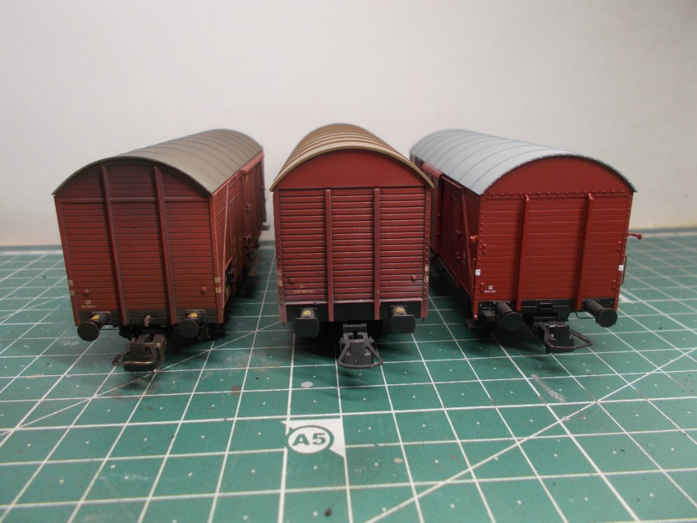Tak na fotce je Oppeln v odstínu RAL 8009 neboli Vallejo Cavalry Brown alias Humbrol Matt C37, uprostřed je Ztr v odstínu ČSN 8440 a vpravo je Ztrcc v odstínu RAL 3013. Jak ČSN 8440 tak i RAL 3013 mě pro vozy ČSD připadají zcela autentické, bylo tedy nutno rozhodnout co na vozy Ztr ve stavu z výroby. Zvolil jsem RAL 3013 protože Vtr na videu z 50.let jsou červenější. Váhal jsem ještě jestli nedat tu Cavalry Brown jak má Oppeln vlevo. Tu davám na vozy ČSD ze druhé epochy. Ale rozhodlo to video. RAL 3013.