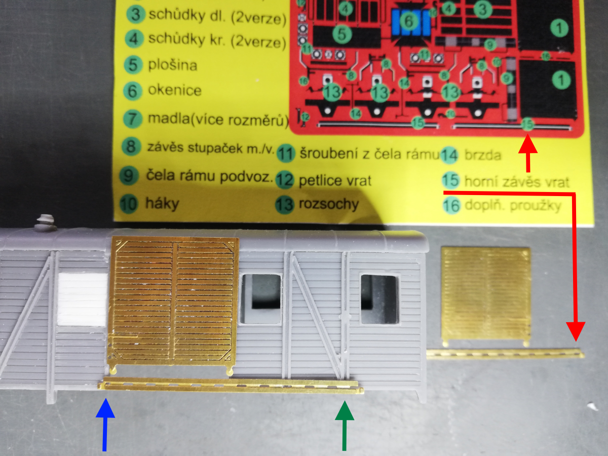 1) Kam umístit lept č. 15 - horní závěs vrat? Nejdřív jsem myslel, že nad vrata, ale i podle obrázků reálného vozu by to odpovídalo spíše kolejnici pro pojezd vrat - tudíž dole. Proč ale "horní"?