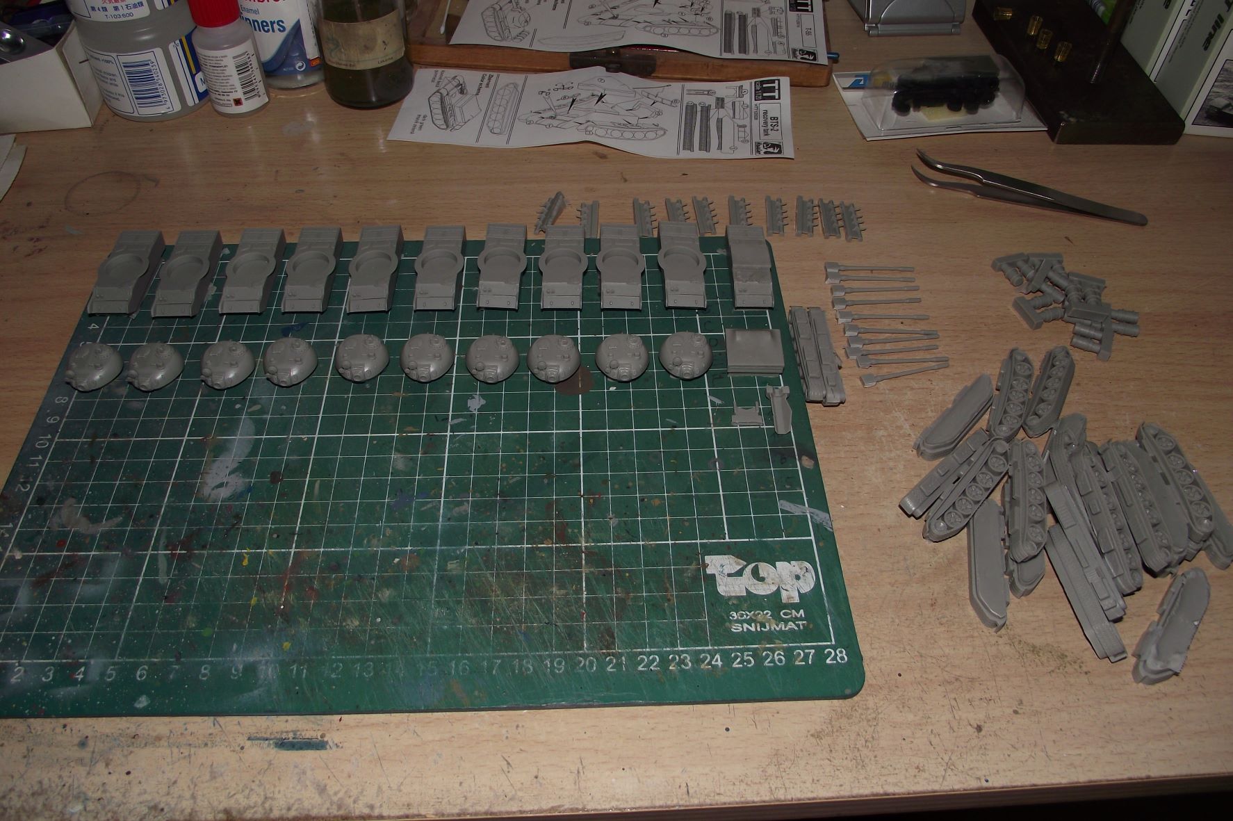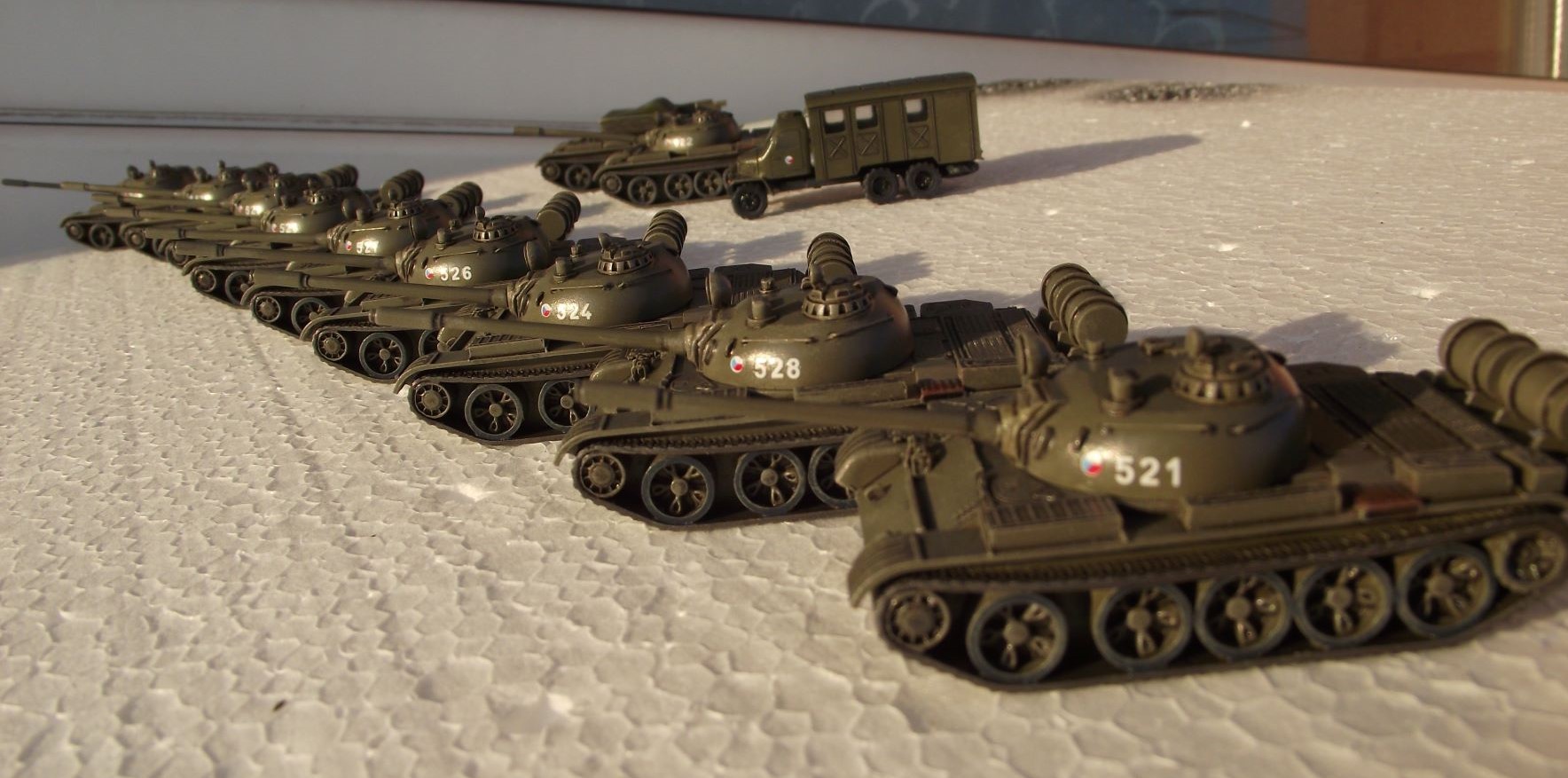 I když jsem hánulkář, před časem jsem dělal na zakázku tanky T55, ve velikosti TT, od firmy Hauler, určené na vozy Px, Pxx. Celkem deset tanků, jeden vyprošťovací a nějaká doprovodná vozidla. Stav by měl odpovídat podobě ze sedmdesátých let. Původně měli být tanky, podle vzpomínek pamětníka, kamuflované nejméně dvěma barvami. K tomu se ale nepodařilo dohledat žádnou fotodokumentaci, takže volba nakonec padla na standartní khaki. V současnosti jezdí na kolejišti KŽM Velké Meziříčí. Fotky třeba někoho potěší nebo inspirují. :D