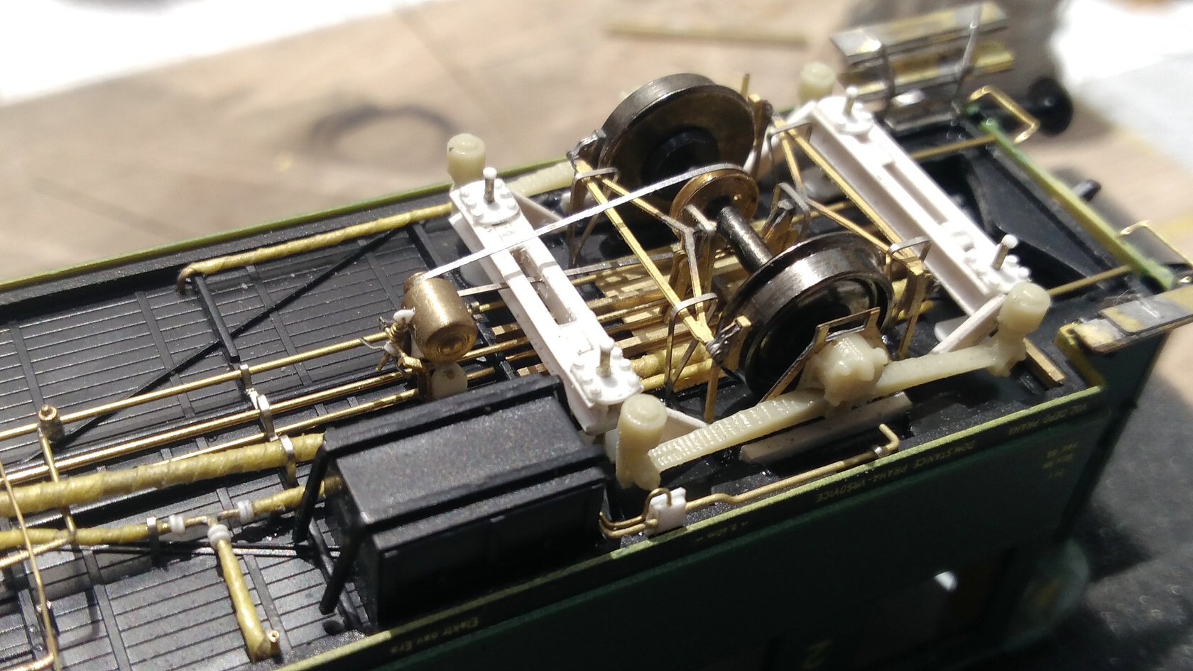 Následně je nutná jemná "operace" pomocí žiletkové pilky, kterou jsem odstranil původní listové pružnice, rozsochy až po hraníky. Ty musejí zůstat na svých místech. Následovala úprava na rozměr a osazení odlitku rozsochy s ložiskem 45V z produkce BV model. Nutno bylo také dosadit leptanou "kostru" rozsochy od p. Banka.