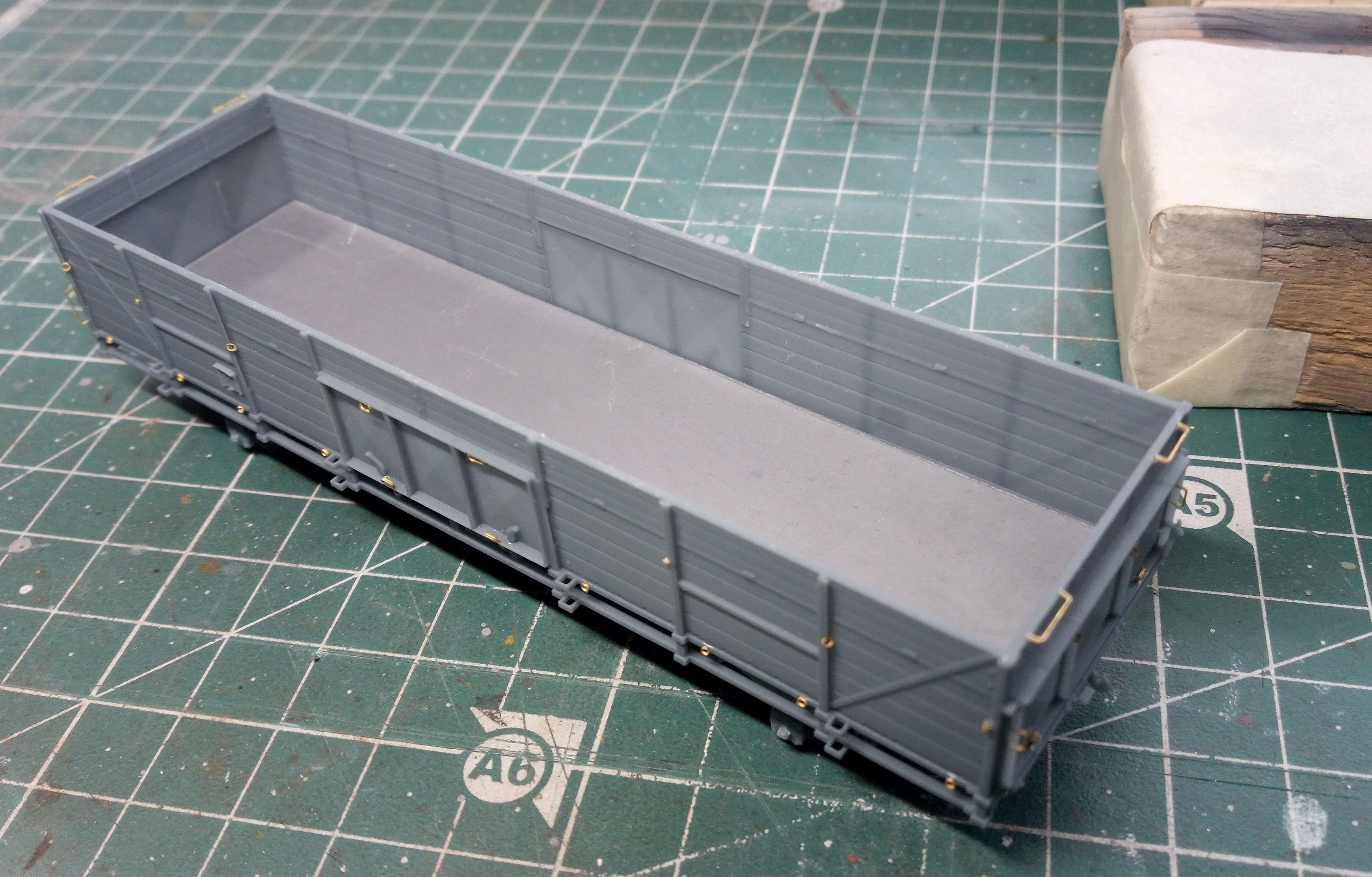 Netušil jsem, že i u těchto vozů se při opravách dosazovala kombinovaná podlaha, to je zajímavá informace. Vnitřek bych chtěl ještě po nástřiku filtru trochu ušpinit práškovými patinátory. Skříň zvenku je lehce napatinována tmavým washem, pak ještě přijde na řadu podvozek . :D