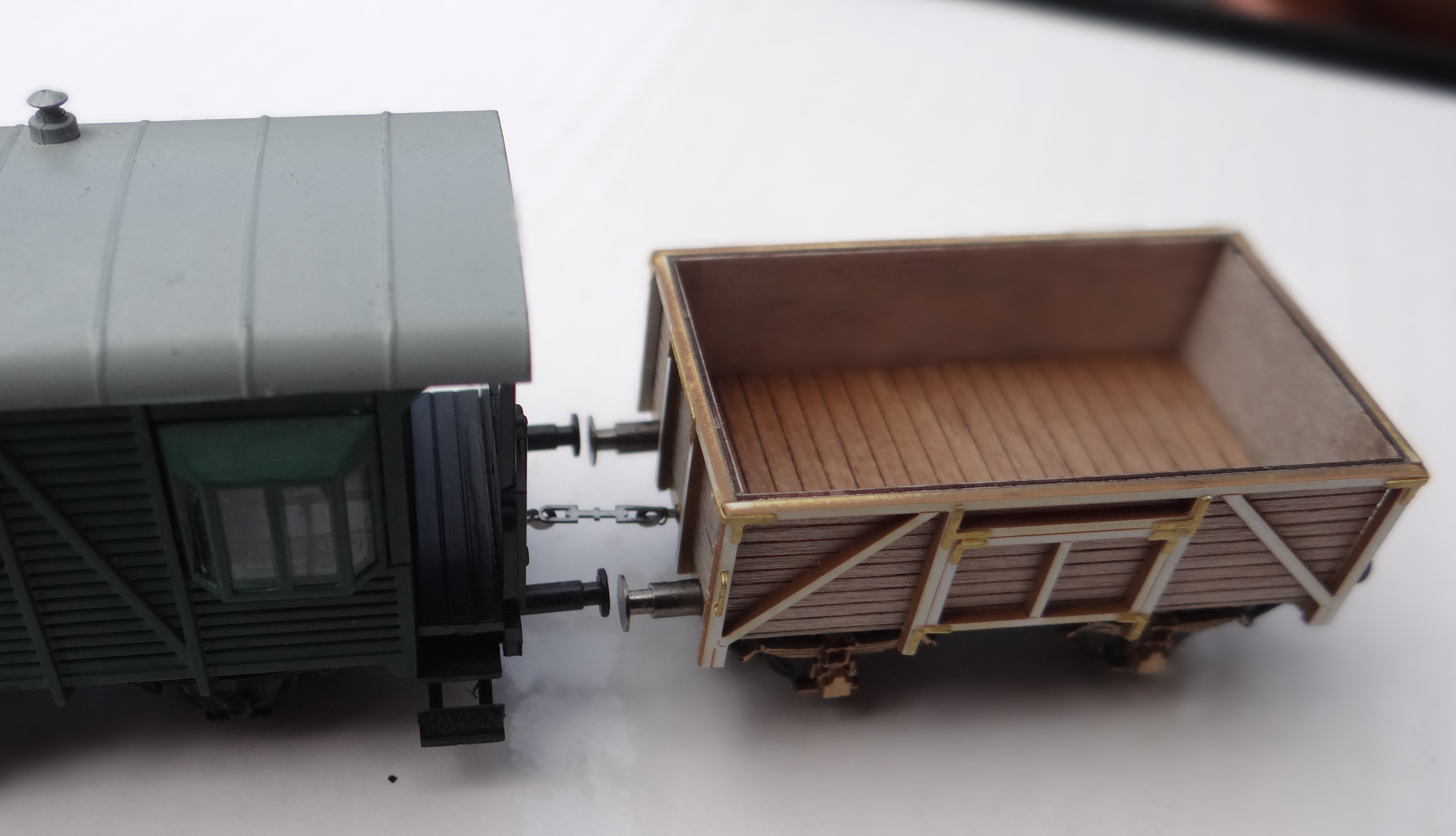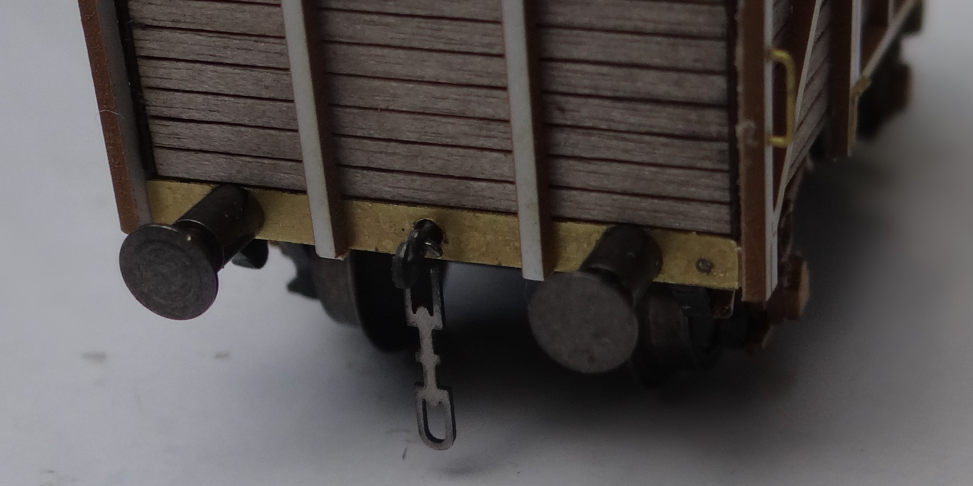 Ráno se člověk probudí a má v mnoha věcech jasno, takže než si lámat hlavu a složitě se dopracovávat k jednoduchým vzorečkům, se dá věc vyřešit exaktním nákresem v přesných mírách v CORELLu. Takže jsme nakreslili oblouk o poloměru 631 mm (poloměr výhybek TILLIG EW-2), tímto obloukem jsme proložili obdélníčky velikosti 166 x 18,6 mm, což je obrys vozu pro převoz 3 kontejnerů v délce přes nárazníky 166 mm a šířce přes nárazníky 18.6 mm (počítám talíř o průměru 4 mm), no a ukázalo se, že maximální nutná vzdálenost mezi talíři nárazníků dvou takových vozů spojených k sobě je 2,43 mm. To si myslím, že je přijatelné, vzhledem k tomu, že to je extrém. Pro délku od středu čelníku ke středu čelníku sousedního vozu pak vychází 2,43 mm plus součet délky použitých nárazníků. Takže žádné 4 mm, jak jsem se obával. Navíc ve 2.epoše se nepoužívaly hranaté nárazníky, takže je tam ještě rezerva vyplývající z normálního TT nárazníku s kruhovým tvarem talíře o průměru do 3,5 mm. Zatím jsem neřešil převislé délky nad rozvor, protože jsem přesvědčen, že na tyto dvě hodnoty nemají žádný vliv. Tímto je ovlivněna nutná minimální hodnota průměru talíře nárazníků, ale protože při uvedených hodnotách se talíře nárazníků přiblíží ne víc jak na dotek, tak žádné vzpříčení nehrozí a tudíž vkládat do výpočtů ještě tyto převislé délky není podle mě třeba. Dále nepředpokládám použití háku a šroubovky na vozy s přechodovými měchy či návalky, tam je aplikace nevhodná z důvodů téměř nemožné manipulace při spojování, takže si myslím, že limitní délka přes nárazníky 166 mm pro čtyřnápravové nákladní vozy a osobní vozy bez krytých přechodů je OK. Dále jsem při návrhu toho nákresu odhalil nutnost mírné úpravy tvaru šroubovky na konci, kde visí na háku, což bude nutné u dlouhých vozů. U těch St a Ds, na kterých to už mám zabudované, tato nutnost není, nicméně by nebylo vhodné konstruovat pro každý vůz jinou variantu, tak v další zhotovované sérii se tvar upraví, aby to bylo v jedné verzi použitelné obecně. Během dneška soupravu nafotíme a fotky sem vyvěsím.