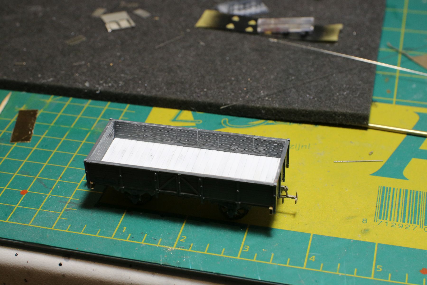 Vytáhl jsem totiž pár starších vozů s tím, že je malinko upravím a vylepším. První se dostala na stůl dvojice oplenů z roku 1922. Šly dolů nepovedené původní nápisy i s barvou, doplnil jsem potrubí tlakové brzdy, odpružil nárazníky a vyměnil na bocích poškozené profily podlahy (ještě na obrázku chybí jedna kluznice) a můžou do lakovny