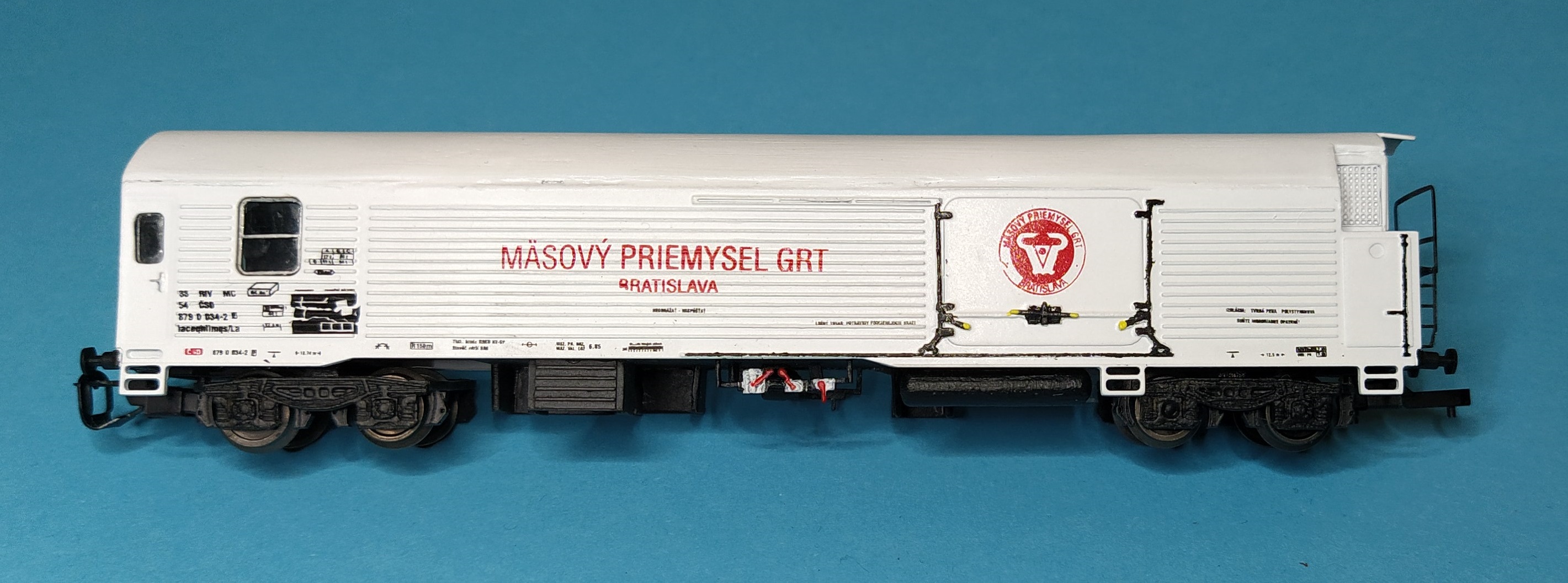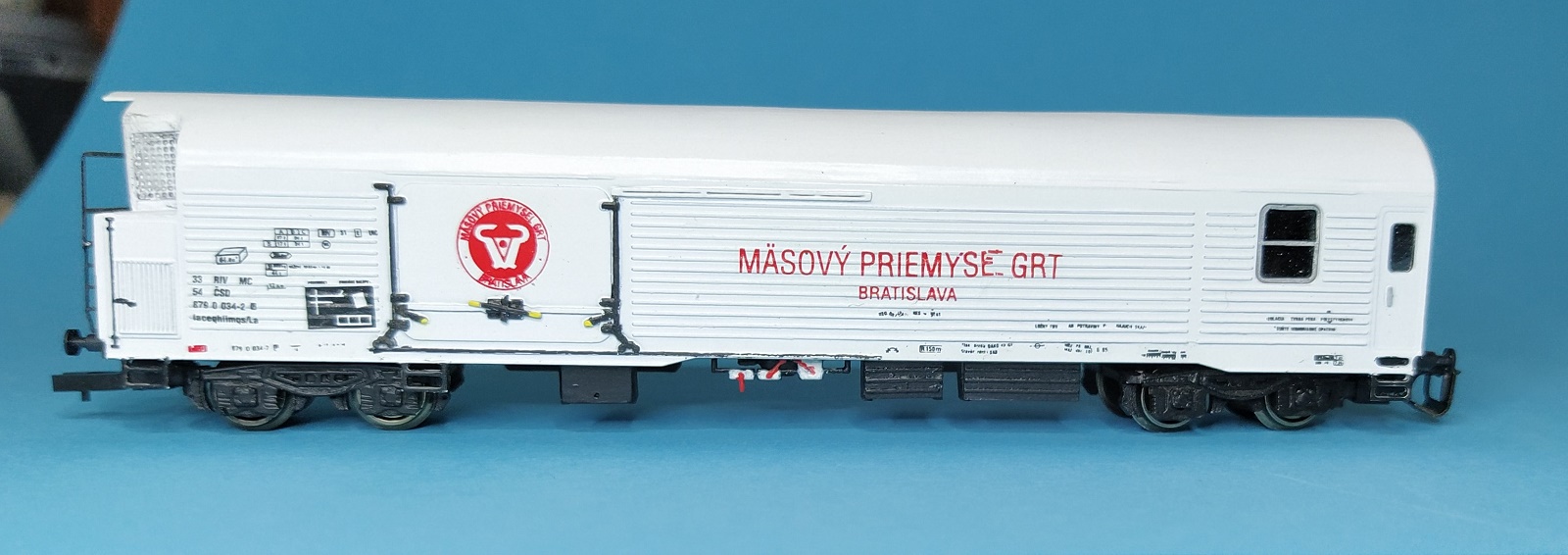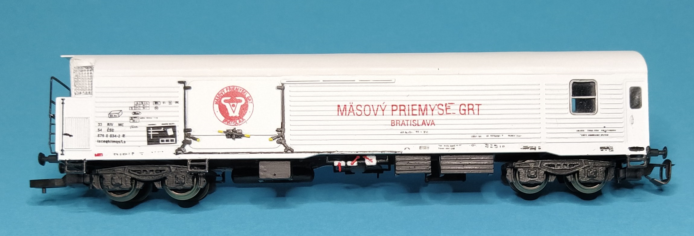 V provedení ČSD byly tyto vozy ještě s popisy Masný průmysl Praha a Mrazírny Praha. Ale na sestavení obtisků mám hodně málo podkladů. Z těch fotek ce se dají najít na netu, nejdou přečíst inventární čísla, vlastně krom velkých nápisů na bočnicích nic víc. Osobně bych taky dal přednost Masnému průmyslu nebo Mrazírnám, takže bych na stávajících obtizcích jen nahradil loga. Obávám se že by takový čin u většiny modelářů nenašel pochopení 8).