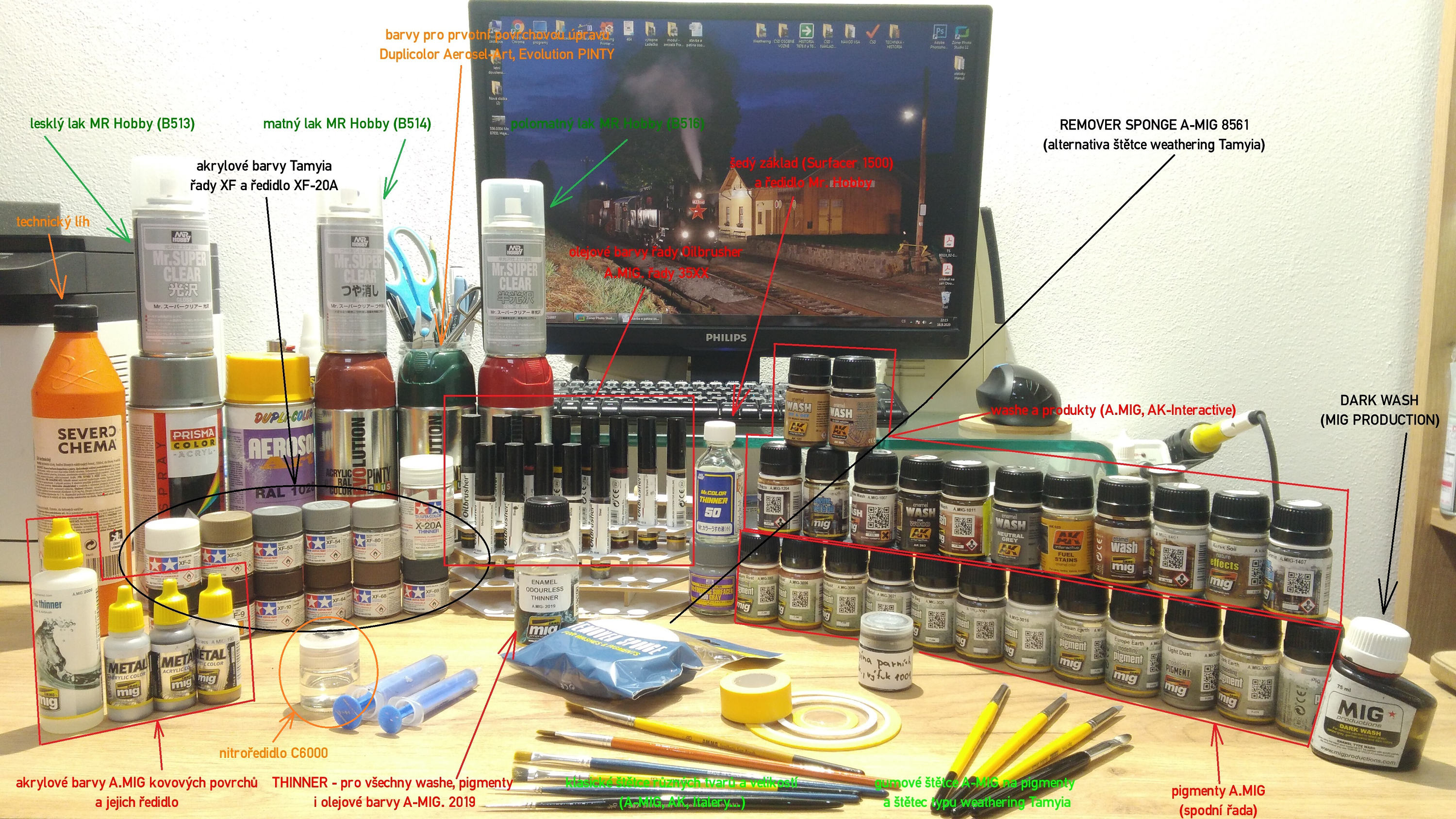 https://www.modelartikl.cz/produkt/1544 ... egorie=238A nakonec zcela vlevo pod barvami Tamyia jsou akrylové barvy pro vytváření kovových povrchů A-Mig. Používám pouze pár odstínů, které se i tak dostanou ke slovu velmi málo.