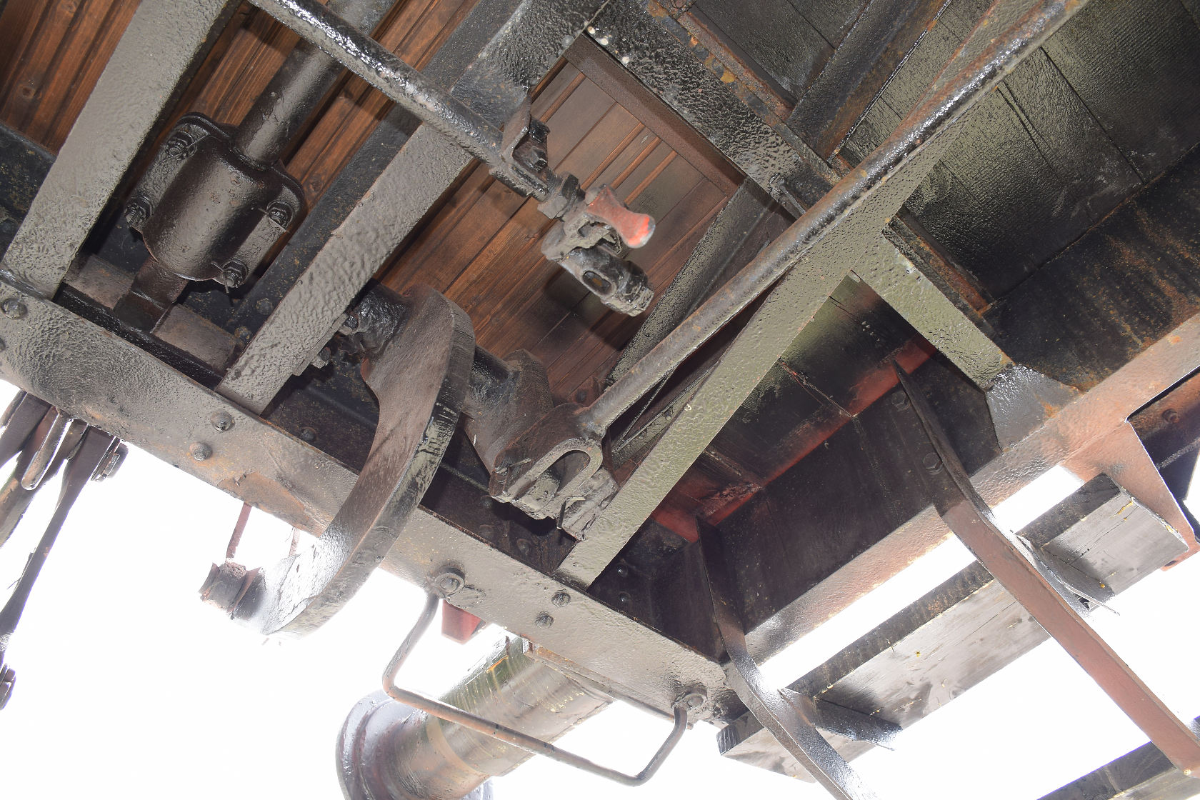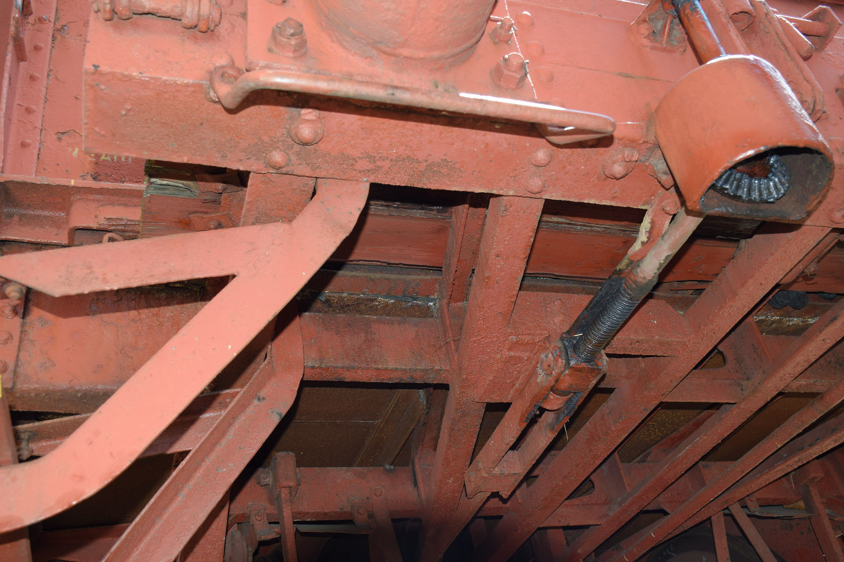 Ovšem dál teď nevím zda si přesně rozumíme "hřídel s úhlovou pákou". Studováním podkladů vozů s brzdařskou budkou ať již s dřevěnou či plechovou, kde je provedení táhla s úhlovou pákou totožné jsem již dřívě zjistil, že u vozů, které mají pouze brzdařskou plošinu je provedení pohonu ruční brzdy odlišné. U těchto vozů je úhlová páka s táhlem nahrazena vřetenem s převodovkou. Viz foto niže u vozu s brzdařskou plošinou a sklopným zábradlím.