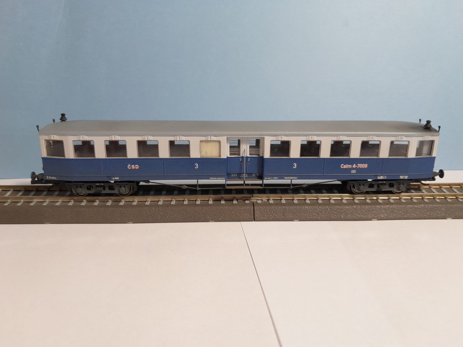 Dokončil jsem vůz Calm 4-7009 ve stavu odpovídajícímu jen krátké době provozu. Odchylkou od skutečnosti je hlavně chybějící zaoblení spodní hrany skříně, které by z leptu nešlo rozumně vyřešit. Nicméně mě tato nijak odchylka netrápí.