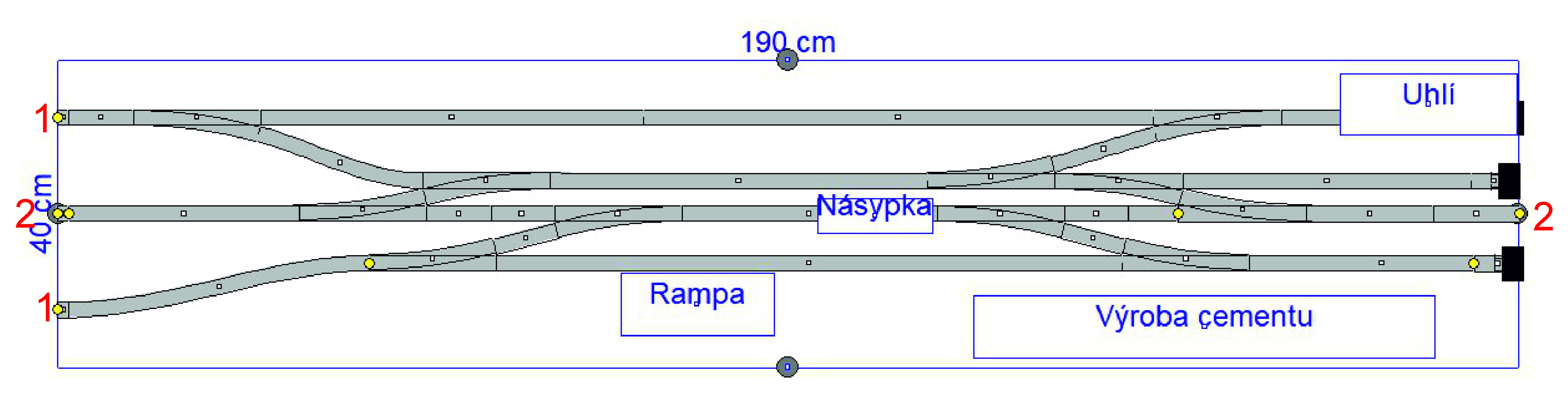 Body pod číslem 1: vjezd do areálu, osa kolejnice musí být 7cm od hrany modulu