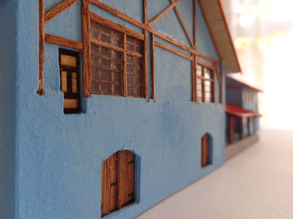 budovy a v ní stavební otvory (okna,dveře) řežu ručně.Krytina jsou jen natištěné pásky.Jednotlivé pásky lepím na podklad imitujicí nosnou střechu.