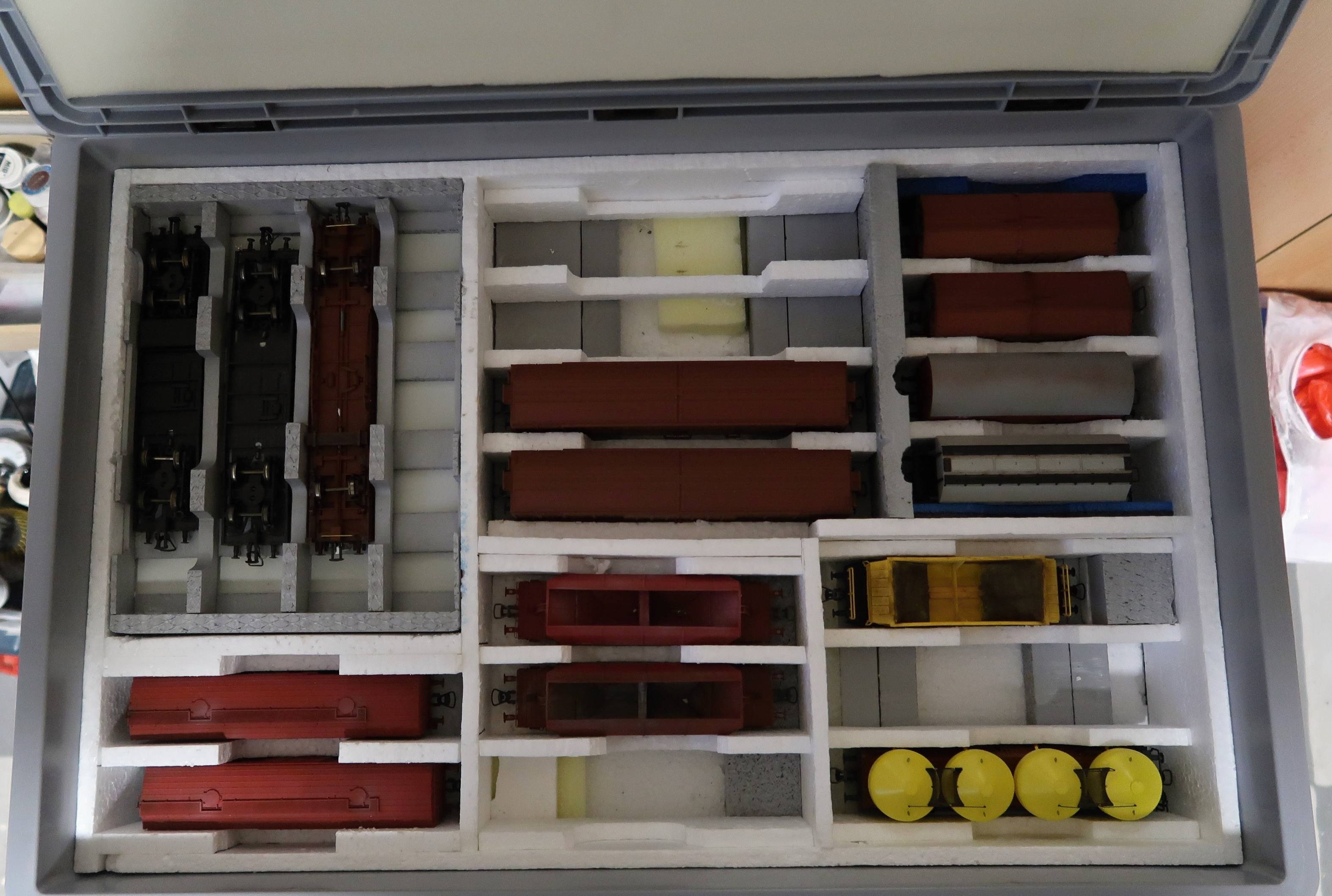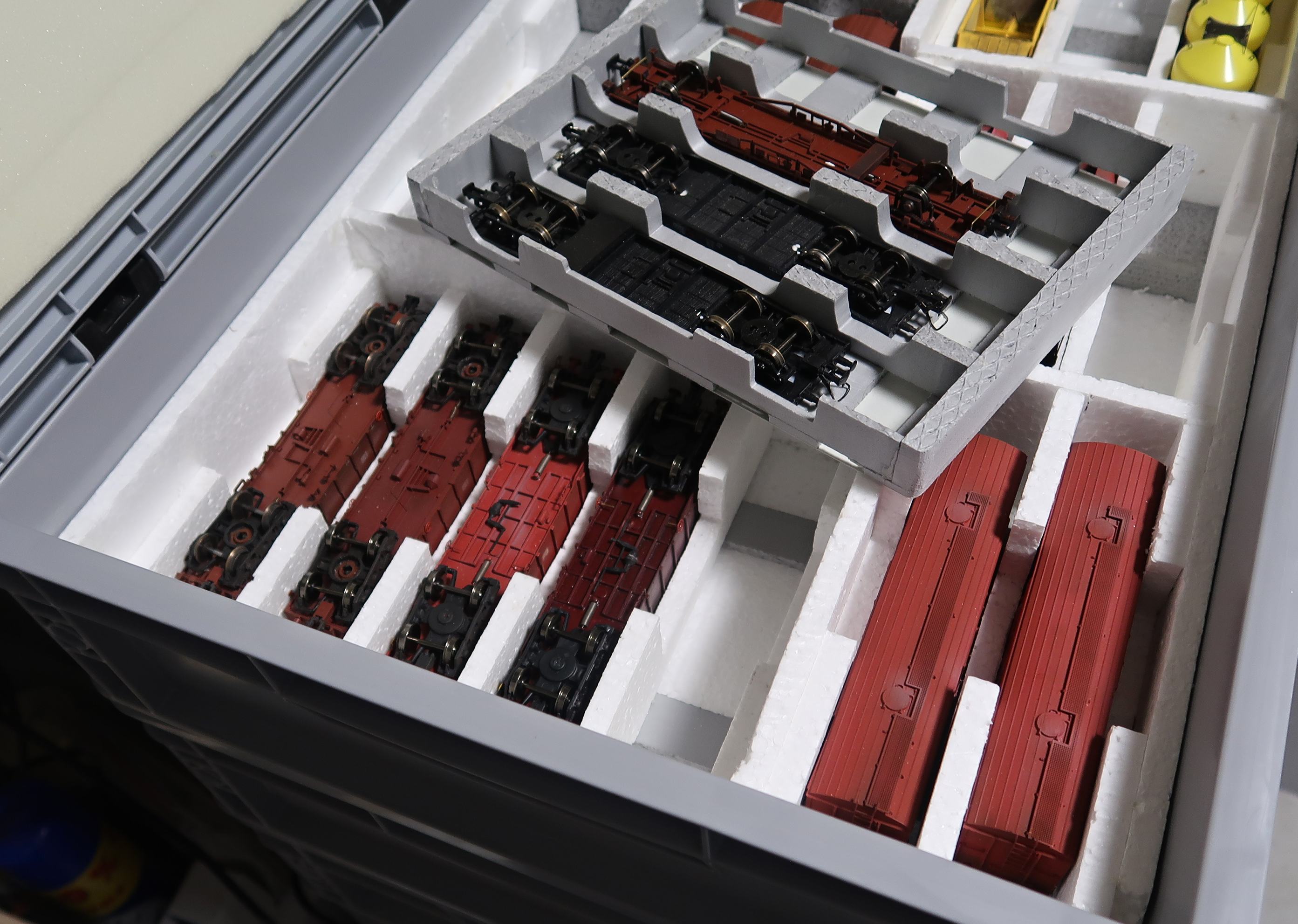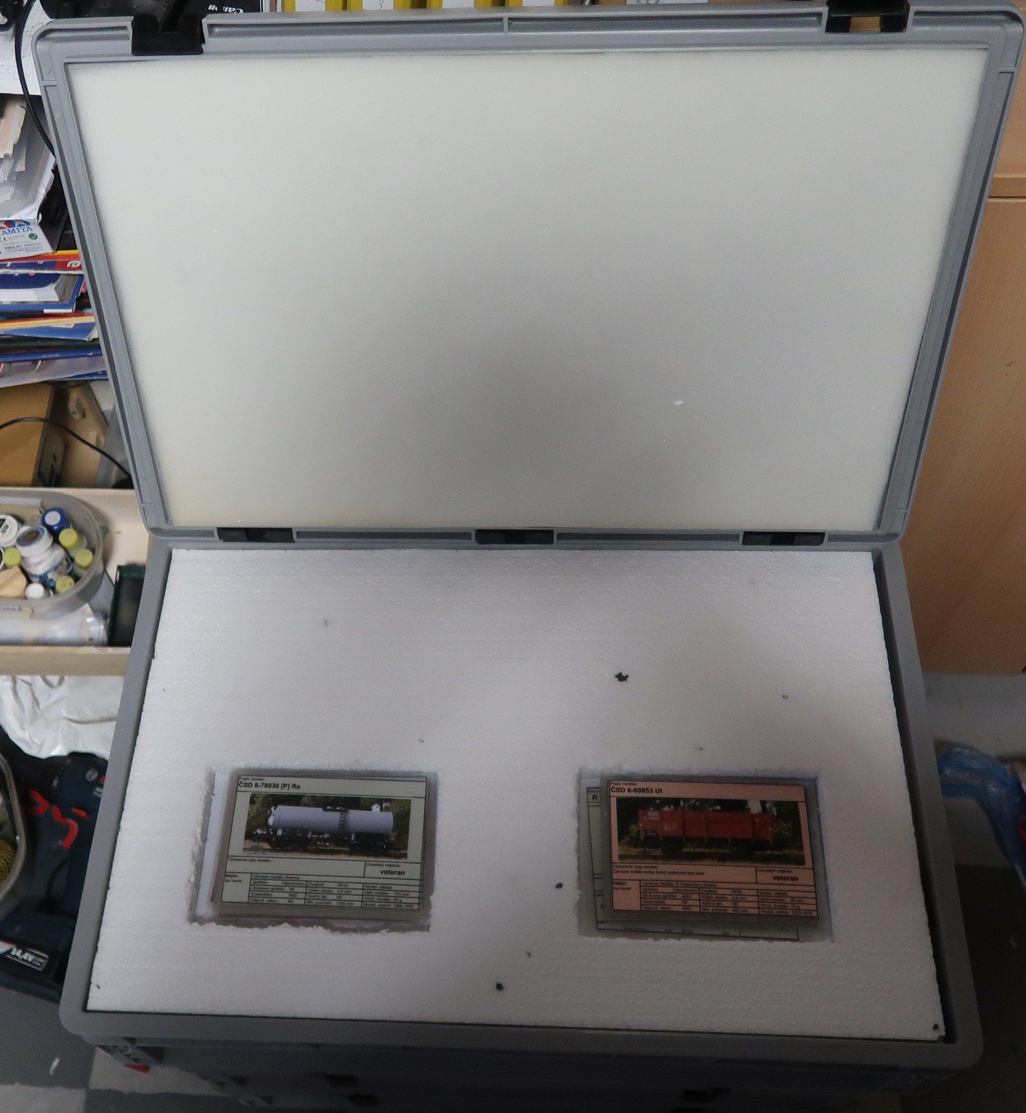 Vagónky jsou zadeklované vikem z polystyrénu tl.2cm. a zase molitan 1cm. Při uzavřéní bedny molitan jemně vtlačí se do vagónku a tím je zafixuje.