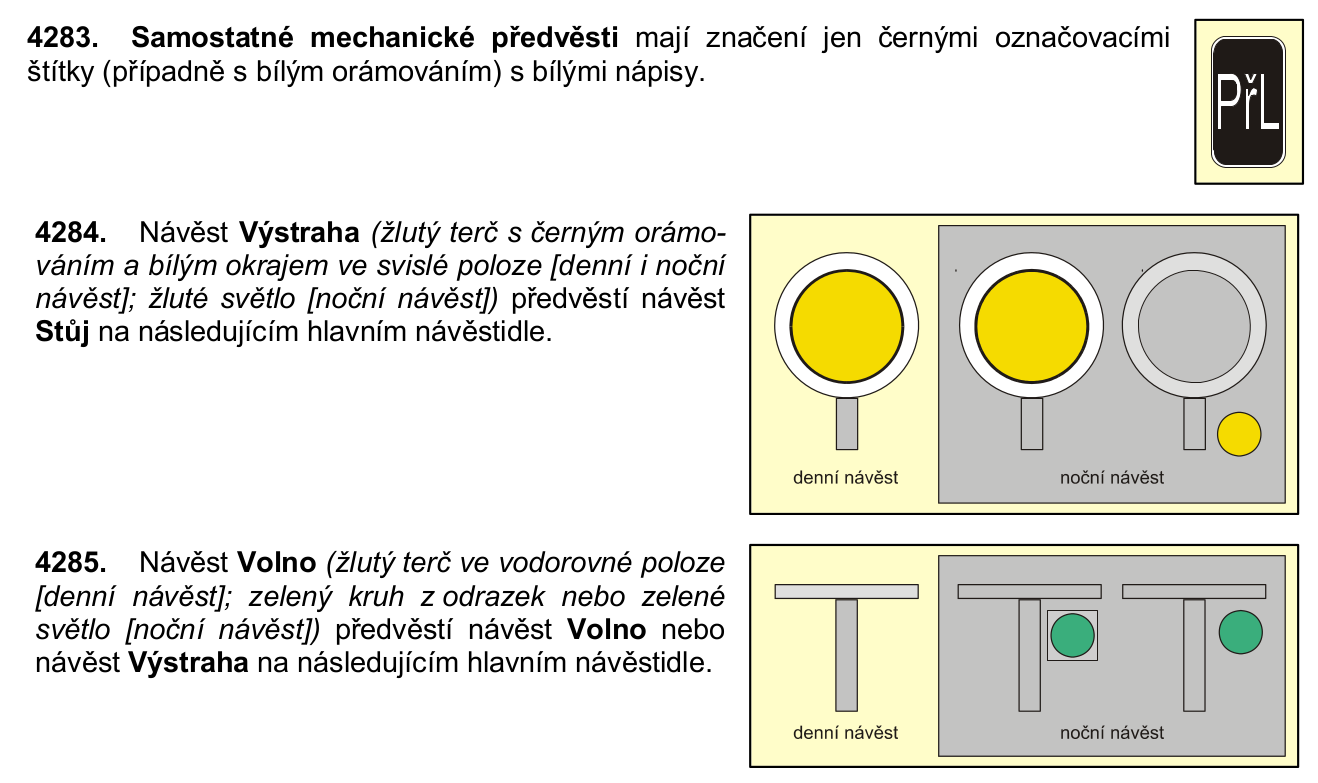 Je krásné, jak předpis D1 myslí na možnou nezaměnitelnost žlutého terče v dopravě s mechanickou předvěstí. Mechanická předvěst, jakožto každé jiné nepřenosné návěstidlo totiž musí být řádně označeno... Takže pokud se podíváš na mechanickou předvěst do Kyjova ze strany od Vlkoše (a ze zrušené strany od Mutěnic) tak tam najdeš klasickou mechanickou předvěst, která je řádně označena a která díky poškození (můžeme tak klidně nazvat i demontáž lanovodu) plní článek 4284 a návěstí návěst výstraha, které je zobrazeno technickou částí mechanické předvěsti s odborným názvem žlutý terč. Pokud se zeptáš strojvedoucího co viděl, tak ti každý odpoví, že na předvěsti byla výstraha. Nikoliv, že tam byl žlutý terč...