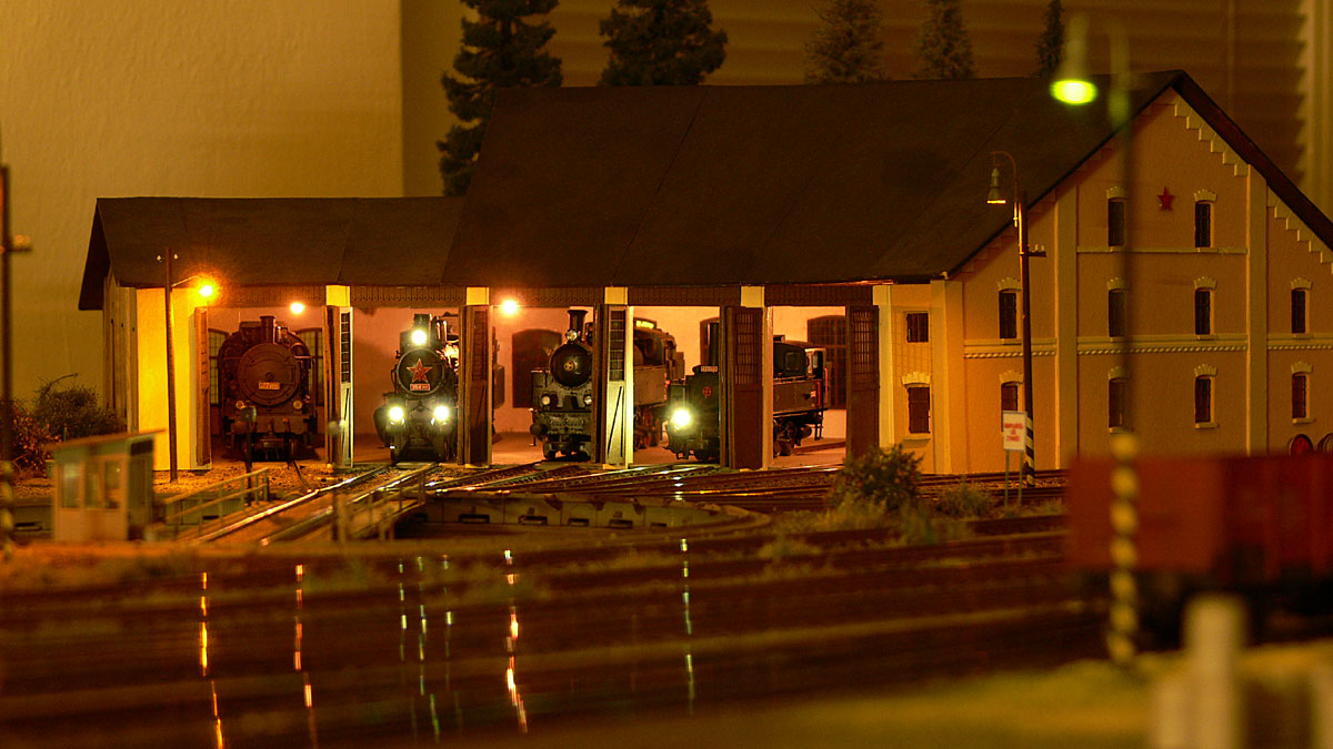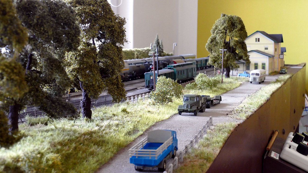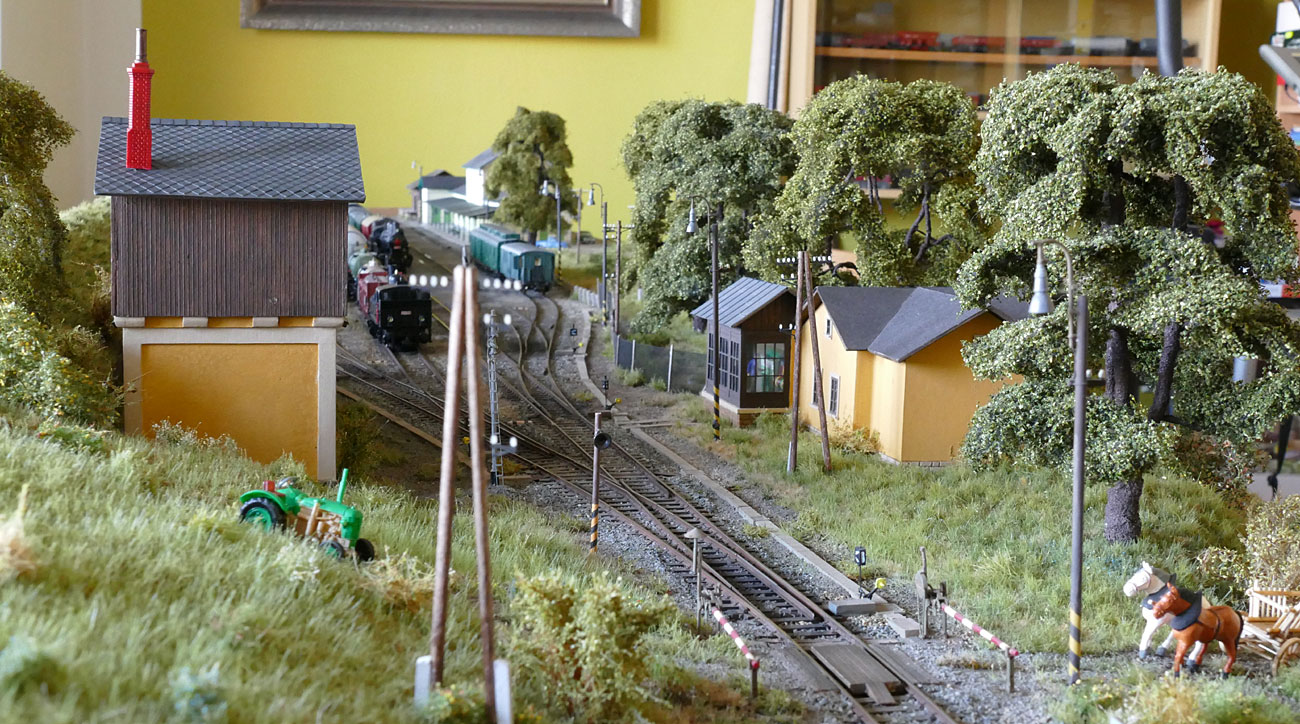 pohled z cesty za malou výtopnou, z hlediska rozložení je modulová stanice trochu jiná než skutečná - vložený 60 cm díl posunul staniční budovu o tuto vzdálenost od zhlaví proti skutečnosti a naopak jsou zkrácené vzdálenosti okolo skladiště