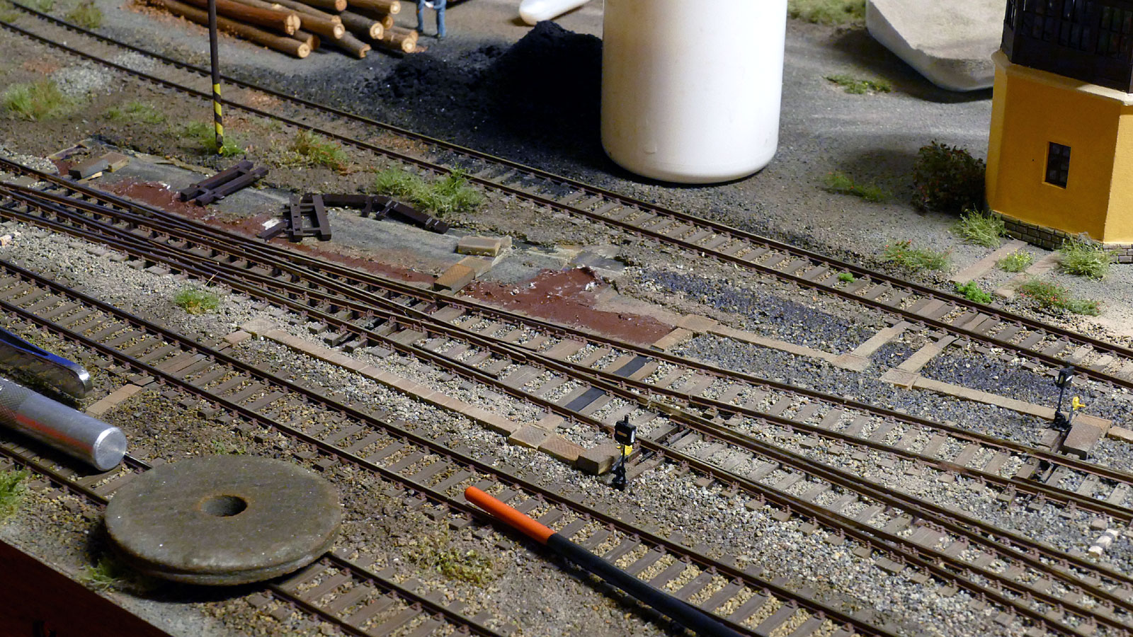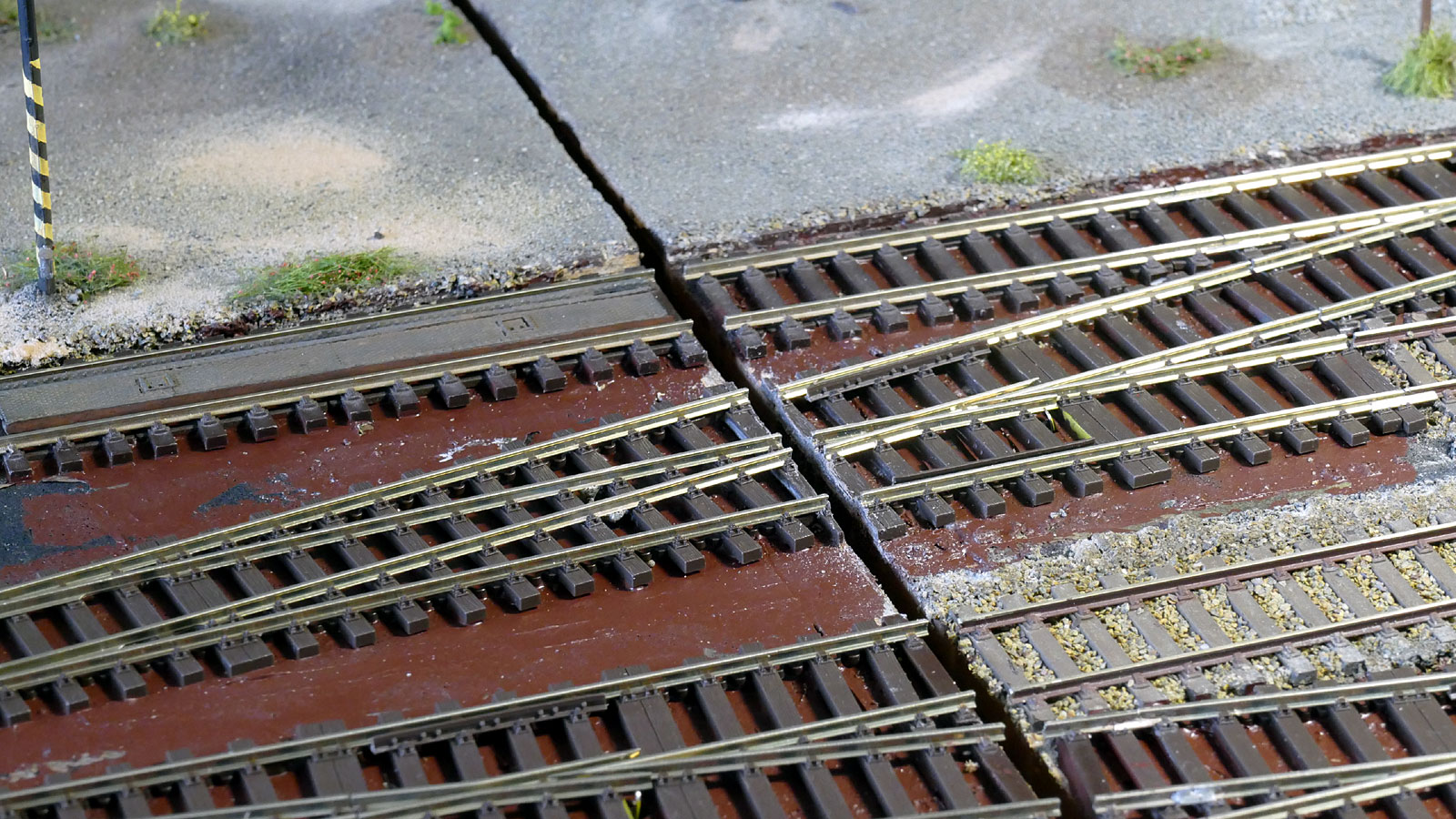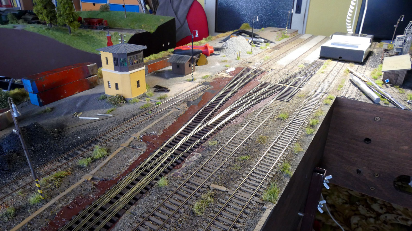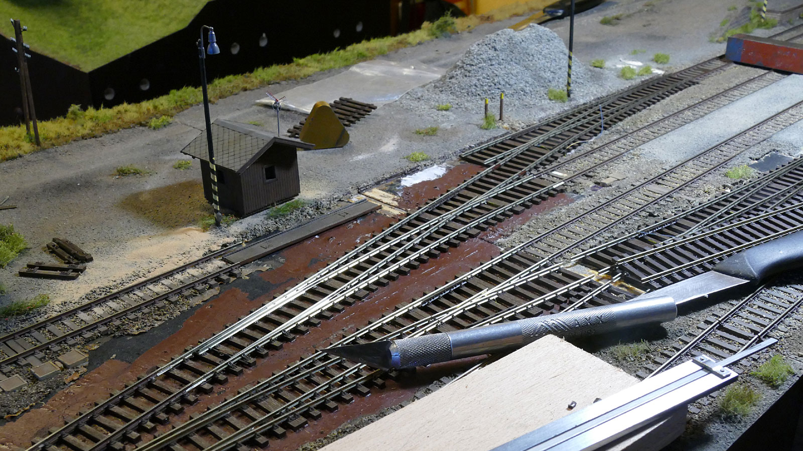 A vrátil jsem se z podzemí na "zem", vyměněno je 10 přestavníků Tillig. Začalo doplnění kanálových tras - používám "původní", mám i náhradní díly. Jsou to odlitky, dnes jsou pěknější JM Detail, ale střídání různého provedení by nedělalo asi dobrotu. Na fotkách je možné sledovat jak postupně přibývá zaštěrkovaných kolejí a úpravy okolní pláně. Některé části jsou ještě mokré nezaschlé.