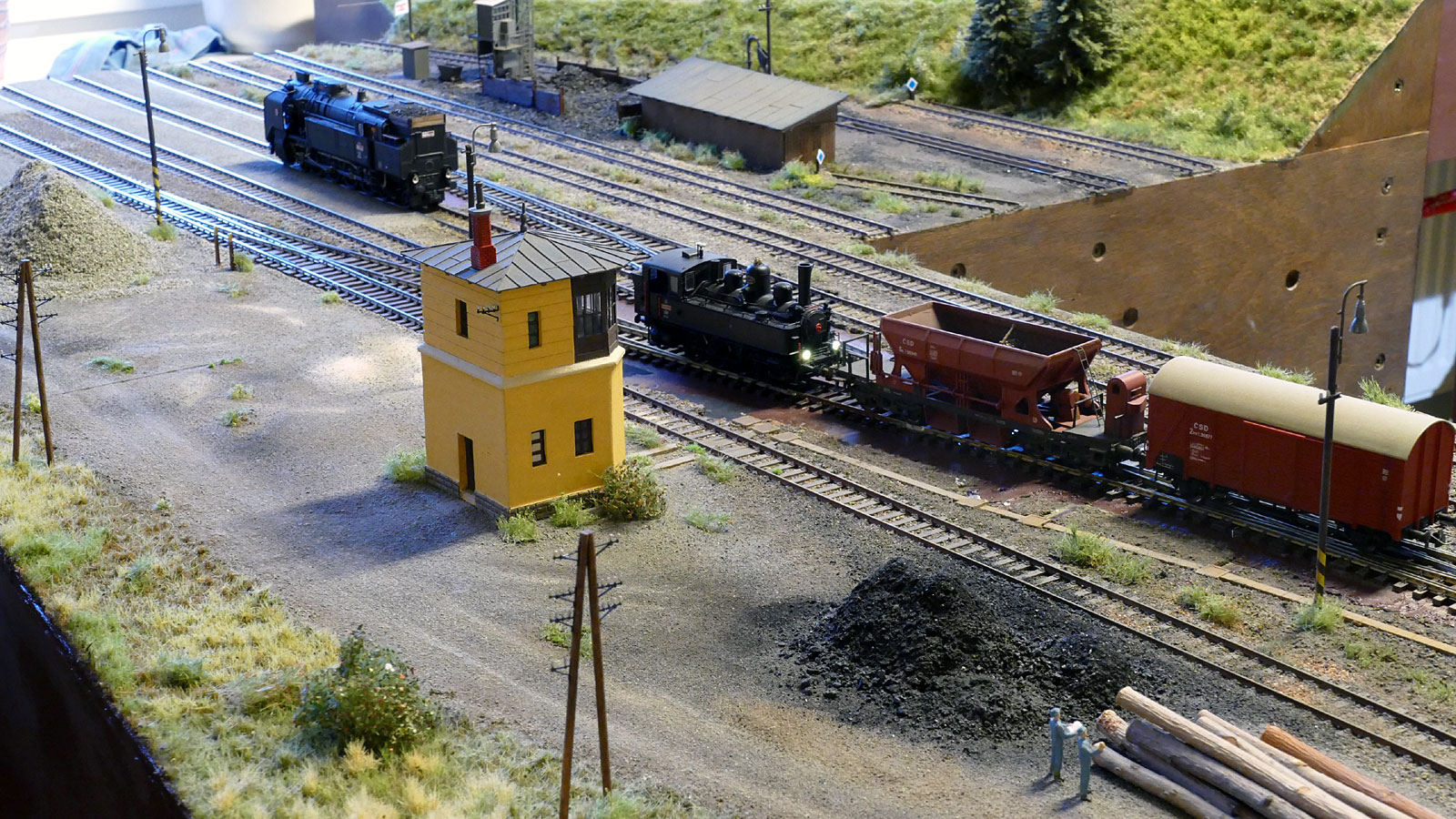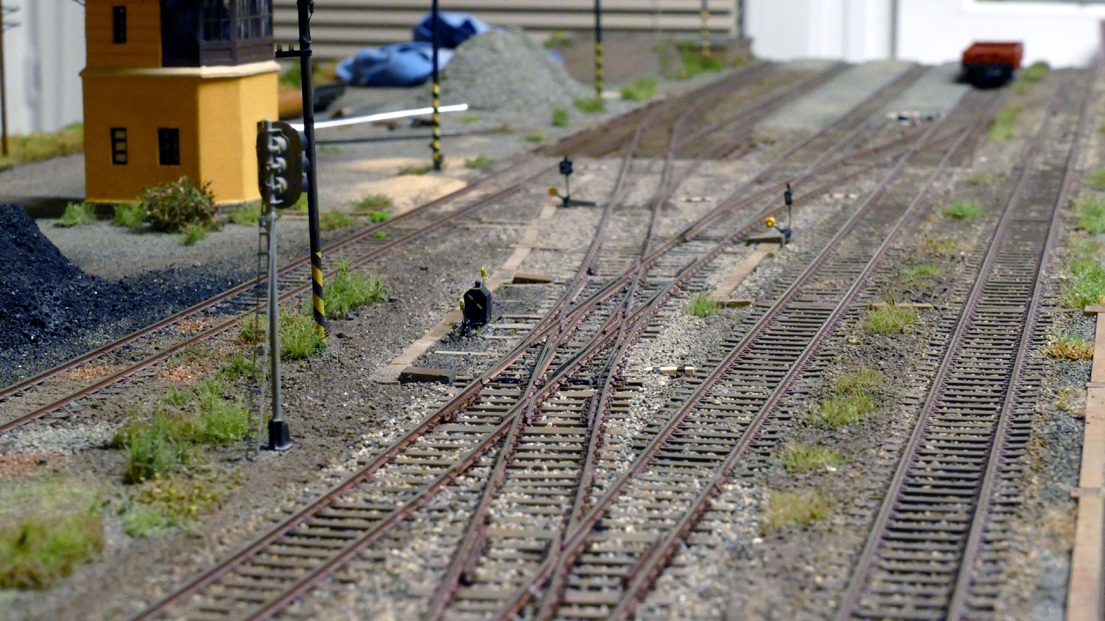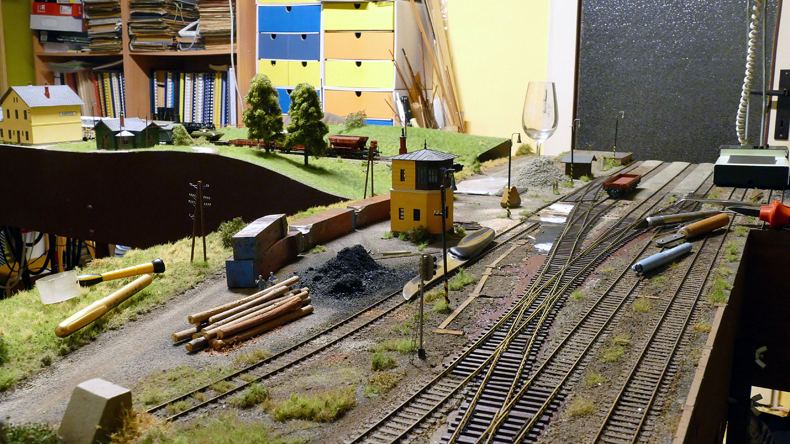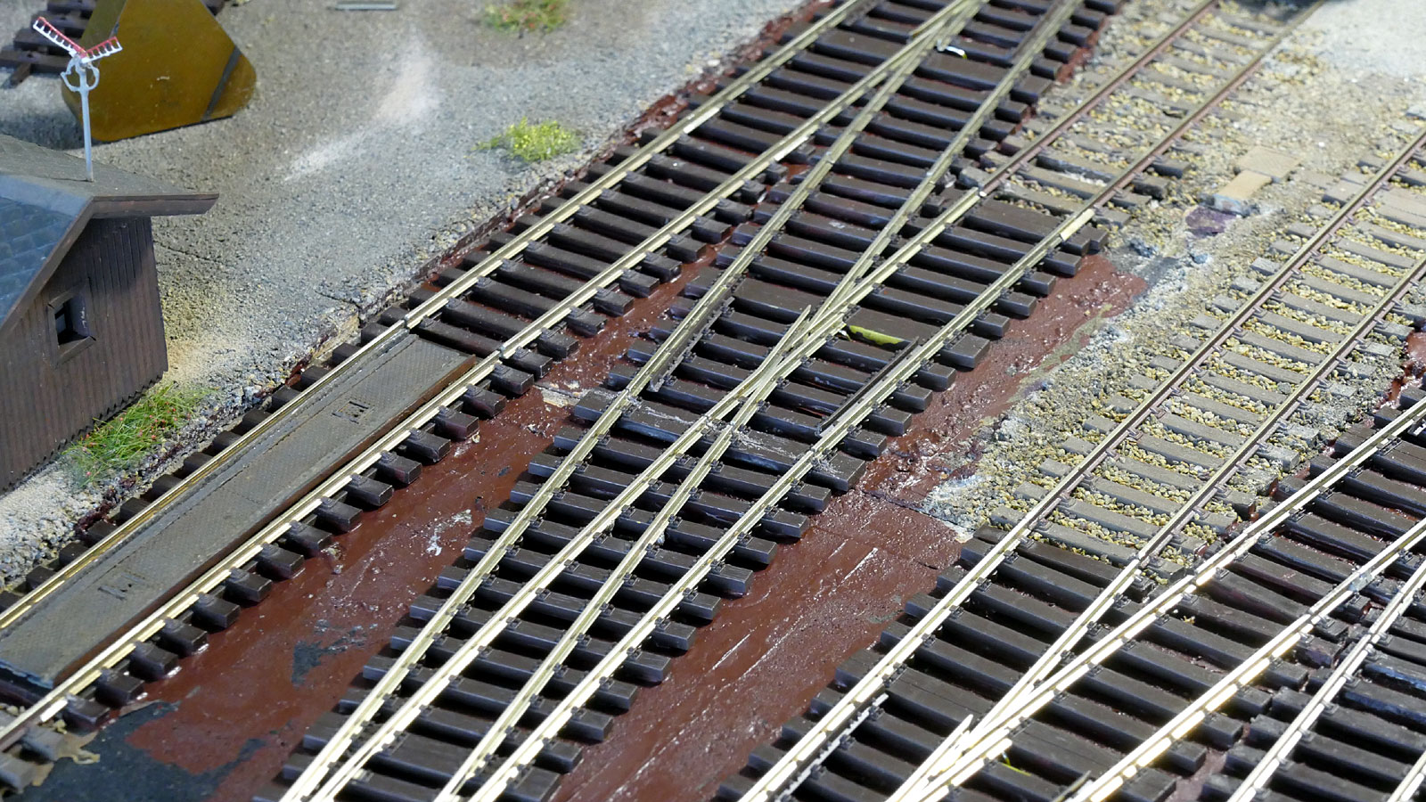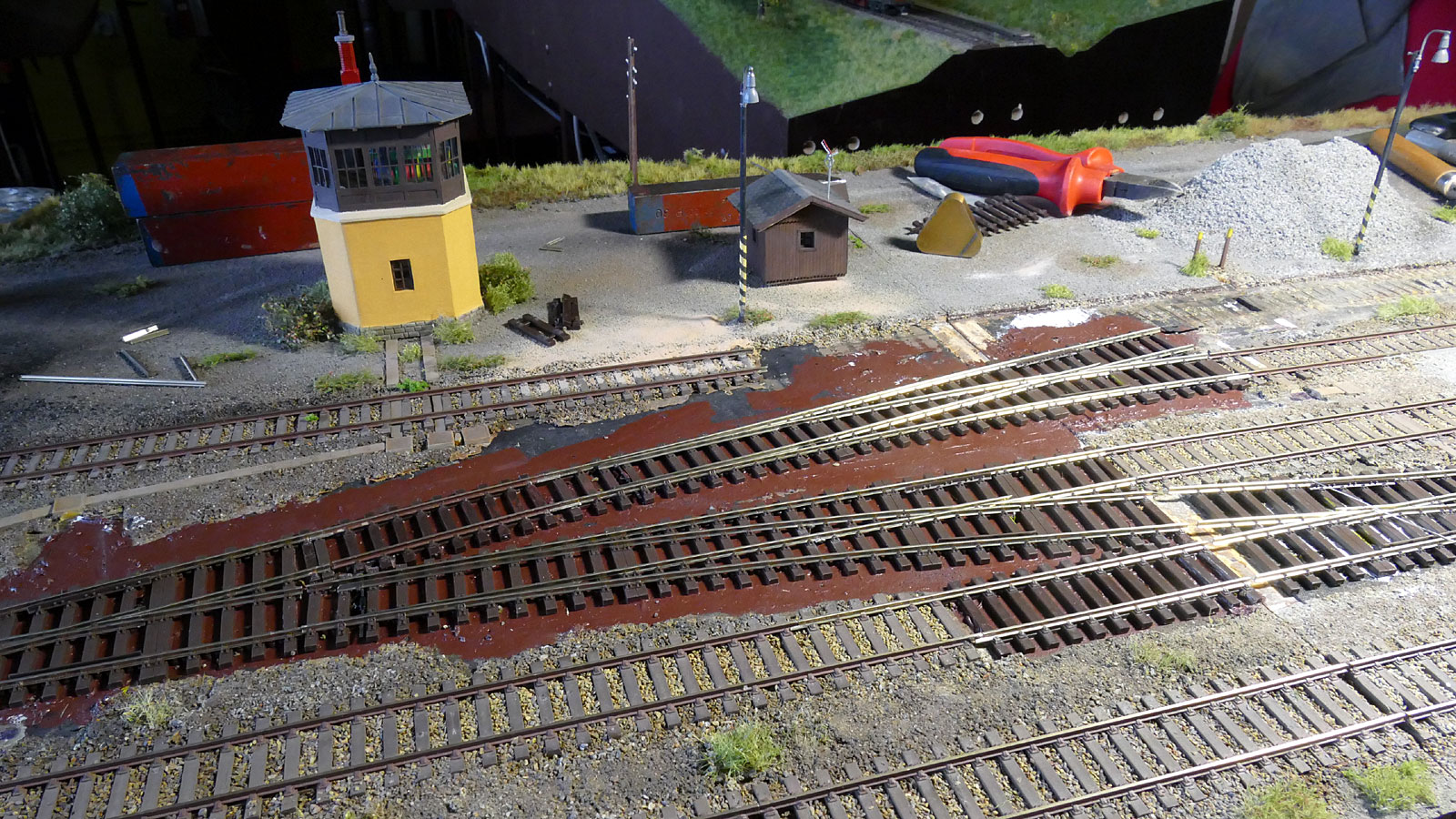 A vrátil jsem se z podzemí na "zem", vyměněno je 10 přestavníků Tillig. Začalo doplnění kanálových tras - používám "původní", mám i náhradní díly. Jsou to odlitky, dnes jsou pěknější JM Detail, ale střídání různého provedení by nedělalo asi dobrotu. Na fotkách je možné sledovat jak postupně přibývá zaštěrkovaných kolejí a úpravy okolní pláně. Některé části jsou ještě mokré nezaschlé.