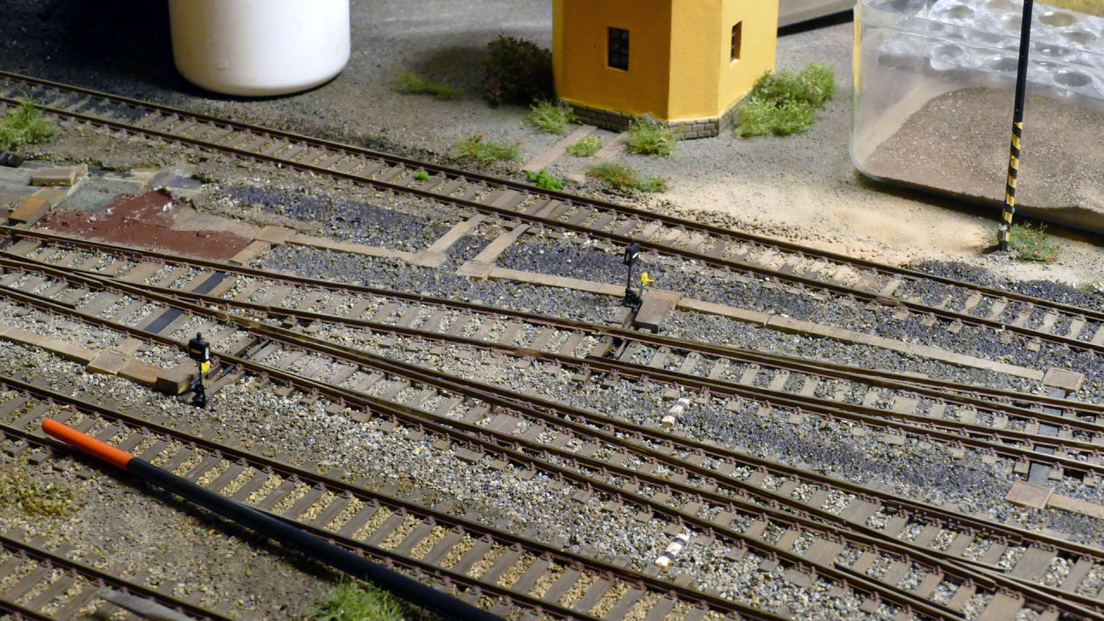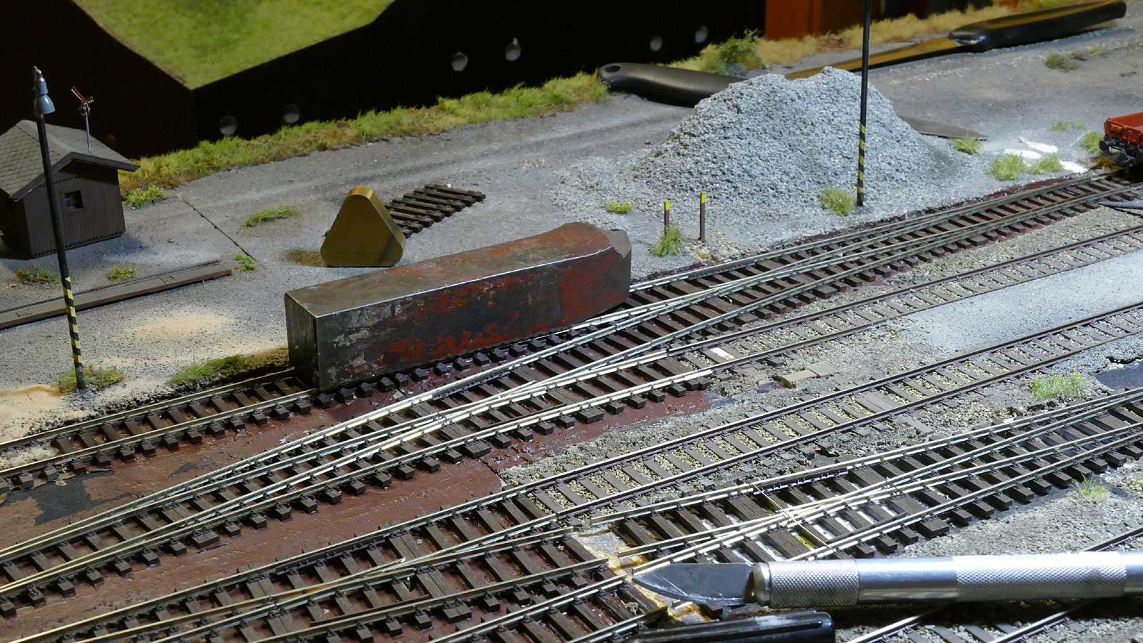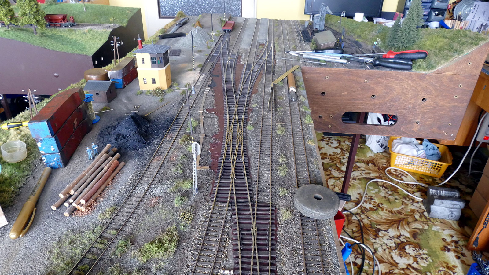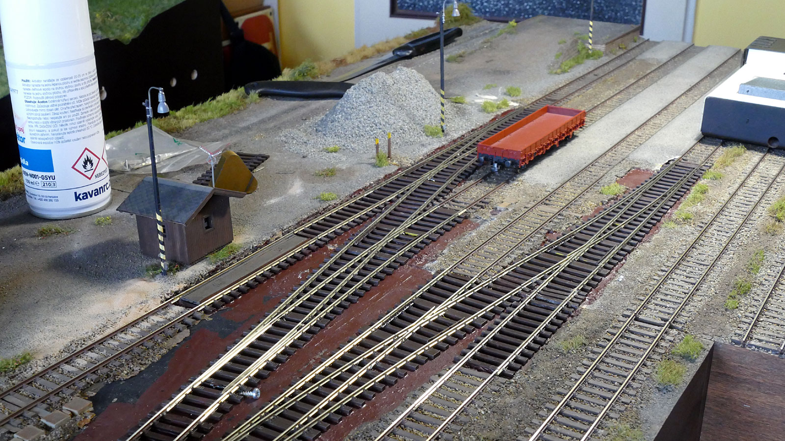 tady je už celkově "dosypáno", něco ještě mokré, po kolejišti se různě válejí různé odřezky.... bude teprve uklizeno, taky bude opraven nátěr kolejnic, nebo spíše dokončen, ve výhybkách to nejde jednoduše a tady jsem nikde nestříkal. Angličan je pěkný, ale vždy je otázkou zda je cena adekvátní :-) to se musí zodpovědět každý sám.