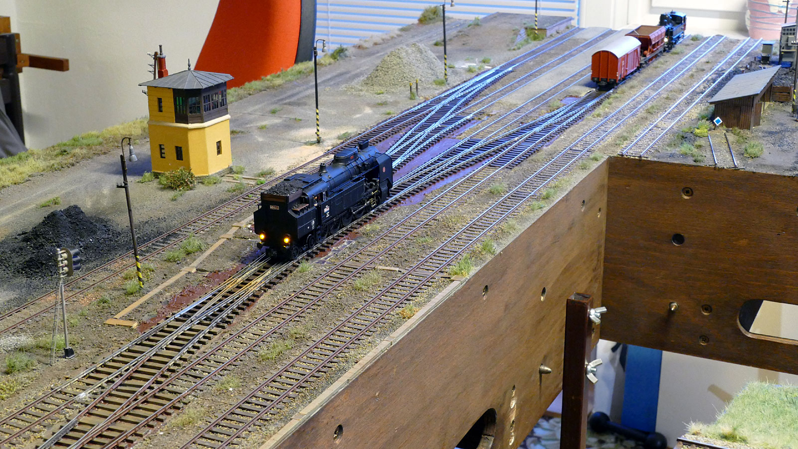 Ale zpět k Lipové - úprava zdroje jen na 5 a 12V ss byla provedena, zatím v původním "obalu". Bylo dosazeno pod díly "D" a "E" 7 přestavníků MP1 a zapojeno do stávající kabeláže, provedena drobná úprava zapojení, protože u přestavníků Tillig byla využívaná vlastnost postupného stavění výhybek, ta se musela vyřadit. Zcela nová kabeláž DCC pod díly k nově položeným výhybkám - kolejnice + srdcovka, logicky zapojeno shodně s původním řešením. Po odstranění několika chyb bylo zapojení odzkoušeno, díly spojeny, zapojeno DCC a ověřena sjízdnost vlastní silou hnacích vozidel.