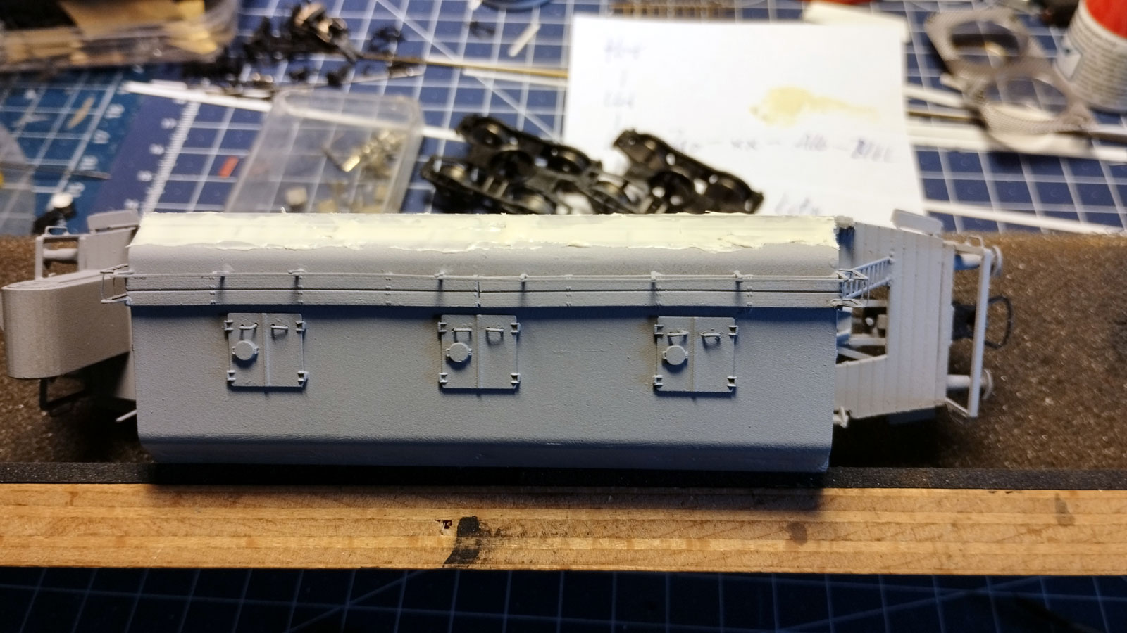 Nakonec mně to nedalo a "žeber" na střešní nástavbě jsem se tmelením a broušením zbavil. Zase jsem model trochu více posunul k skutečnému obrazu vozu. Důvodem byla taky nutnost přetmelit spáru mezi dílem střechy a skříní vozu, což se bez přetmelení "žeber" dělalo velmi obtížně.