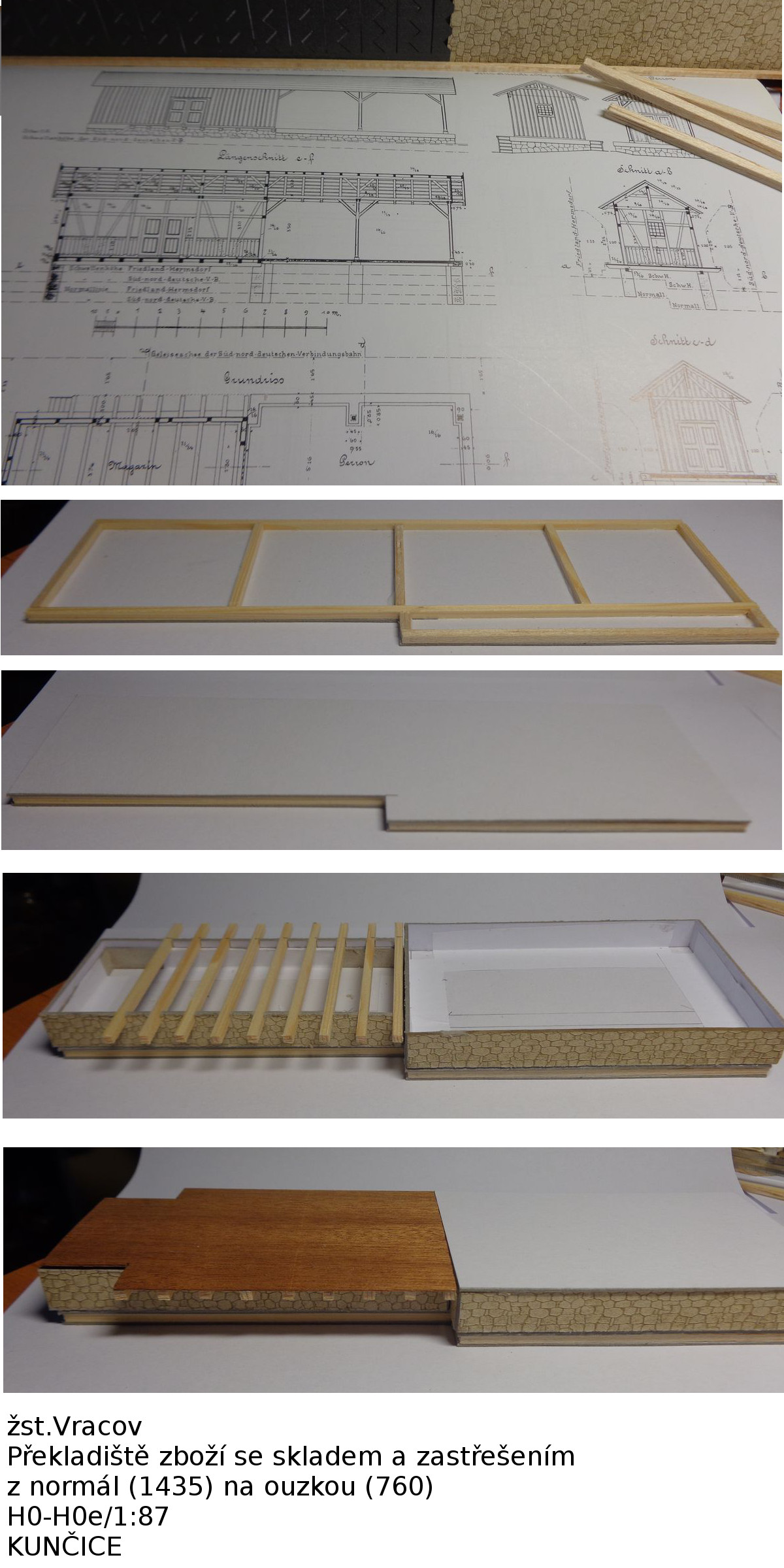 prostor mezi osy kolejí ouzké a normál je 201 mm,ale musel jsem použít podklad výkresu staniční budovy typ 15/H z normálií "Dolnokraňské místní dráhy" (Kunžak,Střížovice,Osoblaha).Posunout kolejovou spojku s překladištěm více doprava a podvalníkovou jámu přeložit na třetí díl modulu stanice.Užitná délka dopravní koleje na ouzké 1000 mm a normál cca 2 x 1750 mm.