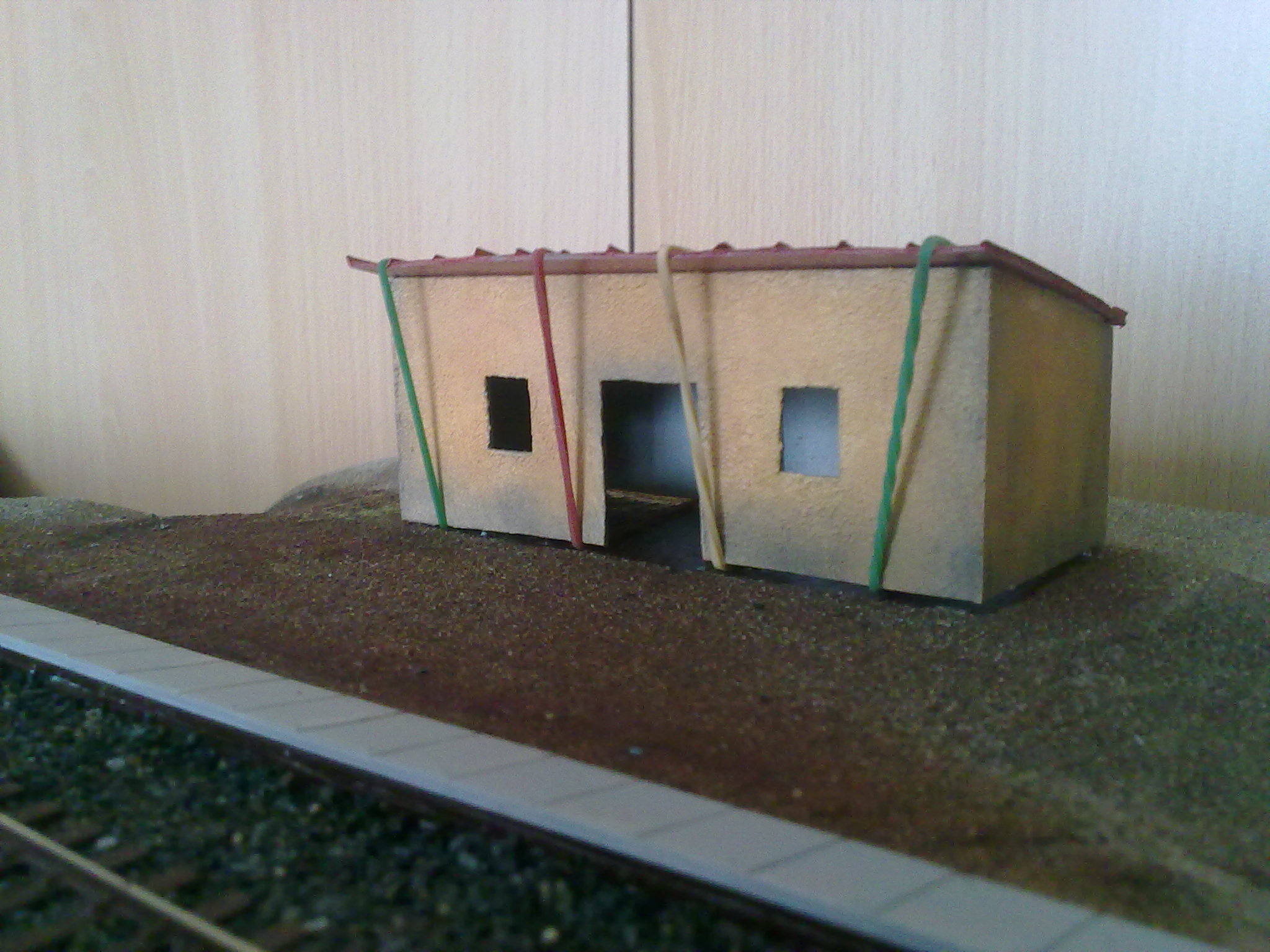 Dále jsem postavil obvodové stěny přístřešku zastávky. Je to vymyšlená budova, kde uprostřed je vstup a po stranách má dva otvory. Okna ani dveře zatím neplánuji, bude tam „táhnout”. Rozměry jsem si taky vycucal z prstu. Ostatně, u nás není téměř nic dle reálu, tak nač si lámat hlavu... Pohnul jsem se s nástupištěm. Dotesal jsem z plastové destičky zbytek panelů, které musím nabarvit a usadit. Díval jsem se, že Cipísek má rozměry jednoho panelu 10 x 15 mm. Což je dobré, jelikož já taky. Do příštího setkání bude hrubá stavba hotova.